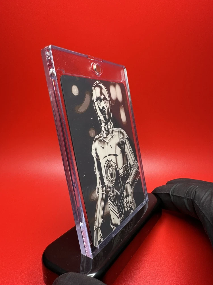 NEXUS MINT Presents - C-3PO 1 oz .999 Fine Silver Card (1 of 1) We are thrilled to announce a significant enhancement to our image resolution for our laser engraving process. Our dedicated team has pushed the boundaries of innovation to deliver a product that exemplifies sophistication and precision like never before. Prepare to be amazed as our laser engraving technology now boasts an extremely high resolution, ensuring every intricate detail is captured with stunning clarity. Each Nexus Mint Silver Card is a masterpiece, meticulously crafted from the finest .999 pure silver and engraved with a level of detail that will leave you in awe. Introducing our latest innovation: the Reverse Side Boast with a stunning "Frost Silver finish". After extensive testing and development, we are proud to present the new frost texture that takes our craftsmanship to astonishing heights. This addition showcases our commitment to excellence and luxury. The reverse side is meticulously engraved with essential details, including the Nexus Mint logo, weight, purity, and an exclusive mintage. This unique feature ensures that each piece is truly a one-of-a-kind art piece. What sets our silver card apart is the innovative and advanced laser engraving process employed, representing the pinnacle of our craftsmanship. This cutting-edge technique allows us to capture and replicate images with unparalleled clarity and finesse, surpassing traditional methods and setting a new standard in precision engraving. Whether you're commemorating a special occasion, gifting a luxurious keepsake, or adding to your collection of precious metals, our Nexus Mint Silver Cards are the epitome of elegance and quality. Expect nothing less than perfection as you hold a piece of art in your hands, reflecting our commitment to excellence and your discerning taste. Elevate your collection today with the Nexus Mint .999 Fine Silver Cards – where every engraving tells a story of precision and beauty. Don't miss out on experiencing the pinnacle of laser-engraved silver cards. Order now and see the difference for yourself! Card Highlights: - Metal content: .999 Fine Silver - Approximate weight: 1 oz ( However, the weight of each card may vary slightly due to material being removed in the laser engraving process.) - Dimensions of the card: 2 1/2 x 3 1/2 - 0.02 Inches (0.51mm) thickness - Exclusive mintage: 1 - Packaging includes: C-3PO 1 oz .999 Fine Silver Card (1 of 1) Ultra clear slab to handle and showcase the fine silver card (35pt card) (SEALED) One-Touch stand to display the fine silver card Trading card protectors Bubble wrapped At Nexus Mint our top priority is our customers. We are dedicated to ensuring that every customer service experience we offer is second to none. Our business is built on the premise of community engagement. We therefore thrive to promote and maintain an interactive environment that facilitates positive relationships with our customers. We hold our products to a high standard and each product must satisfy our quality assurance test. For us every single detail matter, from packaging to the production of the actual fine silver card. We aim to produce products that are innovative, timeless and of high quality. We're always happy to help! for questions regarding your order please don't hesitate to ask. Count on Nexus Mint for all your premium, fine silver and gold cards, bars and coins.