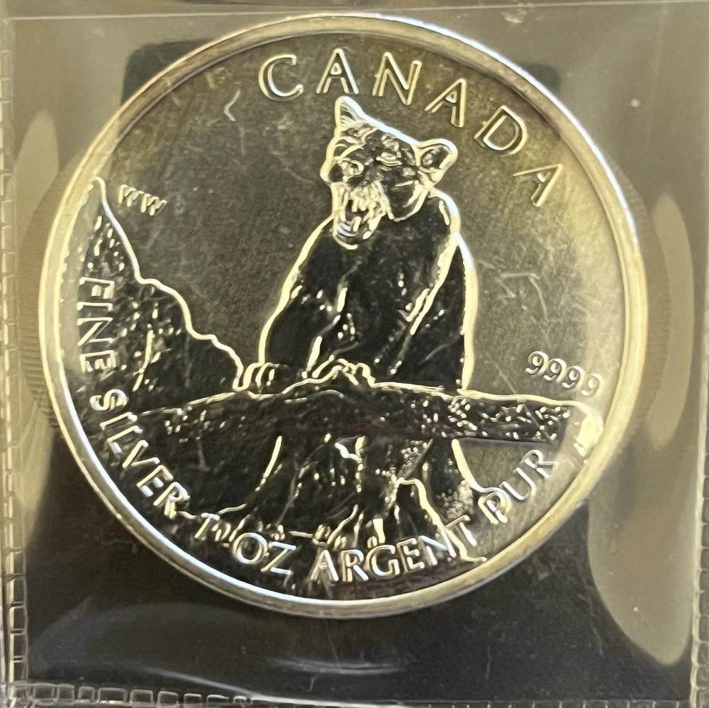 This 1 oz .999 fine silver coin from the 2012 Canadian Wildlife Series features a design of a Cougar. It was minted by the Royal Canadian Mint and has a face value of $5. The coin does not have a certification and is sold as uncertified.