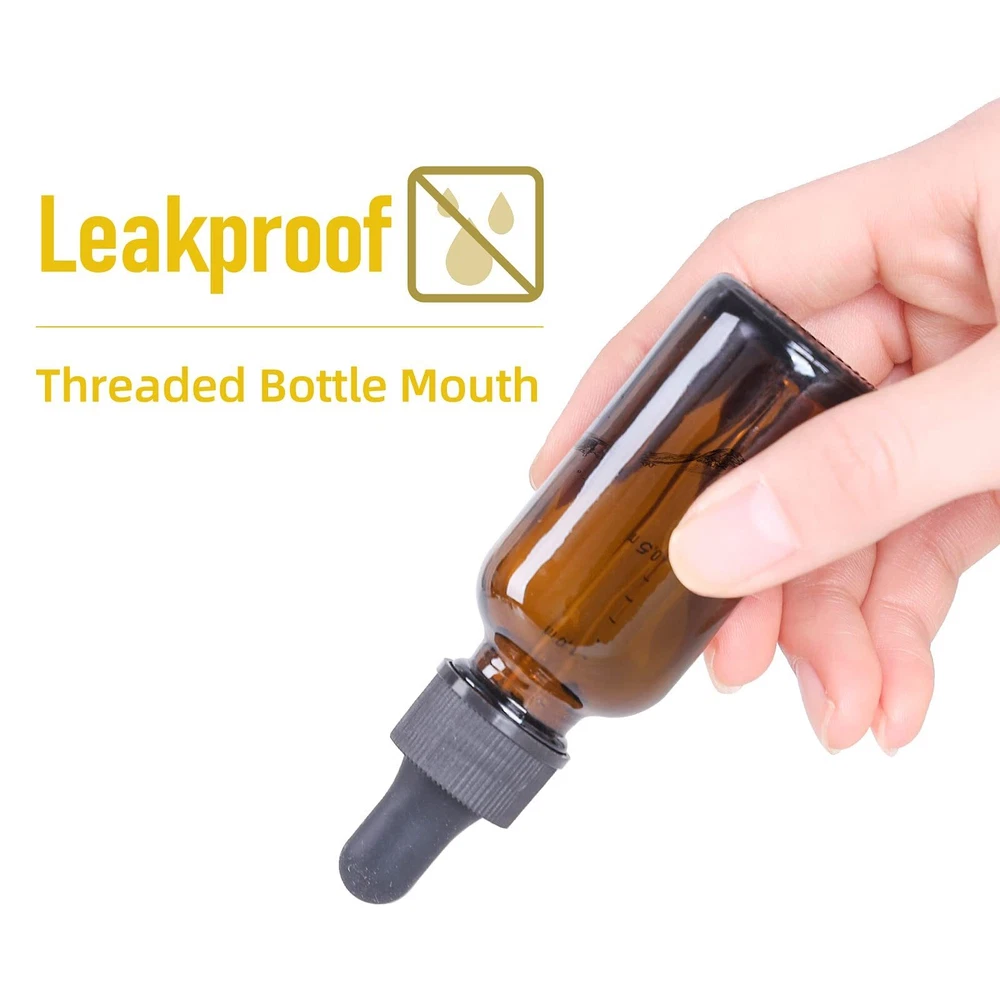 Elegant, concise 1 oz amber glass bottle. The colored glass dropper makes dispensing liquids easy and mess-free. Beautiful colors make a perfect display. Amber glass protects the bottle's contents from the effects of UV light. The dropper bottle is made of polyethylene, non-toxic and odorless, with good stability, and can withstand most acid-base erosion. Ideal for essential oils, massage, colognes, perfumes and beard oils, natural tinctures, vape juice, and liquid medications. Package handmade gifts of flavorings, extracts, liquor, vanilla, homemade remedies, and medicine. Recyclable, reusable, refillable Boston bottle perfect for kitchen, home, or lab use. Material: Glass Color: Amber/Black/Clear Size: Diameter: 1.6 inch Top Diameter: 0.9 inch Inner Diameter: 0.5 inch Height: 3.7 inch Capacity: 1 oz/2 oz Package: 2 pack/6 pack/12 pack/24 pack/48 pack; 1 oz/2 oz amber Boston bottle with cap Design: cylinder Boston glass bottle. Easy clean: Hand wash or dishwasher Value Eye Droppers Set: 48 pack 1oz (30ml) amber glass eye dropper bottles. Bottles are packaged in grid-shaped partition and thick carton boxes to prevent damage to transport UV Resistaant: The glass bottle is made of corrosion-resistant amber glass and will effectively filter out harmful ultraviolet rays. each with quality tapered-tip glass droppers, and thicker to prevent breaking easily. Our Bottle is BPA free and lead-free, non-toxic and odorless, with good stability, and can withstand most acid-base erosion Secure & Leak-Proof: The screw thread finish bottle mouth is matched with a black cap, which fits tightly and can effectively prevent any liquid leakage, dropper bottle can be used to dispense liquid, easy to carry out Multi Uses: Great for DIY essential oils, colognes, tinctures, cosmetics, perfume oils, beard oil, hair oil, or other liquids. The eye droppers allow for the perfect amount of product to be used every time. The convenient size makes it perfect for travel in bags as the Leak-Proof covers. You can travel with liquids for daily eye, face, and body care Easy to Use: The dropper holder is made of rubber that conveniently enables you to fill in essential oils and make your own essential oil blends for massage, hair salon, aromatherapy, and enjoys your precious relaxing moments