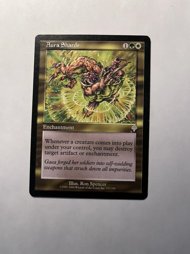 Dive into the world of Magic: The Gathering with the "Aura Shards" card from the Invasion set. This rare card is a must-have for players and collectors alike, offering strategic gameplay options and a touch of nostalgia. Printed on standard-size card stock and finished with a regular matte finish, it's a classic addition to any deck or display. "Aura Shards" comes in English and retains its vintage charm, a testament to the timeless appeal of the MTG franchise. Manufactured by Wizards of the Coast, this card is a true piece of gaming history. Whether for play or collection, it's an enchanting piece that captures the essence of the game. HAVE A STOCK OF 8, EACH CARD WILL LOOK SIMILAR IF NOT BETTER THAN CARD PICTURED !