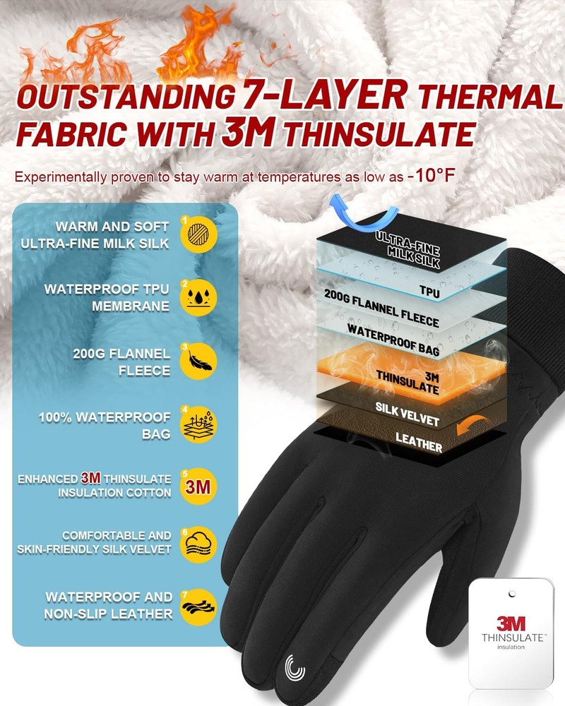 7-layer Thermal Fabric with 3M Thinsulate: 7-layer insulation makes these thinsulate gloves men women the ultimate choice against extreme cold( Above -10℉). Add more 3M materials compared to other gloves for cold weather, significantly enhancing insulation. The insulation performance of 3M is 1.5 times that of down and twice that of other insulation materials. Even in damp conditions, it continues to effectively insulate without causing sensitivities Three-layer Waterproof Design, 100% Waterproof and Windproof: Mens winter gloves waterproof insulated built-in a premium waterproof bag! Palm and back crafted from waterproof leather and high-quality nylon for true wind and waterproof performance. Even when immersed, heated gloves won't leak, ensuring you stay protected from the elements while fishing, cycling in the rain, shoveling snow, or working. No more worries about wind penetration or cold, damp hands Highly Sensitive Leather Gloves with Ten Touchscreen Fingers: Each finger of our winter motorcycle glove is designed with touch-sensitive materials, providing a sensitivity 5 times greater than regular gloves. Never worry about sensitivity fading over time! Additionally, the leather fabric is not only stylish and sophisticated but also boasts outstanding non-slip and wear-resistant features, no need to worry about silicone peeling off like other winter cycling gloves Ultra-comfortable Ergonomic Design: Utilizing advanced pre-curved design to ensure a perfect fit with your hands, providing an outstanding sense of comfort. Unlike other thermal gloves men and women, our gloves lining have undergone careful material selection and multiple modifications to prevent discomfort caused by lining from sliding and protruding seams. Choose our ski gloves to experience both super warmth and a non-bulky feel Super Elastic Wrist + Outstanding After-sales Service: The wrist section is made with an extra-large elastic ribbed material, increasing elasticity by 40% and effectively preventing the invasion of cold winds when paired with the wrist's flexibility. Whatever the issue, please reach out to us first, and we assure you a satisfactory resolution with returns and exchanges