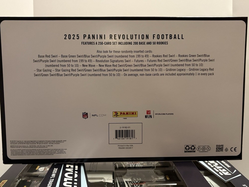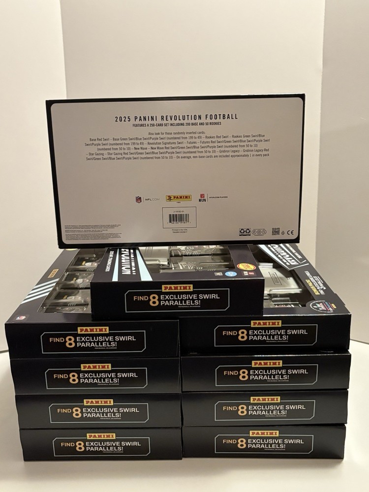 The 2025 Panini Revolution Football Bundle Box is a set of 8 sealed trading card packs featuring players from the National Football League (NFL), along with one bonus pack containing 3 numbered parallels. Manufactured by Panini, the boxes contain sports trading cards from the 2025 season. This is the debut of Panini Revolution for football. 10 bundle boxes will be included with this lot, totaling 80 regular packs and 10 bonus packs.