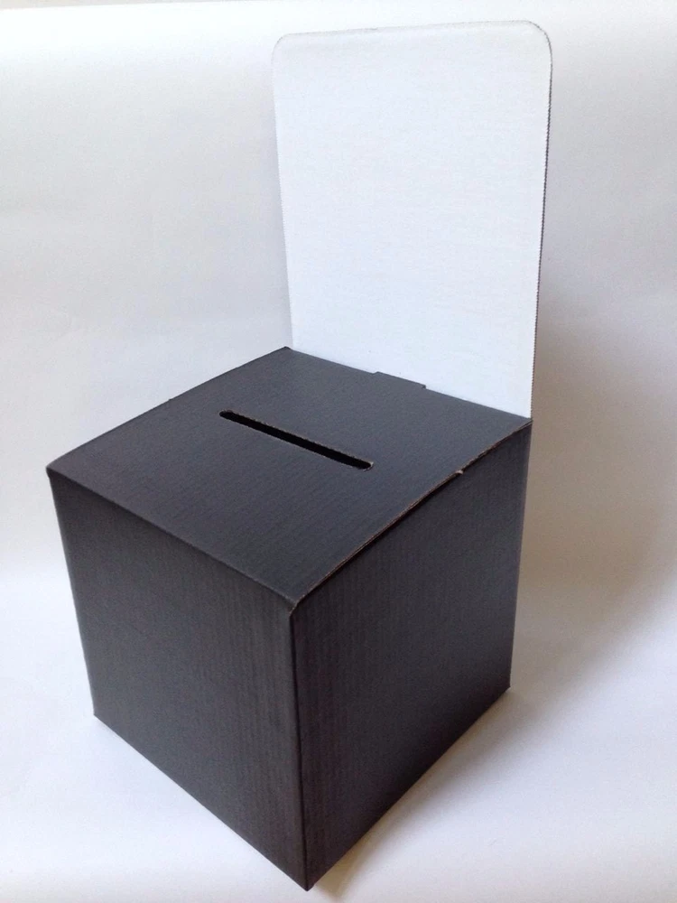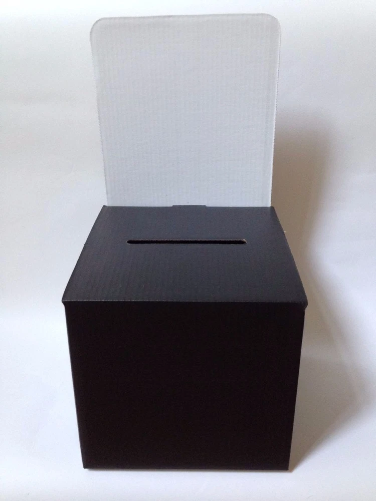 Pack of 10 Corrugated Cardboard Ballot Boxes, suggestion boxes, lead boxes - Black with White Header Card 10" x 10" x 9-10". Perfect for trade shows, school functions, marketing and many other uses. Can use with or without header card. Ships flat, folds together without tape.