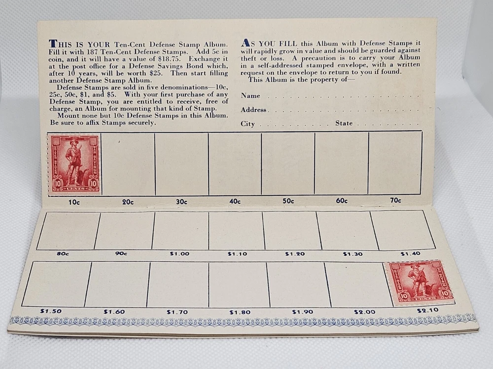 This album features an original 10 cent War Defense Stamps and is a must-have for any militaria collector. The album is a great addition to any collection of original period items and is a perfect way to honor the memory of those who served. The album is manufactured in the United States and is a nice find for any collector of militaria it has two crimson Minute Man 10 cent War Savings stamps on the first two pages. The album is categorized under Home Front, United States, Original Period Items, WW II (1939-45), Militaria, and Collectibles. Don't miss out on this opportunity to own a piece of American history. Local pickup Cape Coral area. FREE S&H!!!