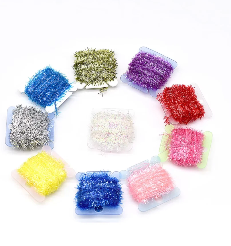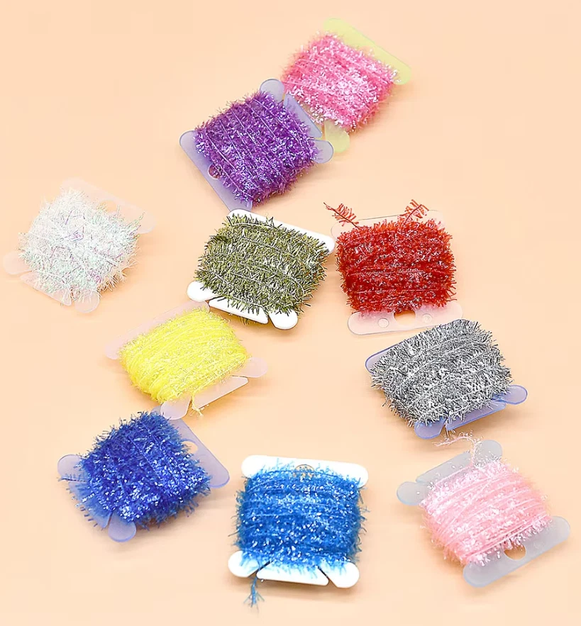Fly Tying Streamers, Body decorating, as flashabou etc. Specification: Length: about 10meters/card each color Chenille Width: about 7mm, 0.28" Total Length: 10 cards = 100 meters Chenille Colors: As following ( olive, blue, hot pink, rainbow, black, brown, green, red , etc. ), Components Included: 10 colors of it dispatching in random 10 Cards in a bag, total 100 meters chenille random assorted colors