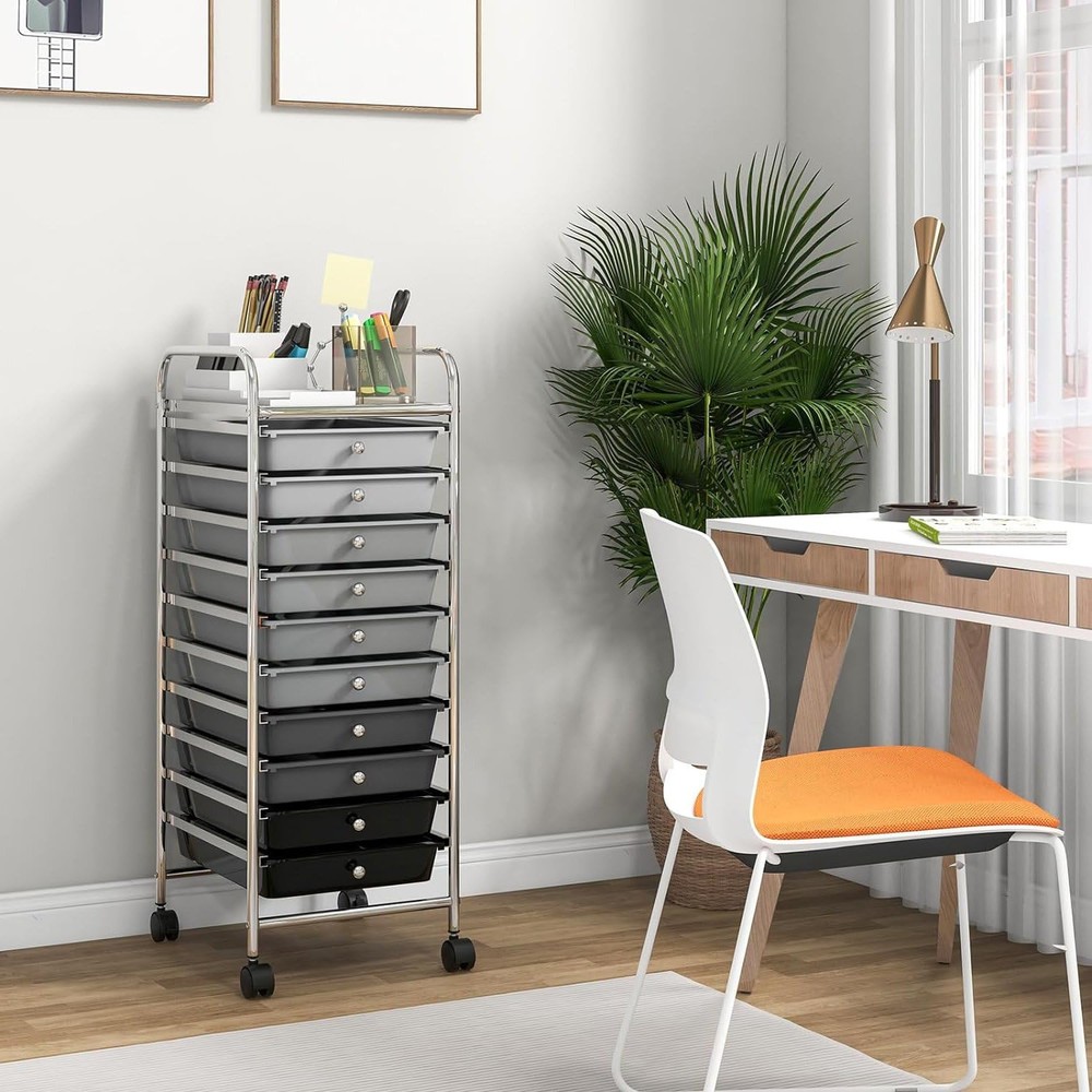 Description: Are you bothered by messy places? This 10 drawers rolling storage cart is the perfect solution for you! Our 10-drawer storage cart has 10 drawers, which provide enough storage space. It was made of chrome steel framed and plastic drawer organizer, which makes this 10-drawer rolling cart durable enough to serve for a long time. Equipped with 4 universal wheels that rotate 360, this home storage cart can easily be moved anywhere you need it. It will be a fancy complement to your office, barber , school, room, living room, bathroom, etc. ✔We can assure you that:No matter what questions you may have, you can send to us at any time. The reply will be sent within 24 hours. Features: Environmental, wear-resisting, and anti aging PP material ensures safe use Steel frame and plastic drawers, durable and can serve your for longtime 10 drawer storage cart providing plenty of space 4 universal wheels(2 with locks) for easy movement and fixation Sturdy steel frame for long lasting performance casters feature brakes to stop and fix it to where you want Colorful boxes good for storing items and decorating your living space Ideal storage box for home, office, barber , bathroom and school Specifications: Color: Black/Yellow/Clear/Rainbow/Multicolor Material: Steel+ PP Drawer Size: 15’’ x 11.5’’ x 2.5’’(L x W x H) Overall Size: 15'' x 13'' x 34'' (L x W x H) Net Weight: 9.5 lbs Package Includes: 1 x 10 Drawers Rolling Cart 1 x User's Manual ✨【10 Drawers for Sufficient Storage Space】: Featuring with 10 drawers, our 10 drawer rolling storage cart provides you with ample space to different categories of items, including makeup, children's toys, watercolor pens, tools, books, cards, snacks, etc. ✨【Wide Range of Usage】: If you want to keep your dressing area, bathroom, or children's room organized and neat, choosing our craft storage organizer cart with drawers will be a smart decision. It will be a fancy complement to your office, barber , school, room, living room, bathroom, etc. ✨【Ultra-Stable & Lightweight Construction】: Made of premium steel, this drawer storage trolley processed with smooth chrome finish to the sturdy frame and durable use. So, the whole frame is not easy to deform and can be used for a long time. Plus, it has a spacious top that can some frequently used items. ✨【4 Smooth Wheels for Better Mobility】: Equipped with 4 universal wheels that rotate 360°, this makeup organizer cart can easily be moved anywhere you need it. of the wheels are designed with lockable brakes to keep it still in a certain position, which help you cope with various situations. ✨【Colorful Decoration & Easy Installation】: Coming with detailed manual, the colorful drawer cart can be assembled well in short time. ⭐Tip: If your plastic drawers are damaged during transportation or have other problems, please our and we will give you satisfactory solutions.