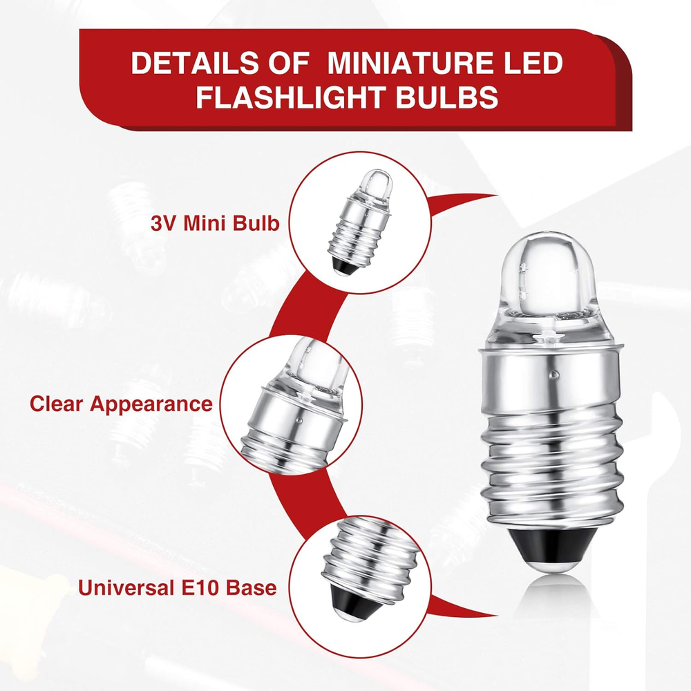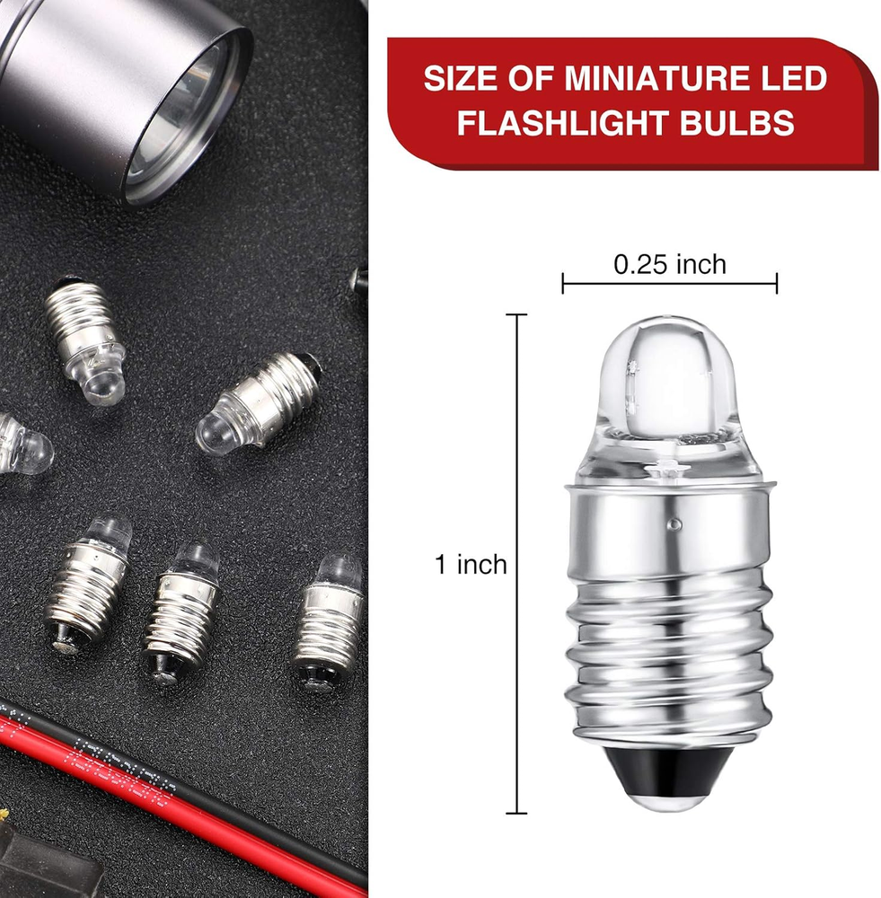 10 Pieces E10 LED Bulbs 3 Volt Miniature Flashlight Bulbs E10 Replacement Bulbs [[IMAGE]] Hello, We Do Sell Mobiles, Computers Tablets & Network Accessories! Features Quality material: the quality glass and metal material of these 3 volt 0.03 watt miniature LED flashlight bulbs allow them to work for a long time without risk of easy damage or burn, to be durable and stable Easy to replace: this LED bulb is easy to install and remove, you can easily replace the damaged bulb on the flashlight without spending a lot of time, this flashlight torch lamp will be a proper way to refresh your flashlight Warm tips: the replacement bulb can be applied in a flashlight or mini bulb E10 holder, 2 batteries in series (D, C, AA, AAA) to operate, the quality glass and metal material allow it to work for a long time, each package is strictly tested before delivery Size details: miniature LED flashlight bulb is about 2.1 cm/ 0.83 inches in length, small and easy to store, won't take too much space in your home; Please keep it away from little kids to avoid swallowing risk Package includes: you will get 10 pieces miniature LED flashlight bulbs, enough quantity for your daily use and replacement; Please ensure the size before purchasing in case of unfit situation Product Description Please connect the negative and positive correctly. The bottom is positive, and the side is negative. Durable material makes it have long service time. And you can use it for long time if the batteries are sufficient. The light bulb is made of quality glass and metal wire. So it is not easy to break during using period. Note: Please allow slight size errors due to manual measurement. The colors may exist slight difference due to different screens, please understand. Choking risk may exist, please keep them away from child to avoid accidental swallowing Light Source Type led Number of Items 1 Power Source Battery Powered Control Method App Batteries Included? No Controller Type Push Button Unit Count 10.0 Count Batteries Required? No Light Source Wattage 3 Watts Material Glass, Metal Specific Uses For Product Lamp Item Package Quantity 4 Light Type LED Bulb Base E10 Country of Origin China Light Color Cool White Item Weight 0.634 ounces Connectivity Technology Normal bulb Color Rendering Index 80 Part Number -127209 Color Cool White Wattage 3 Watts Package Dimensions 4.29 x 2.68 x 0.51 inches Shape Arbitrary(A) Voltage 3 Volts (DC) Finish types Metal 2.68 inches x 4.29 inches x 0.51 inches. Weight: 0.634 oz Payment We accept all payments via Ebay using Credit Cards , PAYPAL , Apple Pay and many others Shipping We are always working hard to ensure your package arrives as soon as possible. Please understand that some factors like weather, high postal traffic, and the performance of shipping companies are outside of our control. Delivery & Return Policy We offer a 30-Day Return Policy on items in which you are not completely satisfied with. You have the option of a full-refund or an exchange of the item. No returns are available on items shipped outside of the USA.