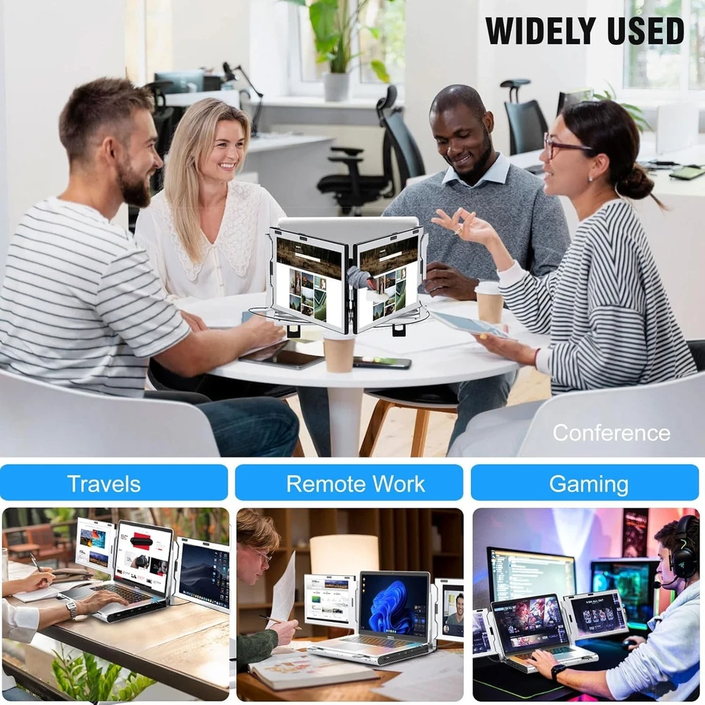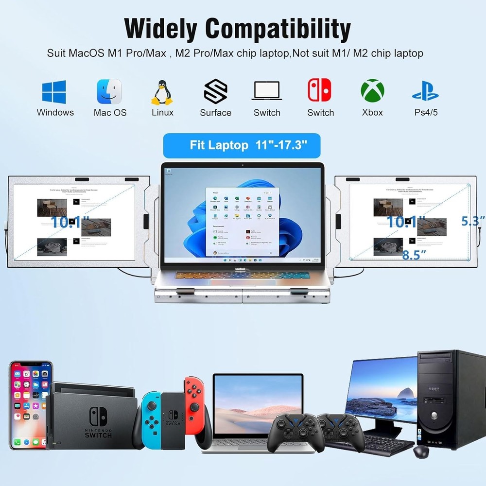 Product description KEFEYA Laptop Screen Extender Multitasks with triple screen, maximize your efficiency up to 300%. Unlock your productivity potential with triple portable monitors create a more productive and colorful world for your work and life. Carry it to start enjoy your travels ,remote work, video conference ,gaming etc Specification: Support:Extend/ mirror/Landscape/portrait Applicable :11-17 IN Laptops,Plug and play, no driver required Bracket base :Support monitor horizontal 360°vertical 360°rotation Individually connected and adjust:Brightness, volume, font size, and other parameters and turn On/OFF. Screen:High resolution / IPS 178°/ 300 nit brightness /72% NTSC color gamut /1:1000 contrast ratio Compatible :Most Windows,Mac OS,Linux,Intel ,Chrome,Switch,PS4/5,Xbox One (Suit Mac M1 Pro/Max , M2 Pro/Max chip laptop,Not suit M1/ M2 chip laptop). Advantage : 1.Improve Efficiency 300% & Convenient Work & Save Time Our Triple Monitor for Laptop Screen with 2 extra monitor screens support you open multiple tasks at the same time and improve your work efficiency up to 300%!Laptop Screen Extender can extend or mirror laptop content help you no need switch workspace save lot time.Carry it with you to start enjoy your travels ,remote work, video conference ,gaming etc (Plug and play, no driver required,Applicable for 11-17 IN Laptops). 2.Widely applicable & Plug and Play The Portable Triple Monitor for Laptop compatible most Windows,Mac OS,Linux,Intel ,Chrome,Switch,PS4/5,Xbox One (Suit Mac M1 Pro/Max , M2 Pro/Max chip laptop,Not suit M1/ M2 chip laptop) . Please make sure your laptop has 2 USB-C ports or 1 USB-C + 1 HDMI port or 2 HDMI port.The device( Laptop/Android Phone) USB-C port must both support power and video transmission.If only connect HDMI please plug 1 more USB-A to C cable offer power. 3.Multiple Use Mode Extend Mirror& 360°Rotation The Portable Triple Monitor for Laptop Screen can be set as extend/ mirror/Landscape/portrait ,Each Laptop Monitor can be individually connect and adjust (brightness, volume, font size,etc),turn On/OFF. The unique bracket base design support monitor horizontal 360°vertical 360°rotation agree all angles Sharing.The Aluminum materials base not only can store screen but also help laptop heat dissipation. 4.Great IPS Quality Panel Screen High resolution Portable Monitor Screen Extender offer IPS 178°clear images viewing angle,300 nit brightness, 72% NTSC color gamut, and 1:1000 contrast ratio provide a bright, vivid and immersive visual experience.With blue light filter, anti-glare technology can protect your eyes relieve eye fatigue . You also can simple adjust the Laptop Screen Extender Monitor's brightness, volume and more by the button on panel. Connection Guide: Our package with many cables USB-C to Cx2 / USB-A to Cx2 / HDMI to MINI HDMI x2 ,Enough for 2 monitor screen use, no matter what port in your laptop computer . Method 1: If your laptop has 2 USB-C ports (Full-Funtion port): Just need connect USB-C to C cable to each monitor screen, Make sure USB-C cable can deliver 5V/2A power. Method 2: If your laptop has 1 USB-C ,1 HDMI & 1 USB-A port: You can connect one monitor screen with USB-C to C cable, and the other monitor screen with HDMI cable(Offer video transmission )& USB-A to C cable (Offer power). Method 3: If your laptop has 1 HDMI Ports and many USB-A port: You can connect one monitor screen with HDMI cables (Offer video transmission )& USB-A to C (Offer power).The other monitor screen need a extra 1 hud cable (USB-A to HDMI) & HDMI cable (Offer video transmission )and USB-A to C cable (Offer power) Warm Tips: 1.The Triple Monitor screen can be used on most Windows,Mac OS,Linux,Intel ,Chrome,Switch,PS4/5,Xbox One (Suit Mac M1 Pro/Max , M2 Pro/Max chip laptop,Not suit M1/ M2 chip laptop). 2.The first time you connect it will be in Portrait mode , You can adjust to Landscape mode in laptop setting. Quick Guide: Q1: How to check Tpye-C port on computer is an all-function port or not ? A: If your laptop have a USB-C port with one of the following symbols (or the Thunderbolt 3, Thunderbolt 4, DP 1.2), then it is the Full-function Type-C port, you can use the USB C to C cable to connect each screen. (You can check the manual or go online to check the computer port parameters.) Q2: Monitor Screen display show "No Signal" A: 1>If you use USB-C to C connect, it means your computer's C port only support power not support video transmission,You can connect a HDMI cable to the monitor provide video transmission. 2>If you use HDMI cable (Provide video transmission) & USB-A/C to C cable (Provide power). It means that your laptop can't provide 5V/2A power through the USB Type-C port, you need connect an external 5V/2A adapter to power the monitor screen. Q3: Monitor Screen Flickers & Black Screen A:It may be that your laptop is low battery or voltage is insufficient,use an extra USB-A to C cable to power laptop or monitor screen extender. Q4: Monitor screen not light up after connecting? A:It may be that your laptop does not have enough power. Please charge the monitor with an extra power supply that provide 5V/2A. Please active your laptop screen to avoid extender screen into sleep mode.
