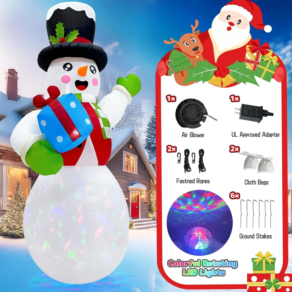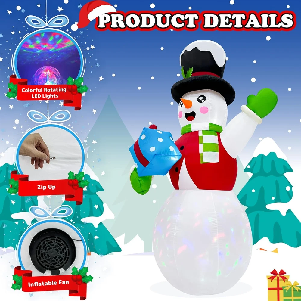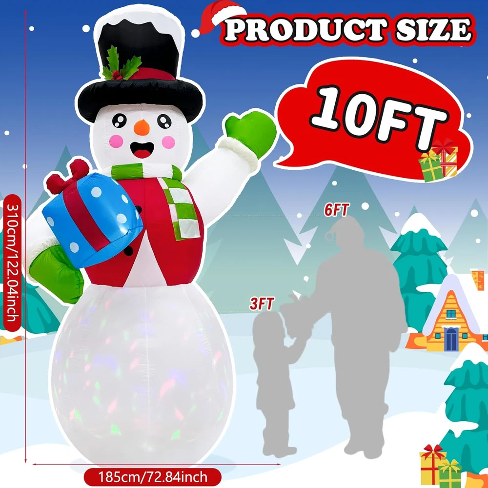 Menu Other Items Feedbacks About Us Contact Us Add To Favorites 10 FT Christmas Inflatable Snowman Outdoor Decoration, Giant Inflatable Snowman Holding Gift Box, Christmas Blow Ups with Rotating Colorful LED Light for Xmas Yard Garden Lawn Vacation Decor Perfect Outdoor Christmas Decorations: OurWarm 10ft large Christmas inflatables snowman, dressed in red clothes, wearing a magic hat, holding a gift box, and waving happily to everyone. The cute appearance expresses a cheerful welcome gesture, and it's sure to delight all who see it, adding a touch of whimsy to your Christmas decorations outside, giving a wonderful and unforgettable Christmas vacation for you Mesmerizing LED Lights: Enhancing its appeal during both day and night, the inflatable Christmas decorations outdoor feature built-in 1 rotating colorful LED light and 2 bright white LED lights. These lights create a vibrant and enchanting glow, illuminating the Snowman in the dark, ensuring your inflatable snowman Christmas decorations remain festive and inviting after sunset Durable and Stable: The blow up Christmas decorations outdoor made from thickened waterproof 190 T polyester fabric to maintain vibrant colours and full appearance throughout the Xmas season. We supply 2 fixed ropes, 6 iron stakes, and 2 cloth bags that can filled with sand to add weight, ensuring your Christmas outdoor inflatables stay in place even in tough conditions Quick Inflation & Easy Storage: The snowman inflatable outdoor comes with a 1A blower and 1.5A adapter. Installation is easy, just zip it up and plug it in a power supply, secure it to the ground, and wait a few minutes and you'll have the perfect Christmas yard decorations. When the holidays end, unplug and unzip to quickly deflate and store easily for the next holiday Suitable for Many Occasions: Our Christmas yard inflatable snowman creates a wonderful and joyful atmosphere that you can display in your yard, garden, lawn, patio, or any space. The funny Christmas inflatable is an ideal centerpiece for holiday parties, family gatherings, or community events, attracting guests and passers-by with its festive design and cheerful atmosphere Product Description Transform your Christmas decor with OurWarm 10 FT Christmas Inflatable Snowman. This giant inflatable snowman is decked out in red clothes and topped with a magic hat, holding a beautifully wrapped gift box, and waves cheerfully, spreading the Christmas spirit to all who pass by. A Full Set Of Accessories Helps You Install This Cute Inflatable Snowman! Two Methods To Help You Install The Blow Up Snowman More Stably! Details Of Christmas Inflatable Snowman Outdoor Decoration! Super Bright Rotating Colourful Lights! Our Christmas inflatable snowmen have built-in bright colorful rotating LED lights, that exude a charming and brilliant light, which not only light up your yard at night but also attract attention during the day. Weather Resistant And Durable! This Christmas inflatable outdoor decoration is crafted from durable, weather-resistant materials to withstand the elements, which maintains bright colors and a complete look throughout the entire holiday season. Quick To Inflate! Our cute inflatable snowman is equipped with a powerful blower that can quickly fill the entire snowman in a short time, making it come to life throughout the holiday activities and continue to bring you holiday joy. Item Specification Item Dimensions 74.8 x 66.93 x 125.98 inches Color white Light Color Bright White Material Type Polyester Item Weight 3.2 Pounds Theme Christmas Occasion Christmas Additional Features Easy Setup Subject Character Snowman Cartoon Character Snowman Dimensions Shipping Returns Additional Info Product Dimensions: 66.93 inches x 74.8 inches x 125.98 inches. Weight: 3.2 lb Fast shipping is very important for us. Our standard shipping service is FREE. Your order will be shipped within 1-3 business days upon full payment received. Most items are delivered within 3-5 business days, however, please allow 3-10 business days. We are shipping only to USA. We only ship to the confirmed Paypal address. We reserve the right to cancel any order for any reason at any time. We are not responsible for undeliverable addresses. We offer a 30 day return policy from checkout winning date. Your satisfaction is guaranteed! If for any reason you are unhappy with your item, just return it within 30 days for a full refund, minus shipping cost. Please contact us prior to initiating a return so that we can issue you a refund authorization. Items defective upon receipt must be packaged in their retail packaging as if new and returned with a detailed description of the problem. Return shipping fees are not refundable. We reserve the right to decline any returns if the above guidelines are not followed. All of our items, unless otherwise stated, will only run on 120 volts. Please check to make sure your country complies with these specifications. If you have a problem or question regarding your transaction please contact us before leaving any type of feedback. We will work with you to resolve any problem you may have.