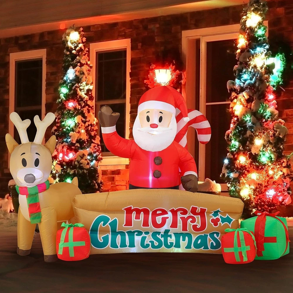 Brand Joiedomi Theme Christmas Cartoon Character Santa Claus Color Red/White Occasion Christmas About this item 10 Feet Long Merry Christmas Inflatable comes with an extended cord, ground stakes, fastened ropes, built-in sandbags, and a plug with UL certification. Bright built-in LED lights. Light up in the evening for the best attraction to neighbors and guests. Premium Quality. Very easy and safe for kids to help decorate! Plug it in, everything pops up in a minute! Perfect for Christmas outdoor yard garden decorations, Christmas event decoration, Holiday blow-ups, Christmas Eve Decor. Christmas night events, cute inflatables, Christmas prop, classroom decorations, Christmas Party decorations and more. EXCEPTIONAL CARE: We're big on the little things. That's why customer safety and satisfaction are at the heart of everything we do. Contact us if products don't meet your expectations. We look forward to ensuring every moment brings you joy.