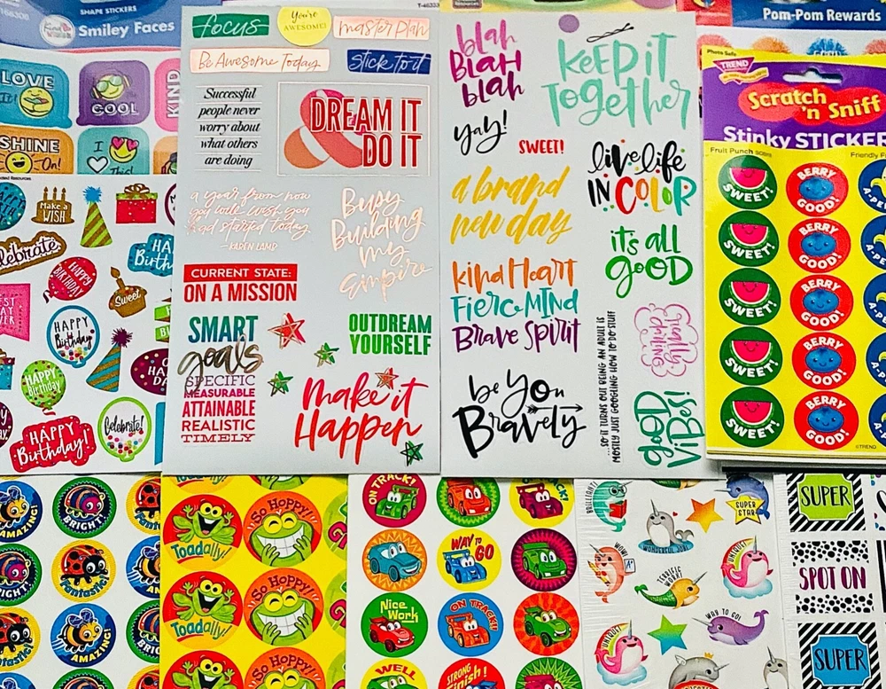 Happy Mixed Sticker Lot | The Ultimate Kit | Qty. 10 Sticker Sheets Fun Assortment of Glossy, Glitter, Metallic, Foil, Laser, Puffy, Scrapbook, Cartoons, Bubble, Pop Up Stickers For Everyone! I have included a large variety of pictures of the assortment available. The pictures give you an idea of what you will be receiving. Please Note: You will not receive everything pictured. You can choose any themes you like. Please contact me with any special requests. This HUGE Variety of fun designs stickers can be used in parties, classroom, school and home, good for reward for students, potty training, adding inside a birthday card, game activities, entertaining toddlers, etc. Perfect Gifts for Kids & all Occasions: Can be given as a gift for kids, girls, boys, toddlers, teens, students, friends, and classmates, they will love it!