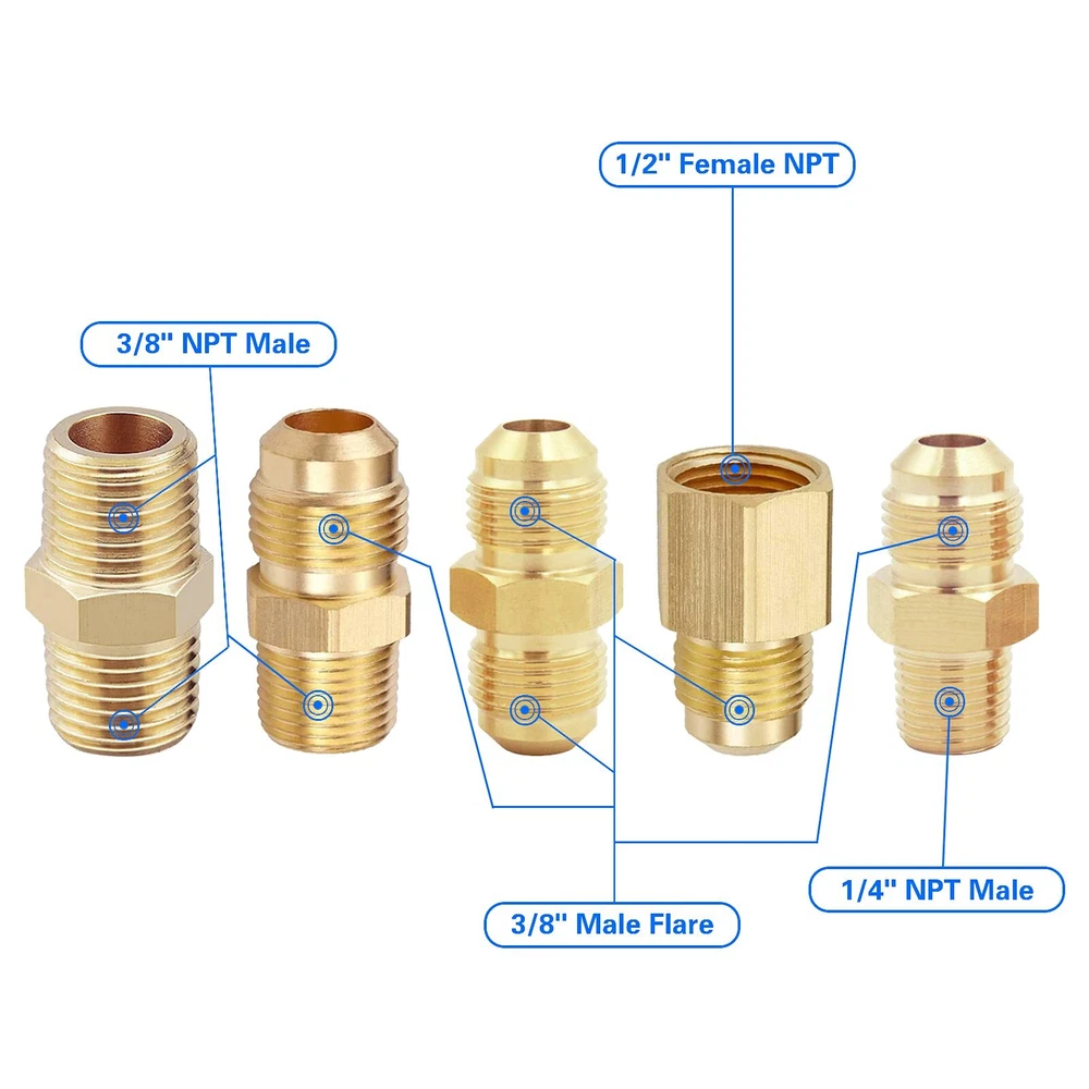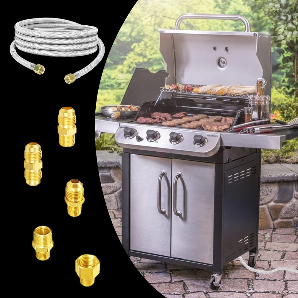 350Psi High Pressure Propane Hose Extension: Both ends of the hose are brass 3/8 inch female flare swivel Nut fittings, Conversion connection of an outdoor appliance to your natural or LP gas line for extending, giving more flexibility moving grill .fire pit. gas heater Brass Conversion Coupling : come powerful 5 different brass adapter couplings fitting; 3/8" NPT Male to 3/8" NPT Male,3/8" NPT Male to 3/8" Flare Male, 3/8" Flare Male to 3/8" Flare Male,1/2" Female NPT to 3/8" Flare Male, 1/4" NPT Male to 3/8" Flare Male; 100% brass union connector gas adapter for corrosion resistance, ductility at high temperatures, and low magnetic permeability Compatible & Wide Application: this 3/8" braided propane hose adapter kit hose has female 3/8" ends on both sides, connect an appliance equipped with a 3/8" male flare fitting; suitable for use extending the propane tank line on your fire pits, gas grills, propane heaters, stoves, propane smokers, portable generators, burners,propane generators High Quality: 10 feet stainless steel braided high pressure propane hose extension assembly passed quality and safety certification, Compared with an ordinary high-pressure rubber pipe, its outer layer is protected by stainless steel braiding, Had Durability, extends the longer service life Standard Propane Hose Connector: 3/8” Female flare propane hose with 5 different types of brass adapter fittings; Great conversion assistance, easy installation, convenient storage, and carrying, flexible use of space, relieve all your worries; Perfect for use can be used for travel trailers or RVs. LP propane stoves. heaters.firepit .fireplace