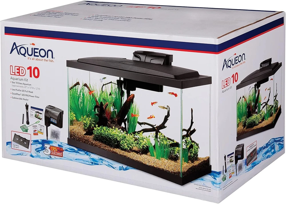 About This Item: Aqueon LED Aquarium Starter Kit – Complete 20-Gallon Fish Tank Setup with Heater, Filter & Accessories 🐟 All-in-One Starter Kit: Includes everything you need to set up your aquarium in one box—just add your favorite plants, decorations, and fish. 💡 Low-Profile LED Hood: Sleek hood design with vibrant cool white LED lighting to beautifully illuminate your aquatic environment and enhance fish colors. 🧹 Advanced Filtration System: QuietFlow power filter features a red LED indicator light that flashes when it’s time to replace the filter cartridge, ensuring optimal water quality. 🌡 Preset Heater: Maintains a consistent 78°F—ideal for most tropical fish species. Submersible design ensures safe and even heat distribution. 📦 Kit Includes: Glass Aquarium Low-Profile LED Hood QuietFlow Power Filter & Medium Replacement Cartridge Submersible Preset Heater Premium Fish Food Sample Water Conditioner Sample Fish Net Thermometer Setup Guide ✅ Uses Medium Aqueon Replacement Filter Cartridge: Easy to replace for long-term use.