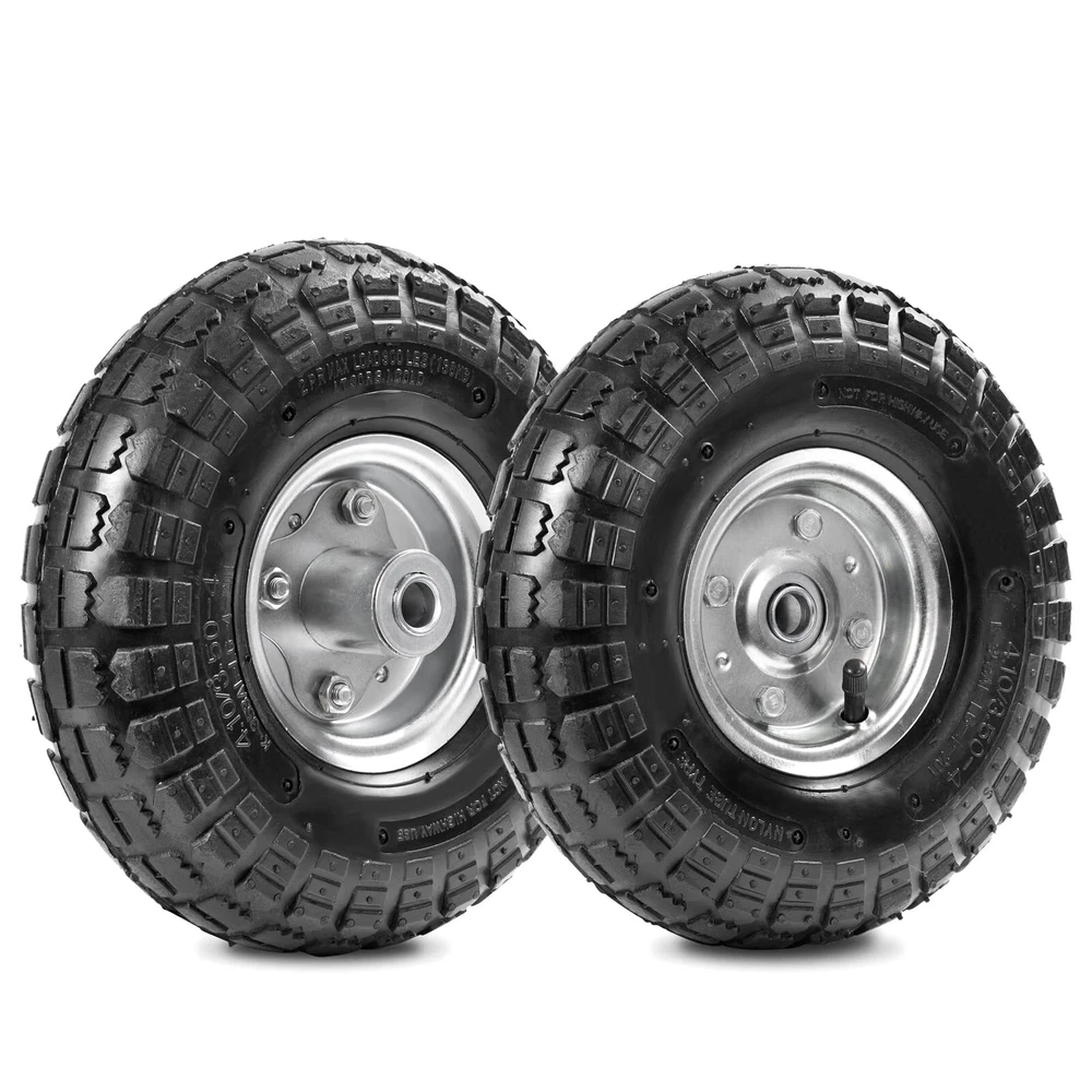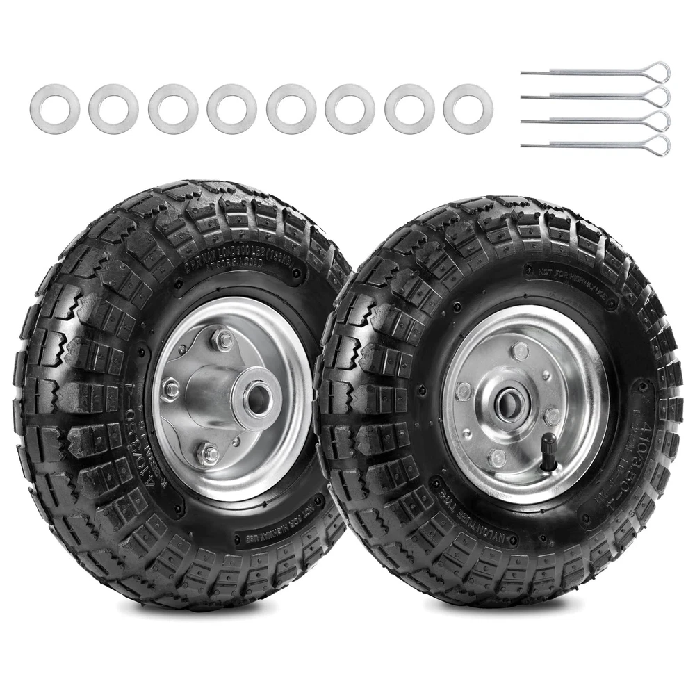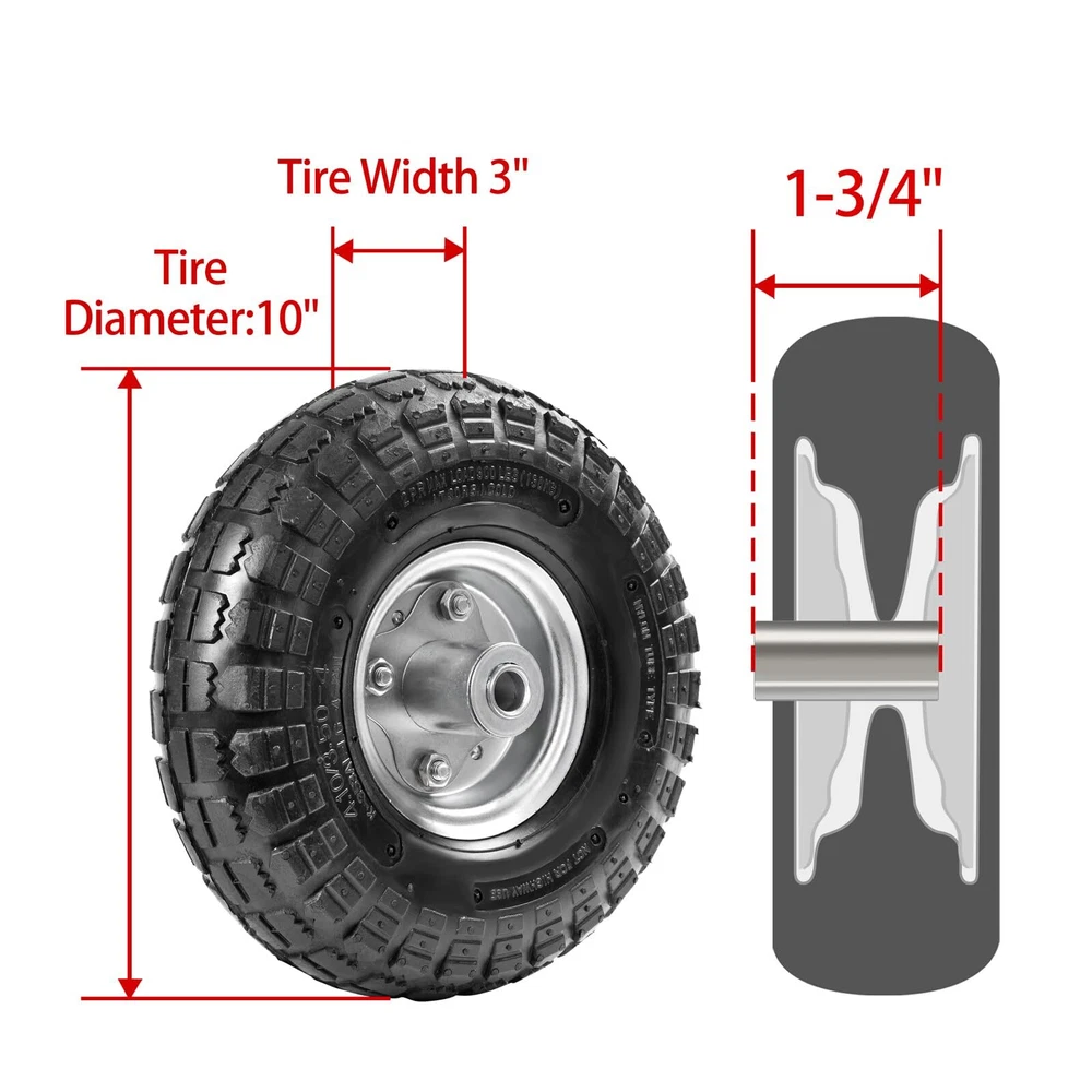 Specs : Wheel Size:10 inches Wide:3 inches Hole size:5/8 inch Load Capacity:300 pounds Hub depth:1-3/4 inch br> Package includes:2 x Tires,8 x Metal washers Double-sealed bearings Tube type:2-ply 4.10/3.5-4 Compatible with: Ten inch tires can replace your handtruck tires and wheel mounts, it can be used on yard cars, air compressors, electric washing machines, shopping carts, wood chippers,snow blowers,dolls,go-carts,golf carts, tricycle,children's wagons, hand trucks,lawn mowers and more so air tire wheels are very good. It provides easy installation and optimal workload reduction performance. 【10 Inch Tires and Wheels】Heavy-Duty replacement tire 4.10/3.50-4 Tires and Wheels,High-quality heavy-dutyrubber,Double Sealed Bearings 【Specifications】Tire Diameter:10",Tire Width 3.14",Axle Bore Diameter: 5/8",hub offset:2.16",Load Capacity: 300lbs(Let's drive more smoothly);Please Check Carefully Before Buying tire size, hub length and axle 【Tread Design】Sawtooth tire treads that provide more than adequate grip non-slip capacity greatly. (enabling you to expend less effort) 【Fit】10 Inch Garden cart replacement wheels for carts,lawn mowers,shopping carts,lumberjacks,snow blowers,doll machines,go-karts,golf carts, tricycles and more 【Package Includes】2 x Tires,8 x Metal washers(easy installation)