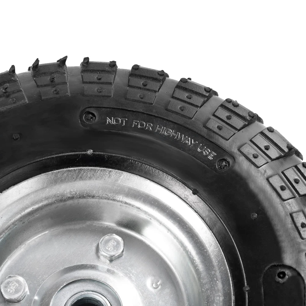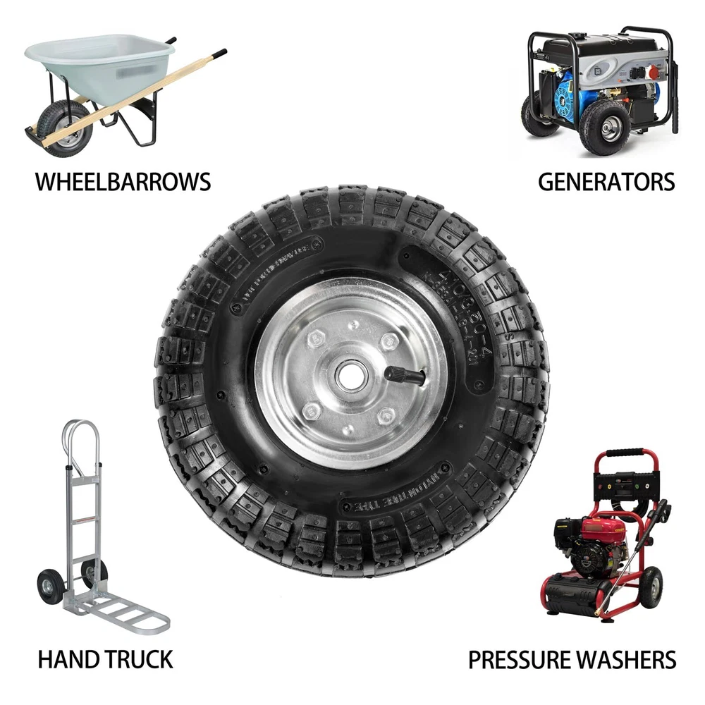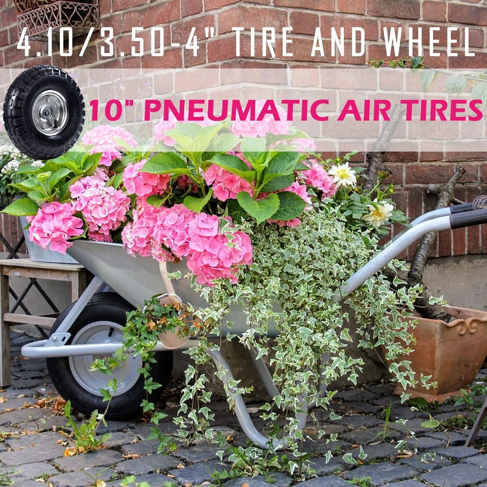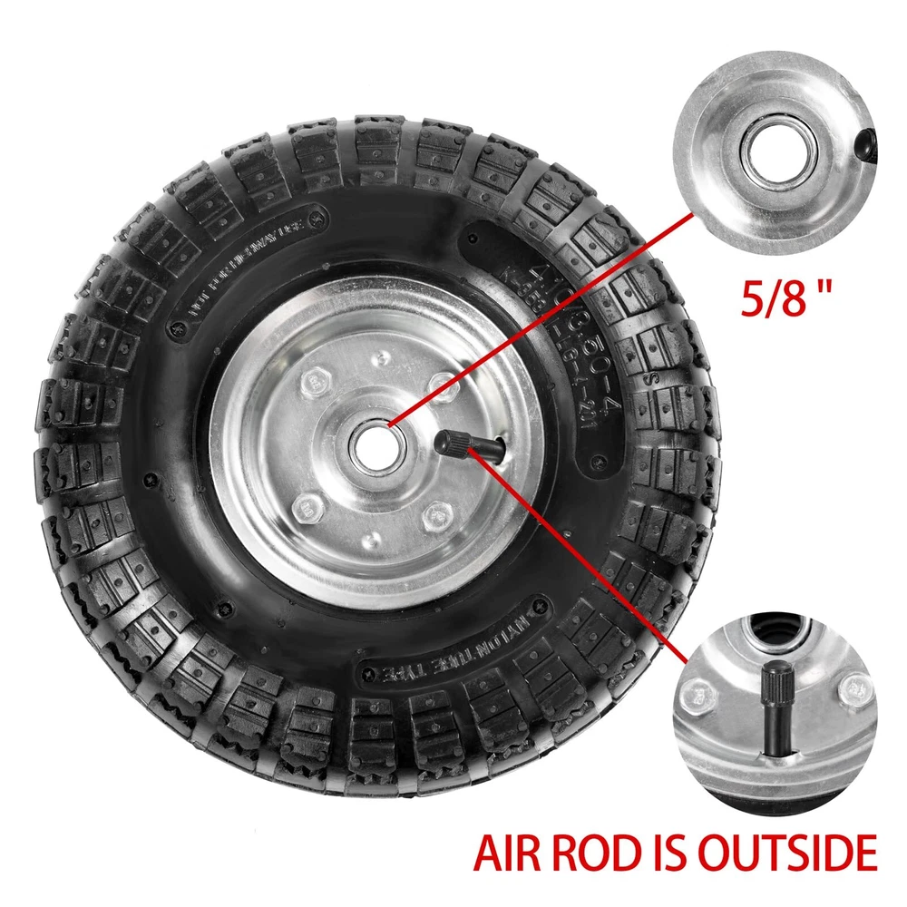 Specs : Wheel Size:10 inches Wide:3 inches Hole size:5/8 inch Load Capacity:300 pounds Hub depth:1-3/4 inch br> Package includes:2 x Tires,8 x Metal washers Double-sealed bearings Tube type:2-ply 4.10/3.5-4 Compatible with: Ten inch tires can replace your handtruck tires and wheel mounts, it can be used on yard cars, air compressors, electric washing machines, shopping carts, wood chippers,snow blowers,dolls,go-carts,golf carts, tricycle,children's wagons, hand trucks,lawn mowers and more so air tire wheels are very good. It provides easy installation and optimal workload reduction performance. 【10 Inch Tires and Wheels】Heavy-Duty replacement tire 4.10/3.50-4 Tires and Wheels,High-quality heavy-dutyrubber,Double Sealed Bearings 【Specifications】Tire Diameter:10",Tire Width 3.14",Axle Bore Diameter: 5/8",hub offset:2.16",Load Capacity: 300lbs(Let's drive more smoothly);Please Check Carefully Before Buying tire size, hub length and axle 【Tread Design】Sawtooth tire treads that provide more than adequate grip non-slip capacity greatly. (enabling you to expend less effort) 【Fit】10 Inch Garden cart replacement wheels for carts,lawn mowers,shopping carts,lumberjacks,snow blowers,doll machines,go-karts,golf carts, tricycles and more 【Package Includes】2 x Tires,8 x Metal washers(easy installation)