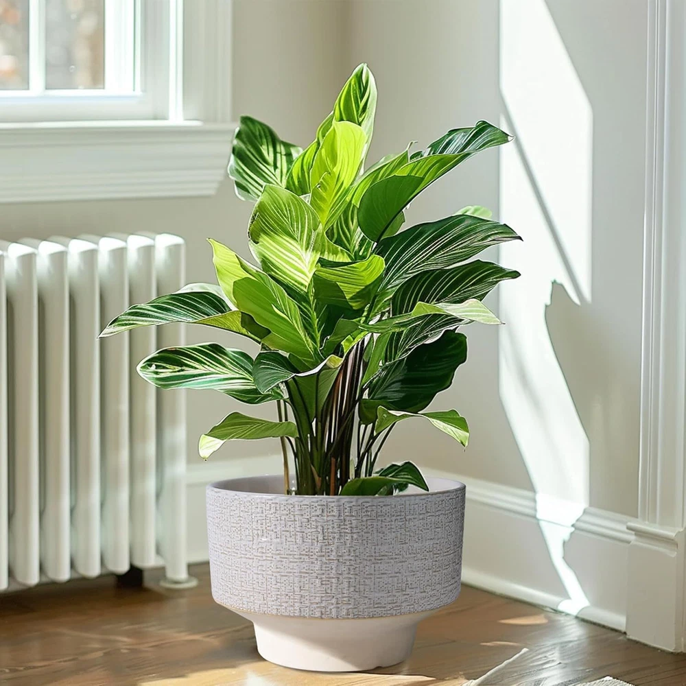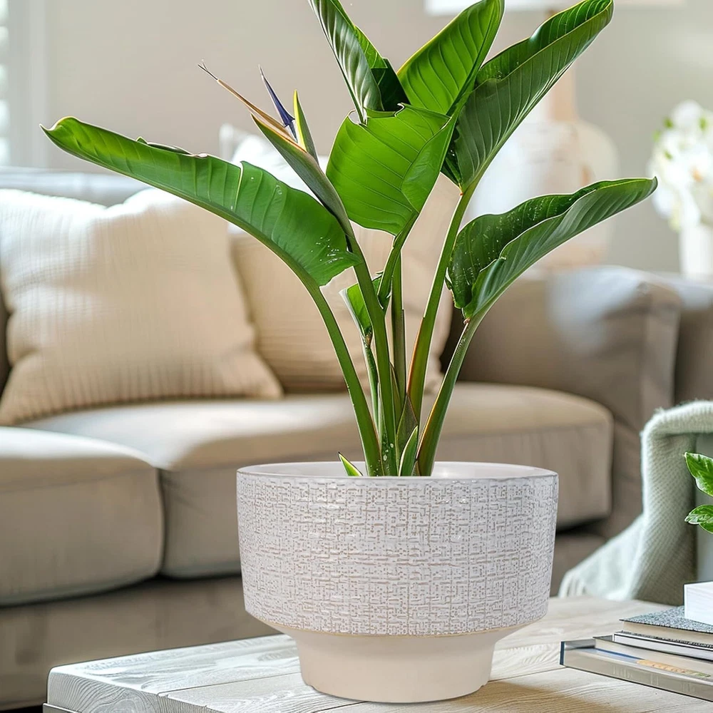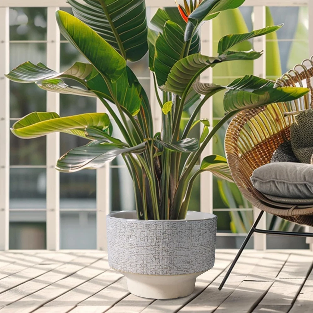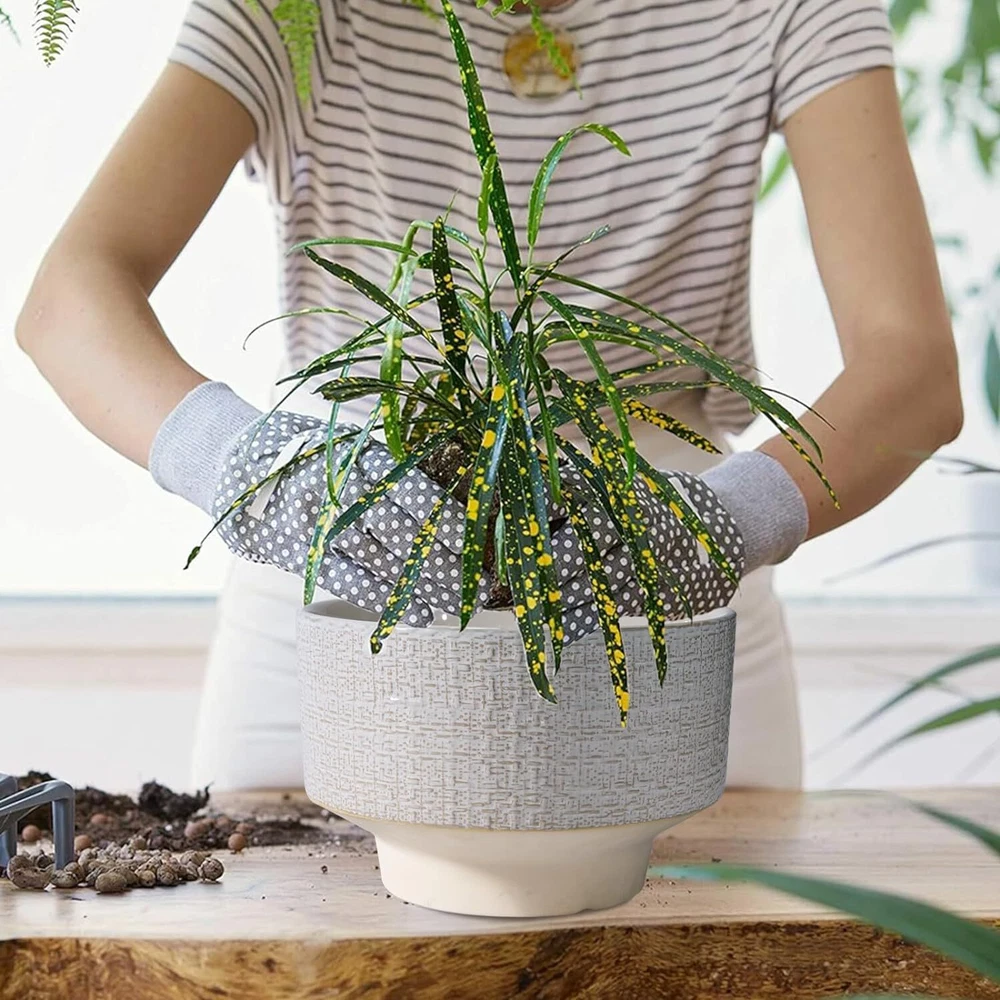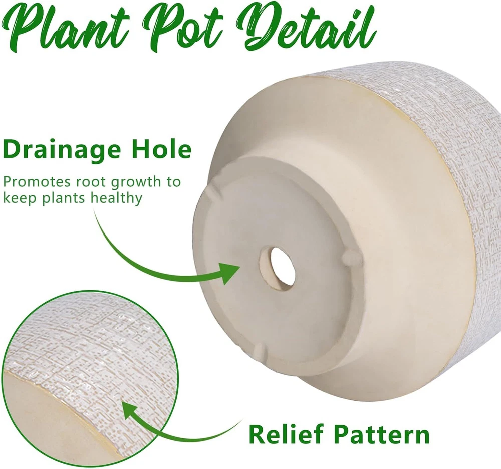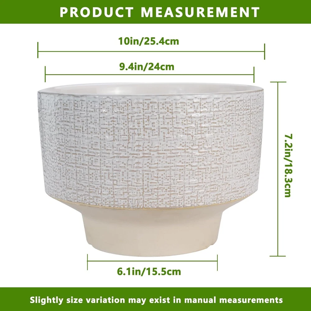 10 Inch Ceramic Planter Pot Round Plant for Indoor Plants 10 Inch, White Product Details Material: Ceramic Color: White Special Feature: Drainage Hole, Weather Resistant Style: Modern Planter Form: Plant Pot 【Decorate Your Home】Our ceramic planter pot is designed with beautiful fabric texture and flowing glaze, blending vintage charm with modern flavor, adding a distinctive visual enjoyment to your garden, bedroom, living room, and office. 【Durable Ceramic Material】The ceramic pots for plants is made of high temperature firing, not easy to break and can be used for a long time. With good air permeability, it helps plant roots breathe and promotes healthy plant growth. 【Plant Pot with Drainage Hole】The drainage hole can effectively remove excess water from the planter pot to prevent root rot. 【Gift for Plant Lover】This planter is suitable for bonsai, monstera, money tree, ficus lyrata, olive tree, palm trees, cactus, aloe, snake plant and other plants, a great holiday gift for plant lovers, family and friends. 【10 Inch Large Planter】10” D x 7.2” H, plant not included. 【After-sales】 If you have any questions after receiving the indoor plant pot or during use, please tell us and we will solve them for you.