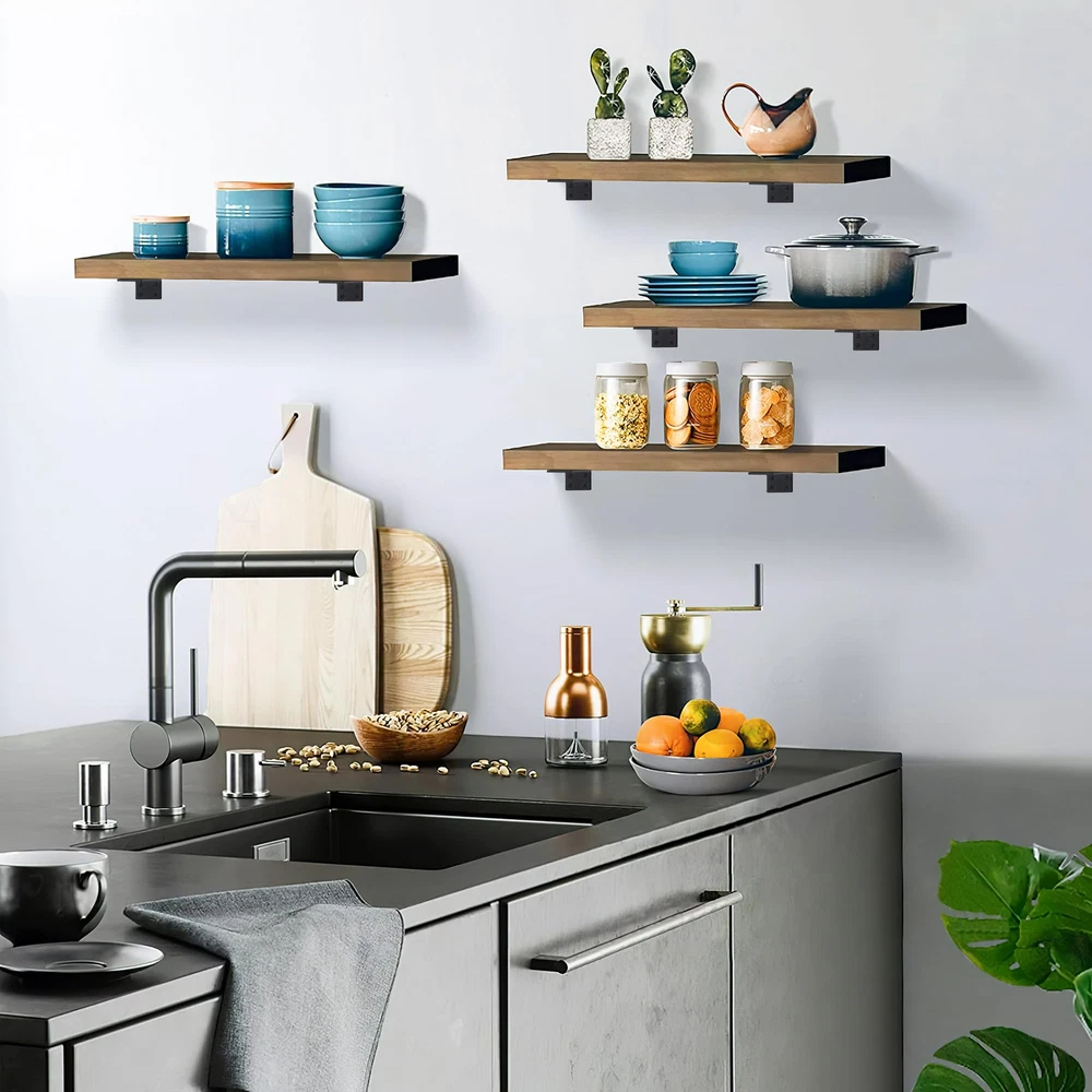 Heavy Duty--Our floating shelf hardware is made from thick, heavy-duty iron with a 1/5-inch thickness, stamped and bent as a single piece for exceptional durability without weak weld points. Each pair of brackets can support up to 153 pounds. Quality Coating--The surface features a thick black frosted coating, enhancing friction between the board and the bracket, while also providing waterproofing and rust resistance to extend the product's lifespan. Bracket Design--With a height of only 1.6 inches, the bracket easily conceals between the wall and the shelf, creating a sleek and elegant floating bookshelf effect. Perfect for DIY Projects--Enhance storage efficiency and make the most of your home space. Ideal as brackets for DIY wall-mounted open shelves, they are versatile and perfect for kitchens, bathrooms, bedrooms, offices, garages, studies, and dressing rooms. Complete Accessories: We've included all the necessary screws for a hassle-free installation. Simply align the brackets, secure them with the provided screws, and your shelves will be ready to use in no time.