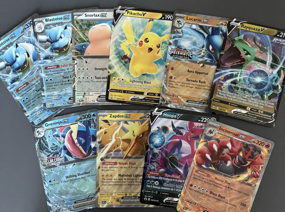 You will receive 10 authentic jumbo Pokémon cards (oversized) per order. Each lot includes EX, V, or VSTAR jumbo cards featuring popular Pokémon such as Blastoise, Lucario, Greninja, Snorlax, Pikachu, Rayquaza, Zapdos, and more. Exact cards may vary, but all packs are carefully assembled from the same high-quality jumbo card selection shown. ✔ Oversized jumbo cards (larger than standard Pokémon cards) ✔ Perfect for kids, gifts, binders, or display ✔ Ships fast and well protected This is a great starter jumbo collection or addition to any Pokémon fan’s display.