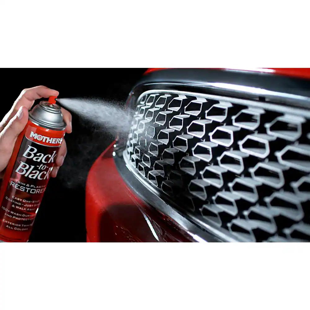 Easy one-step coating, just spray and walk away Long lasting wash durability and protection Safe on exterior trim of all colors Back-to-Black Trim and Plastic Restorer aerosol is Mothers simplest trim care creation yet. Drawing upon industry-proven Back-to-Black surface care technology, this simple mist-on and walk away dressing provides unmatched results and convenient, effortless application. Light oxidation, wax residue and surface film are no match for this surface coating, instantly bringing back that dark, factory-new sheen to any sun-burnt plastic, rubber or vinyl. Once fully cured, you're left with a long-lasting, protective barrier, preventing further deterioration caused by sun, smog, ozone, water, chemicals and airborne contaminants. It makes quick work of tight, difficult-to-reach areas such as grilles, fender wells, engine hoses and other plastic components that are tucked down deep under your hood. Brings back that dark, factory-new sheen to any Sun-burnt plastic, rubber or vinyl surface leaving a long-lasting protective barrier protecting against further deterioration Great for tight, difficult-to-reach areas such as grills, fender wells, engine hoses and other plastic components under your hood Simple mist-on and walk away dressing provides unmatched results and convenient, effortless application Safe for use on all automotive plastic, vinyl and rubber surfaces