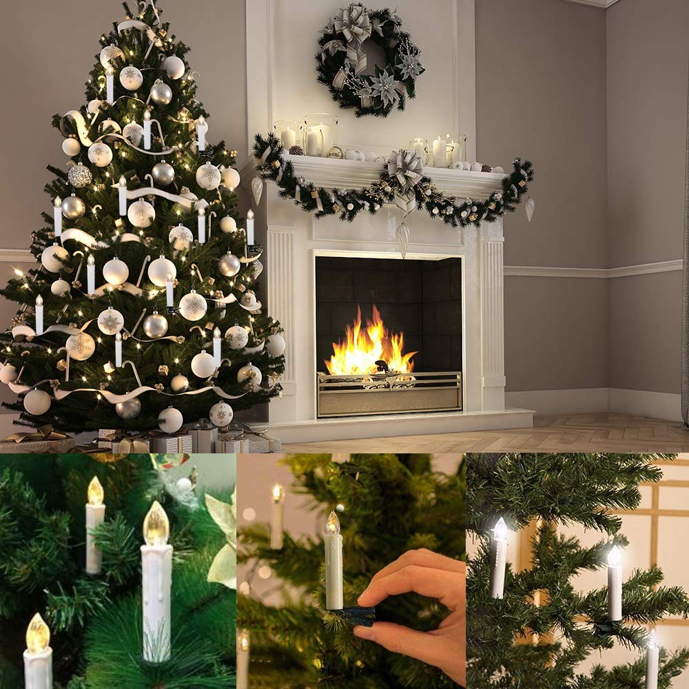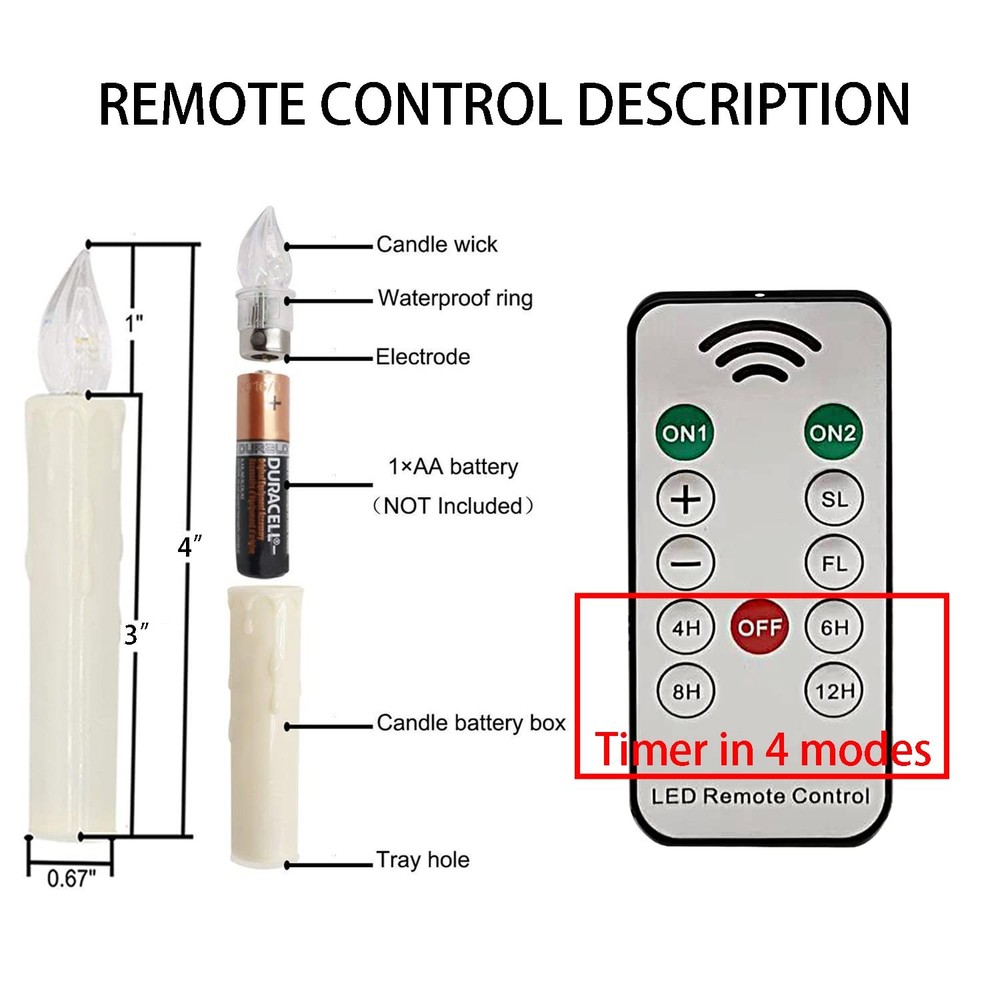 Color:10pcs,wram White Lights Description: These flameless candles can be used indoors or outdoors. Enjoy the mood without the messy wax and dangerous flames as well as the convenience of the remote control. The bulbs are made in LED, which is safe and energy-efficient and they change colors, too. This is perfect for those nights when you want to relax and de-stress. Give you the feeling of real candles without worrying about dripping, fires, etc. Specification ●Material: Plastic and ABS ● Flash mode: Flicker Flame ● Work time: 140 hours ●LED color: Warm White Flicker ●Battery: 1xAA batteries (not included) ●Remote battery: 1-CR2025 (included) ●Diameter: 0.7 inches ●Length: 4 inches Details 1. On1/ON2 and Off buttons: Press "ON1/ON2" /"OFF" button to turn the candle on /off. 2. Press "On1", the candle is flickering, the color changing,and it will be stopped after continuously pressing "On1" three seconds. 3. Press "On2", the candle is not flickering, the color changing, then press"SL" makes the candle flicker, it can be stopped after press "On2" again. 4."+": Press it makes the light brighter 5."-": Press it makes the light darker 6."SL": Press it makes the light slow flickering 7."FL": Press it makes the light fast flickering 8."TIMER": Press it to setup 4 lighting period: 4 hours,6 hours,8 hours,12 hours. Package includes: 10 x Flameless Candles (batteries not included), 1 x remote control (battery included), 10 x clips 【PERFECT for DECORATION】 These battery operated led candles are perfect for decorate youe Christmas tree.With different Flickering/Flash ways and Dimmable function,the candle light can be used to create a joyful and festive ambience. They are perfect for home, Christmas parties, holidays, Thanksgiving, Harry Potter themed parties, indoor and outdoor decorations. 【REMOTE CONTROL/TIMER FUNCTION】 The Candles have a Flicker(Fast and Slow) and TIMER FUNCTION. You can use remote to setup the lighting time. There are 4 time period to choose from:4 hours,6 hours,8 hours,12 hours. For exmple: if you setup 4 hours, the candles will lighting 4 hours and then shut off automatically.You can also adjust the Brightness(Increase and Decrease) by the remote.Candle gives you a REALISTIC APPEARANCE without the smoke,fake scent or messy dripping wax! 【LONG LASTING/SAVE BATTERY】 Each candle requires 1x AA replaceable batteries(NOT included) that will provide up to 180 hours(10-15 days) light-time and can be replaced easily.It saves your money on batteries. A great way to enjoy the gorgeous candlelight. 【WIDELY USE with HIGH QUALITY CLIPS】The candles come with removable clips for each which can attach them to a Christmas tree,Chandeliers,Swedish Candelabra, wreaths,tealight or other object.They can be widely applied to Christmas, wedding, party, thanksgiving. 【SAFE and BEAUTIFUL】 The candles are Energy saving, smoke free, zero carbon emission and without having to worry of flame. Absolutely no fire hazards or burning risks, safe for families with pets or young children.They can create warm and romantic atmosphere, which can give you a magic world, and bring a breathable design into your home's warm environment.