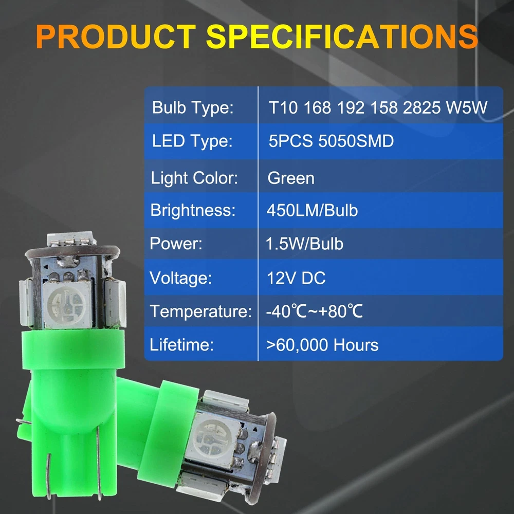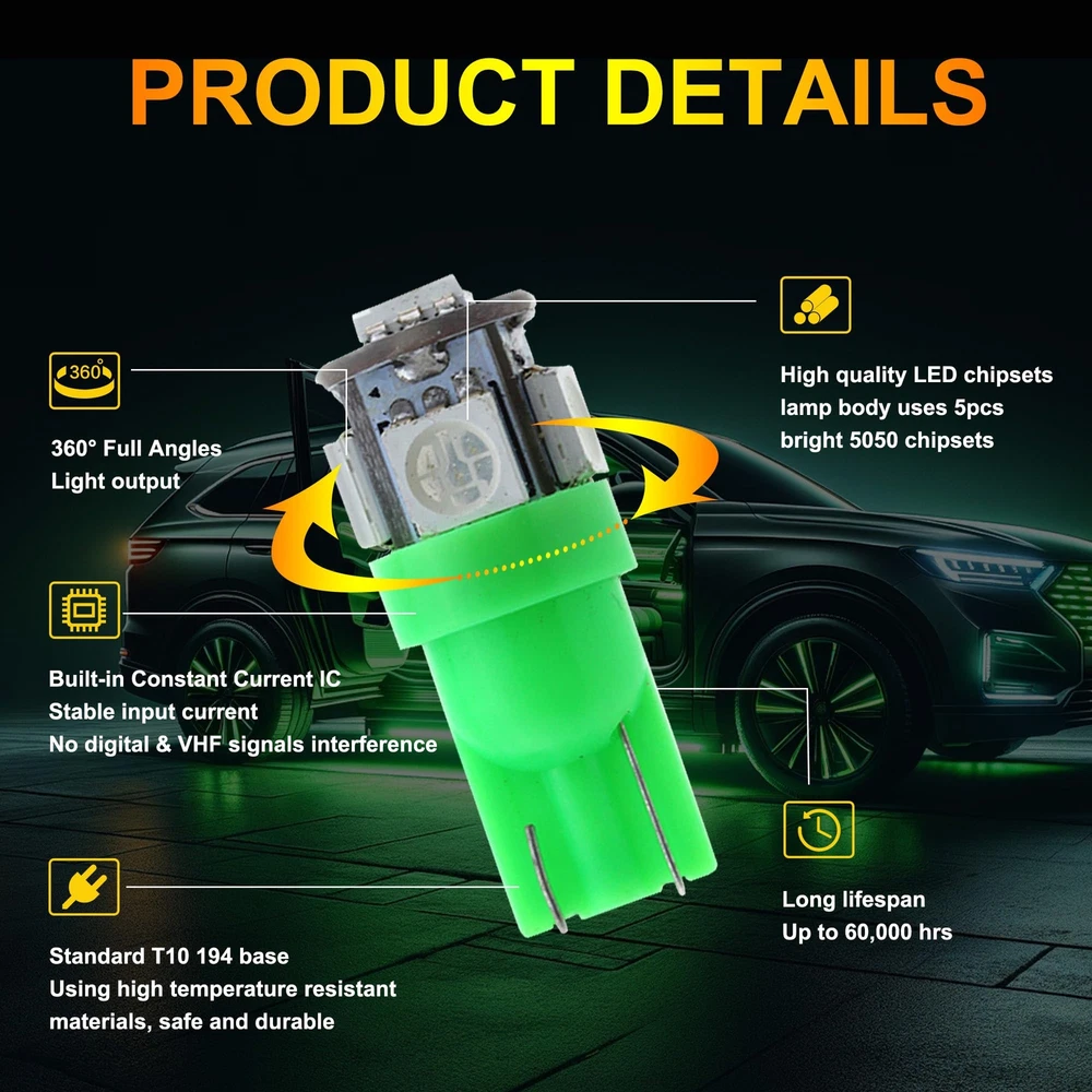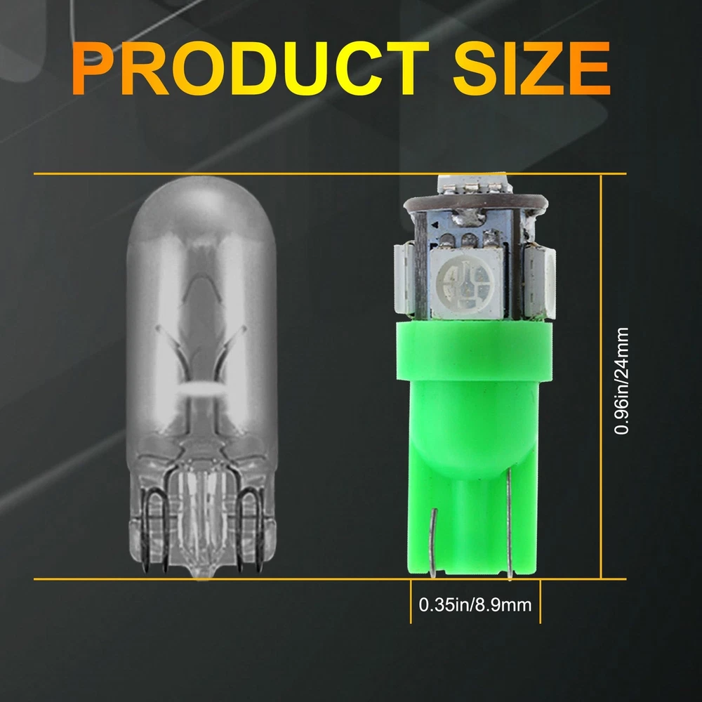 Store Categories Store Categories Other 10 PCS T10 LED Light Bulb Kit, 5050 SMD Super Bright Car Interior Replacement Product Description 【Good Performance】: T10 LED bulbs feature advanced 5050-SMD chips, providing strong light diffusion and uniform illumination. Built-in precision circuit board ensures low power consumption, fast heat dissipation, and longer lifespan compared to traditional bulbs. 【High Brightness】: Each bulb emits bright, 360-degree illumination without blind spots. Ideal for installation in the dome, map, door, glove box, and other areas of your car, these bulbs brighten any dark space, ensuring clear visibility. 【Multi-Functional】: These LED bulbs enhance night driving by illuminating the car interior without distracting the driver. They provide brilliant color effects and light up previously unlit areas such as the dashboard, significantly improving your driving experience. 【Quality Assurance】: This product comes with a 1-year quality assurance guarantee. If you encounter any issues, please contact us. Our customer service team is ready to provide professional support and assistance. 【Wide Application】: These versatile LED bulbs are suitable for a wide range of applications, including exterior taillights, parking lights, license plate lights, and side marker lights. Easy to install, they require no tools—just plug them in and use immediately. Payment Policy Shipping Policy Returns Policy Contact us FAQ Payment Policy 1. Payment must be completed via PayPal within three days following the purchase date. 2. I t is important to ensure that the address provided on PayPal matches the one listed on eBay. 3. I f you have successfully bid on an item, please arrange payment within four days to avoid receiving an Unpaid Item Reminder from eBay, w hich could negatively impact your eBay history. 4. B uyers should be aware that they are liable for any import duties, custo ms charges, and taxes that may apply. We recommend consulting with your local customs office to ascertain any extra expenses prior to finalizing your order. Shipping Policy All items will be shipped in 48 hours after receiving your payment . 1. To USA , take standard(10-20 working days) or expedited shipping(4-6 working days). expedited shipping need charge extra shipping fee. 2. To other countries, take standard(15-25 working days) or expedited shipping(5-8 working days). expedited shipping need charge extra shipping fee. Returns Policy We offer 30 days return policy. Please contact us within 30 days t from the date you receive your order if you have any issues with the product or want return .Refund will be send after we got your resend package. All returned items should be in the original packaging , return tracking information should be provided . Buyer is responsible for return shipping cost due to the problem not caused by item quality itself . Don''t worry , please remember we also hope business smooth, our mission like google "Don't be evil" and "communication make life better". Contact us Our office hours are MONDAY - FRIDAY 9:00PM - 6:00PM PST, but we will response you once we get your message .There will be some delay on response if you send message or E-Mail on weekend. We are always been trying to provide best service and reliable products for every customer. If you are satisfied with the product you received,please leave us positive feedback. If you are not satisfied for any reason, please do not be quick to leave negative or neutral feedback.We will work hard to make sure every customer 100 percent satisfied, and resolve any problem for you. FAQ Q1: Will this bulb fit my vehicle? A: We can match almost any vehicle to one of our bulb sizes. eBay only lets us include partial vehicle fitments per listing, but if your vehicle does not show up on the compatibility table at the top of our listings, welcome you to contact us for free consulation before purchasing a product. Q2: My item has not arrived, what's taking so long? A: Sometimes items take longer than expected, especially if it’s going far or to rural area. Check with your post office to see if your item has been held up. Sometimes USPS will not update a tracking number until it has arrived at its destination. If your item still has not arrived after a few days, let us know so we can double check for you and help solve it asap. Q3: Do I need to mention the Year, Make and Model in the notes when place order? A: YES. Please include the Year, Make, and Model in the notes section during checkout to ensure you receive everything needed for your kit! Q4: My bulbs wo n't fit, help! A: Special bulb holder may be required. See if you can take the holder from the stock bulb. If not, let us know. The bulb size may be wrong, double check the item you received with the item you ordered. Do you have an aftermarket lighting housing? These may not be perfectly fitted for aftermarket bulbs and will require some manual modifications. Q5: Neither side lighting up? Both sides flicker, flash, or work inconsistantly. A:Check the headlight fuses, and then check the ballast plugs to insure correct installation. If this doesn't work, there may be a voltage problem with the vehicle. You probably just need a relay or capacitor. Q6: WARNING ABOUT POLARITY Unlike halogen bulbs, LED are polarity sensitive. BEFORE you start your LED kit installation, verify the polarity on your vehicle by simply plugging the LED bulb into your vehicle socket. - if your light turns on, please proceed to install both bulbs onto your vehicle. - if your light DOES NOT turn on, disconnect the bulb and flip the socket in order to reverse the polarity (this will not damage your vehicle electrical system in any way). Once you made sure the LED bulb turns on, please proceed to install both bulbs onto your vehicle. Note: There is no convention when it comes to polarity. Different car manufactures have different polarity setup, even within the car model the polarity setup on you