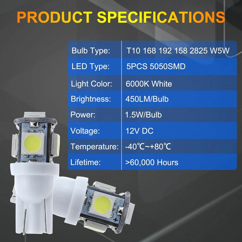 10 PCS T10 LED Light Bulb Kit, 5050 SMD Super Bright Car Interior Replacement