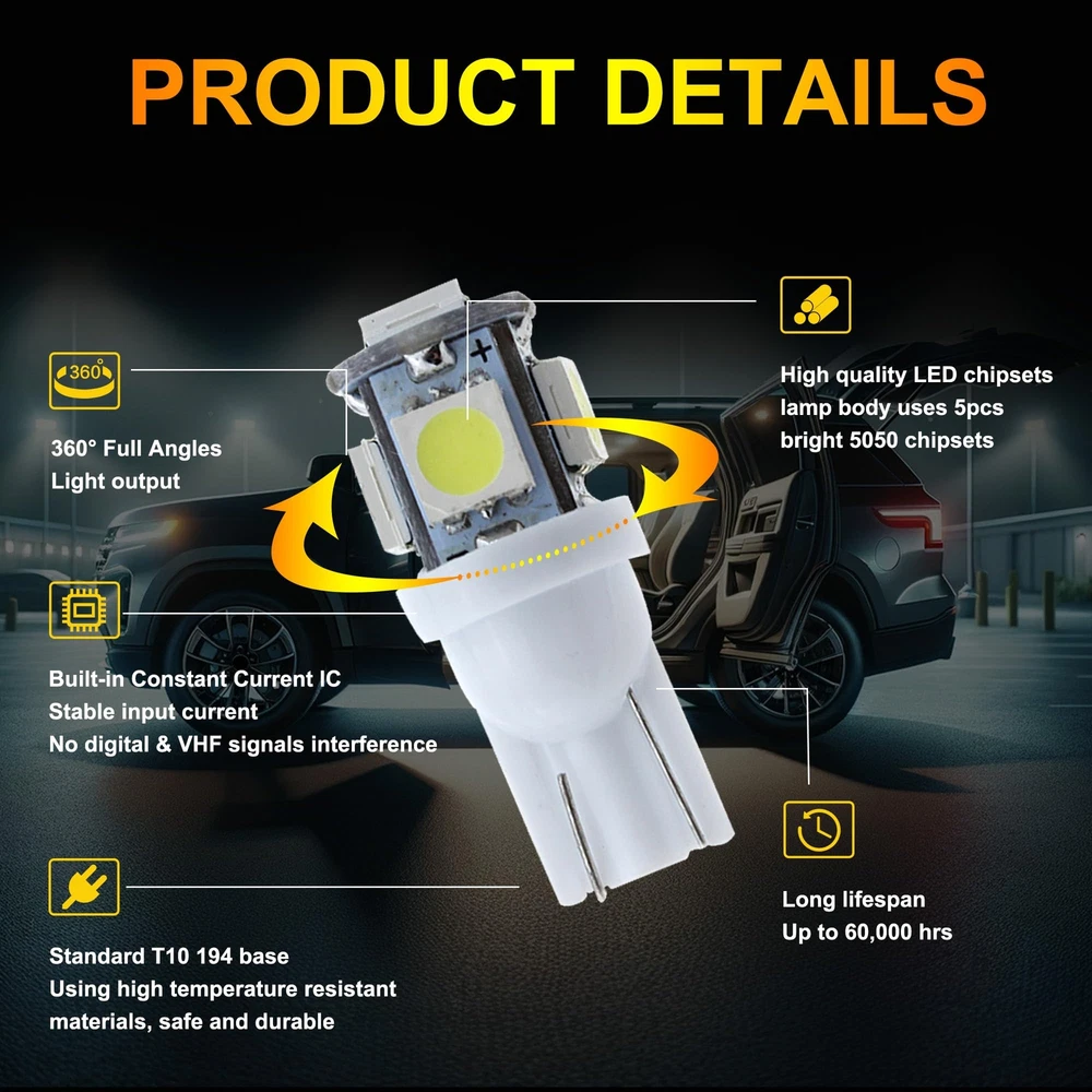 Store Categories Store Categories Other 10 PCS T10 LED Light Bulb Kit, 5050 SMD Super Bright Car Interior Replacement Product Description 【Good Performance】: T10 LED bulbs feature advanced 5050-SMD chips, providing strong light diffusion and uniform illumination. Built-in precision circuit board ensures low power consumption, fast heat dissipation, and longer lifespan compared to traditional bulbs. 【High Brightness】: Each bulb emits bright, 360-degree illumination without blind spots. Ideal for installation in the dome, map, door, glove box, and other areas of your car, these bulbs brighten any dark space, ensuring clear visibility. 【Multi-Functional】: These LED bulbs enhance night driving by illuminating the car interior without distracting the driver. They provide brilliant color effects and light up previously unlit areas such as the dashboard, significantly improving your driving experience. 【Quality Assurance】: This product comes with a 1-year quality assurance guarantee. If you encounter any issues, please contact us. Our customer service team is ready to provide professional support and assistance. 【Wide Application】: These versatile LED bulbs are suitable for a wide range of applications, including exterior taillights, parking lights, license plate lights, and side marker lights. Easy to install, they require no tools—just plug them in and use immediately. Payment Policy Shipping Policy Returns Policy Contact us FAQ Payment Policy 1. Payment must be completed via PayPal within three days following the purchase date. 2. I t is important to ensure that the address provided on PayPal matches the one listed on eBay. 3. I f you have successfully bid on an item, please arrange payment within four days to avoid receiving an Unpaid Item Reminder from eBay, w hich could negatively impact your eBay history. 4. B uyers should be aware that they are liable for any import duties, custo ms charges, and taxes that may apply. We recommend consulting with your local customs office to ascertain any extra expenses prior to finalizing your order. Shipping Policy All items will be shipped in 48 hours after receiving your payment . 1. To USA , take standard(10-20 working days) or expedited shipping(4-6 working days). expedited shipping need charge extra shipping fee. 2. To other countries, take standard(15-25 working days) or expedited shipping(5-8 working days). expedited shipping need charge extra shipping fee. Returns Policy We offer 30 days return policy. Please contact us within 30 days t from the date you receive your order if you have any issues with the product or want return .Refund will be send after we got your resend package. All returned items should be in the original packaging , return tracking information should be provided . Buyer is responsible for return shipping cost due to the problem not caused by item quality itself . Don''t worry , please remember we also hope business smooth, our mission like google "Don't be evil" and "communication make life better". Contact us Our office hours are MONDAY - FRIDAY 9:00PM - 6:00PM PST, but we will response you once we get your message .There will be some delay on response if you send message or E-Mail on weekend. We are always been trying to provide best service and reliable products for every customer. If you are satisfied with the product you received,please leave us positive feedback. If you are not satisfied for any reason, please do not be quick to leave negative or neutral feedback.We will work hard to make sure every customer 100 percent satisfied, and resolve any problem for you. FAQ Q1: Will this bulb fit my vehicle? A: We can match almost any vehicle to one of our bulb sizes. eBay only lets us include partial vehicle fitments per listing, but if your vehicle does not show up on the compatibility table at the top of our listings, welcome you to contact us for free consulation before purchasing a product. Q2: My item has not arrived, what's taking so long? A: Sometimes items take longer than expected, especially if it’s going far or to rural area. Check with your post office to see if your item has been held up. Sometimes USPS will not update a tracking number until it has arrived at its destination. If your item still has not arrived after a few days, let us know so we can double check for you and help solve it asap. Q3: Do I need to mention the Year, Make and Model in the notes when place order? A: YES. Please include the Year, Make, and Model in the notes section during checkout to ensure you receive everything needed for your kit! Q4: My bulbs wo n't fit, help! A: Special bulb holder may be required. See if you can take the holder from the stock bulb. If not, let us know. The bulb size may be wrong, double check the item you received with the item you ordered. Do you have an aftermarket lighting housing? These may not be perfectly fitted for aftermarket bulbs and will require some manual modifications. Q5: Neither side lighting up? Both sides flicker, flash, or work inconsistantly. A:Check the headlight fuses, and then check the ballast plugs to insure correct installation. If this doesn't work, there may be a voltage problem with the vehicle. You probably just need a relay or capacitor. Q6: WARNING ABOUT POLARITY Unlike halogen bulbs, LED are polarity sensitive. BEFORE you start your LED kit installation, verify the polarity on your vehicle by simply plugging the LED bulb into your vehicle socket. - if your light turns on, please proceed to install both bulbs onto your vehicle. - if your light DOES NOT turn on, disconnect the bulb and flip the socket in order to reverse the polarity (this will not damage your vehicle electrical system in any way). Once you made sure the LED bulb turns on, please proceed to install both bulbs onto your vehicle. Note: There is no convention when it comes to polarity. Different car manufactures have different polarity setup, even within the car model the polarity setup on you