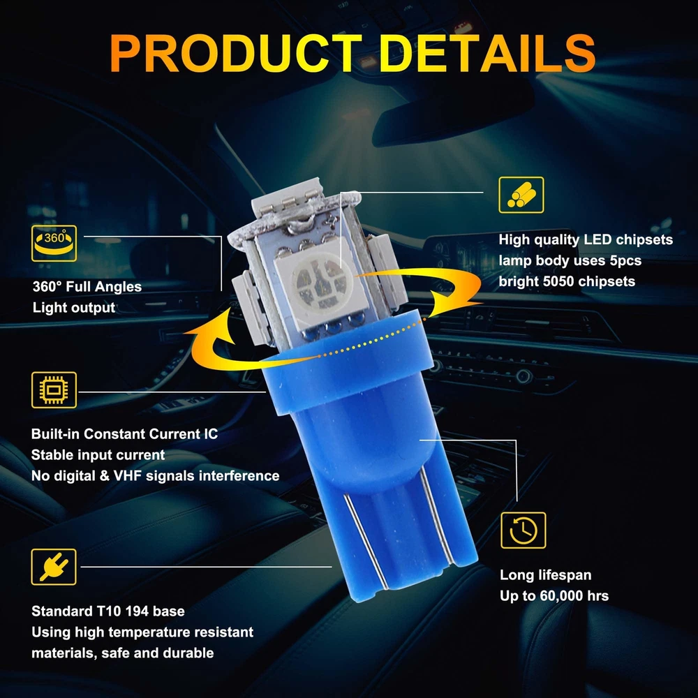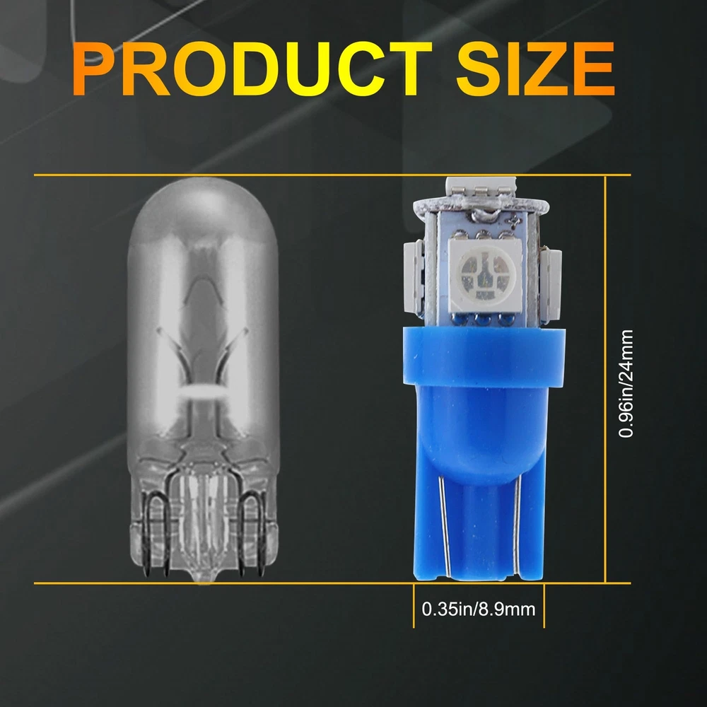 Store Categories Store Categories Other 10 PCS T10 LED Light Bulb Kit, 5050 SMD Super Bright Car Interior Replacement Product Description 【Good Performance】: T10 LED bulbs feature advanced 5050-SMD chips, providing strong light diffusion and uniform illumination. Built-in precision circuit board ensures low power consumption, fast heat dissipation, and longer lifespan compared to traditional bulbs. 【High Brightness】: Each bulb emits bright, 360-degree illumination without blind spots. Ideal for installation in the dome, map, door, glove box, and other areas of your car, these bulbs brighten any dark space, ensuring clear visibility. 【Multi-Functional】: These LED bulbs enhance night driving by illuminating the car interior without distracting the driver. They provide brilliant color effects and light up previously unlit areas such as the dashboard, significantly improving your driving experience. 【Quality Assurance】: This product comes with a 1-year quality assurance guarantee. If you encounter any issues, please contact us. Our customer service team is ready to provide professional support and assistance. 【Wide Application】: These versatile LED bulbs are suitable for a wide range of applications, including exterior taillights, parking lights, license plate lights, and side marker lights. Easy to install, they require no tools—just plug them in and use immediately. Payment Policy Shipping Policy Returns Policy Contact us FAQ Payment Policy 1. Payment must be completed via PayPal within three days following the purchase date. 2. I t is important to ensure that the address provided on PayPal matches the one listed on eBay. 3. I f you have successfully bid on an item, please arrange payment within four days to avoid receiving an Unpaid Item Reminder from eBay, w hich could negatively impact your eBay history. 4. B uyers should be aware that they are liable for any import duties, custo ms charges, and taxes that may apply. We recommend consulting with your local customs office to ascertain any extra expenses prior to finalizing your order. Shipping Policy All items will be shipped in 48 hours after receiving your payment . 1. To USA , take standard(10-20 working days) or expedited shipping(4-6 working days). expedited shipping need charge extra shipping fee. 2. To other countries, take standard(15-25 working days) or expedited shipping(5-8 working days). expedited shipping need charge extra shipping fee. Returns Policy We offer 30 days return policy. Please contact us within 30 days t from the date you receive your order if you have any issues with the product or want return .Refund will be send after we got your resend package. All returned items should be in the original packaging , return tracking information should be provided . Buyer is responsible for return shipping cost due to the problem not caused by item quality itself . Don''t worry , please remember we also hope business smooth, our mission like google "Don't be evil" and "communication make life better". Contact us Our office hours are MONDAY - FRIDAY 9:00PM - 6:00PM PST, but we will response you once we get your message .There will be some delay on response if you send message or E-Mail on weekend. We are always been trying to provide best service and reliable products for every customer. If you are satisfied with the product you received,please leave us positive feedback. If you are not satisfied for any reason, please do not be quick to leave negative or neutral feedback.We will work hard to make sure every customer 100 percent satisfied, and resolve any problem for you. FAQ Q1: Will this bulb fit my vehicle? A: We can match almost any vehicle to one of our bulb sizes. eBay only lets us include partial vehicle fitments per listing, but if your vehicle does not show up on the compatibility table at the top of our listings, welcome you to contact us for free consulation before purchasing a product. Q2: My item has not arrived, what's taking so long? A: Sometimes items take longer than expected, especially if it’s going far or to rural area. Check with your post office to see if your item has been held up. Sometimes USPS will not update a tracking number until it has arrived at its destination. If your item still has not arrived after a few days, let us know so we can double check for you and help solve it asap. Q3: Do I need to mention the Year, Make and Model in the notes when place order? A: YES. Please include the Year, Make, and Model in the notes section during checkout to ensure you receive everything needed for your kit! Q4: My bulbs wo n't fit, help! A: Special bulb holder may be required. See if you can take the holder from the stock bulb. If not, let us know. The bulb size may be wrong, double check the item you received with the item you ordered. Do you have an aftermarket lighting housing? These may not be perfectly fitted for aftermarket bulbs and will require some manual modifications. Q5: Neither side lighting up? Both sides flicker, flash, or work inconsistantly. A:Check the headlight fuses, and then check the ballast plugs to insure correct installation. If this doesn't work, there may be a voltage problem with the vehicle. You probably just need a relay or capacitor. Q6: WARNING ABOUT POLARITY Unlike halogen bulbs, LED are polarity sensitive. BEFORE you start your LED kit installation, verify the polarity on your vehicle by simply plugging the LED bulb into your vehicle socket. - if your light turns on, please proceed to install both bulbs onto your vehicle. - if your light DOES NOT turn on, disconnect the bulb and flip the socket in order to reverse the polarity (this will not damage your vehicle electrical system in any way). Once you made sure the LED bulb turns on, please proceed to install both bulbs onto your vehicle. Note: There is no convention when it comes to polarity. Different car manufactures have different polarity setup, even within the car model the polarity setup on you