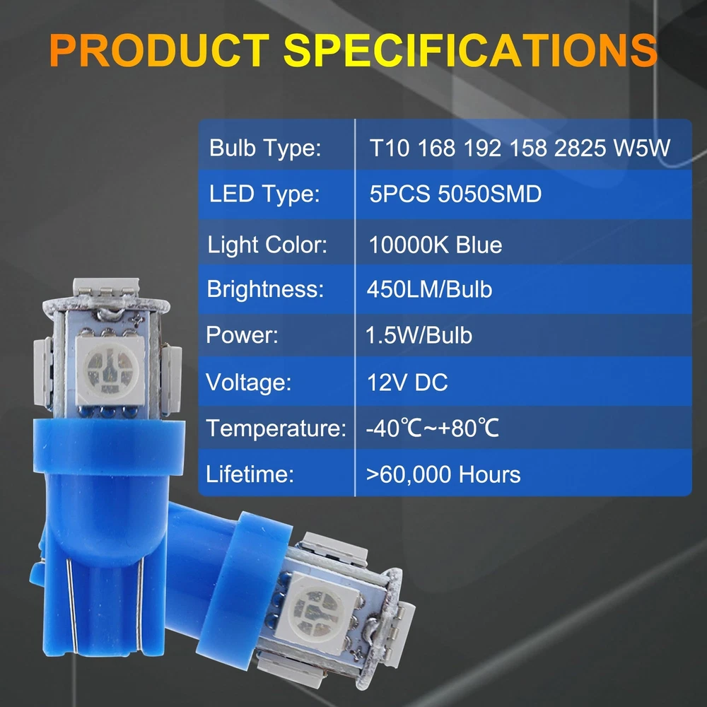 Bulb Life Hours: Up to 6,000 Hours Suitable For: Dome Light, Instrument Panel Light, License Plate Light Features: Road Legal Voltage: 12V Manufacturer Part Number: Does Not Apply gtin13: Does not apply To Fit: Instrument Panel Light Lighting Technology: LED Manufacturer Warranty: 1 Year UPC: Does not apply Placement on Vehicle: Front, Rear Light Color: Blue Type: Light Bulb Number of Bulbs: 10 Wattage: 2.5W Color Temperature: 10000K Material: Plastic Dimension: 1.97x3.15x1.18in(5x8x3cm) Fitment: 2010|Cadillac|CTS|Base Sedan 4-Door|3.0L 182Cu. I Bulb Fitment Code: T10 168 194 Brand: DYNITX OE/OEM Part Number: T10 147 152 158 159 161 168 175 184 192 193 194 W5W