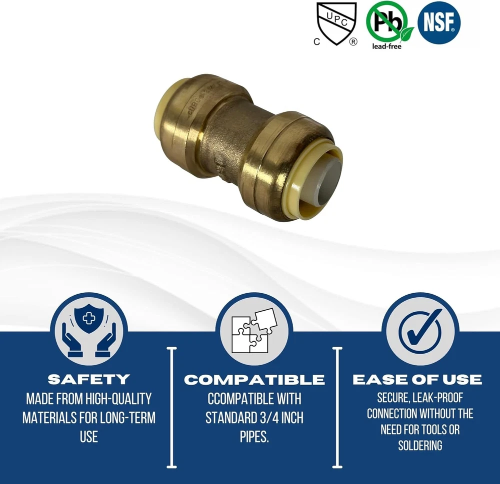 100% Money Back Guarantee if you are not satisfied with your purchase! ____________________ Description: 10 Pcs. XFITTING 3/4" Push Fit Coupling ● PUSH FIT easiest and fastest way to join copper, CPVC or PEX pipe in any combination. ● LEAD FREE brass body. Foundation of a strong, corrosion resistant, durable fitting. ● Certified to ANSI-61/NSF, Max pressure: 200psi/Max temperature: 200F. ● Approved to be used underground and behind walls without access panels. ● 3/4" Push Fit x 3/4" Push Fit Coupling, Straight. 100% Money Back Guarantee: We offer 30 Day Money Back Guarantee from the day you purchased if you’re not satisfied with your product. If you have any questions about our products, please contact us as soon as possible. Customer satisfaction is our absolute priority. Shipping: We are always working hard to ensure your package arrives as soon as possible. Please understand that some factors like weather, high postal traffic, and the performance of shipping companies are outside of our control. We offer free shipping to the lower 48 states and ship within 3 business days of payment, usually sooner. We do not accept P.O. Boxes. Please provide a physical address. You will be notified via eBay messages as soon as your items ship. Delivery: We will ship out the item in 2-3 working day after receiving the payment. Usually the delivery takes 2-5 business days. If you don't receive the items after 10 days, please feel free to contact us. You will get a replacement or a full refund. Please DO NOT open a return request or leave negative feedback without asking for help. Returns (Get Free Return Label): We offer a 30-Day Return Policy on defective/wrong items or items which you are not completely satisfied with. You have the option for a full-refund or an exchange of the item. No need to buy eBay return label. Contact us via eBay messages and get free return label. Returned items must be in all of the original packaging and include all of the original accessories or items that came with it. The item and package should be in original condition. Contact Us: Any queries or issues incurred, please feel free to contact us via eBay message, we will get back to you within 24 hours. Please DO NOT open a return request or leave negative feedback without asking for help. Feedback: Your feedback is very important to us. After you get your package and you are satisfied with our service, please leave us positive feedback. We are highly appreciated for your POSITIVE feedback and 5 stars. Enjoy shopping.
