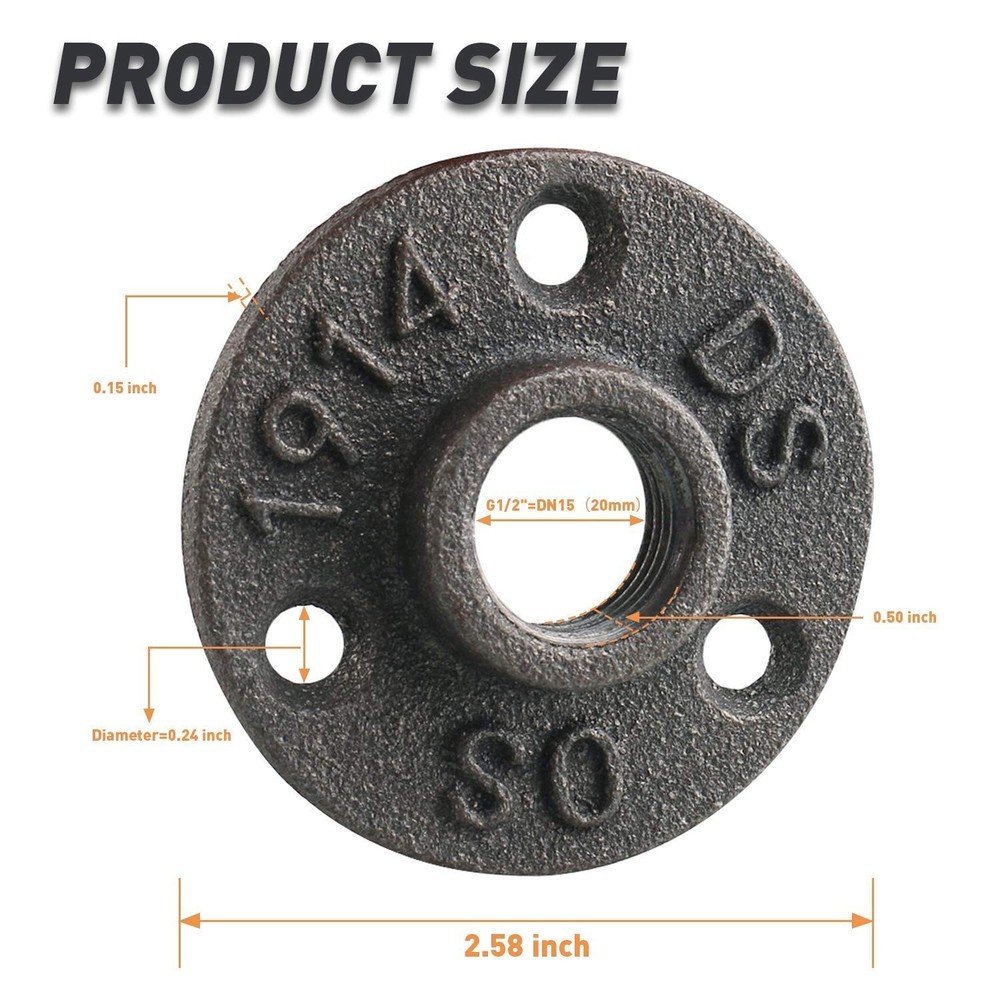 10 Pack 1/2" Malleable Iron Pipe Flange Floor Fittings with Threaded Hole NEW Product Details Size: 0.5 Inch UPC: 726672039222 EAN: 0726672039222 MPN: Does not apply Size: 0.5 Inch Material: Iron Color: Gray Connector Type: Tee Exterior Finish: Sandblast Thread Type: NPT Item Weight: 16 ounces Number of Pieces: 10 UPC: 726672039222 Item Weight: 1 pounds Package Dimensions: 7.91 x 7.44 x 1.69 inches Item Package Quantity: 1 Measurement System: inch Batteries Included?: No Batteries Required?: No Ultra-Durable Quality with 100% tested: When selecting furniture pipe fitting for your home, Home TZH pipe and fittings are the way to go. Our durable black iron fittings are 100% tested and protected right at the factory. Home TZH Floor Flange of high quality close bite and will not get loose after long time use. Our Pipe Fittings can prove functional & elegant throughout the years. Wide Application: Our pipe fittings come in 10 Packs for vintage furniture, DIY project and shelf hanging decoration applications in your home. Floor flange pipe fittings are perfect for DIY projects. Can be used to make pipe furniture, pipe clothing racks, pipe shelving, pipe table legs, industrial decor, etc. Constructed with extremely durable material, our cast iron pipe fittings work great without sacrificing functionality. Without DIY Difficulty: Home TZH Industrial pipe flange comes with three standard holes allowing you to secure your flange to floors or walls. The floor flange is suitable for all kinds of surface application. Put this up in minutes. You can install the pipe fittings with easy to follow directions. Fix a wooden board with floor flange, than fix the whole bracket to the wall with screws and screw holder. Your Personal DIY Style: The simple and industrial design complements traditional and contemporary decor. Because of its industrial malleable iron material and rustic design, it will bring your house or store a Loft Retro Industrial charm. Home TZH pipe flange decoration combined with a little creativity can go a long way to update a lavatory without breaking the wall. If there are any quality issues. Contact us at any time and we will give you a satisfying answer. Just take a chance of our floor flange and we promise that you will not be disappointed.