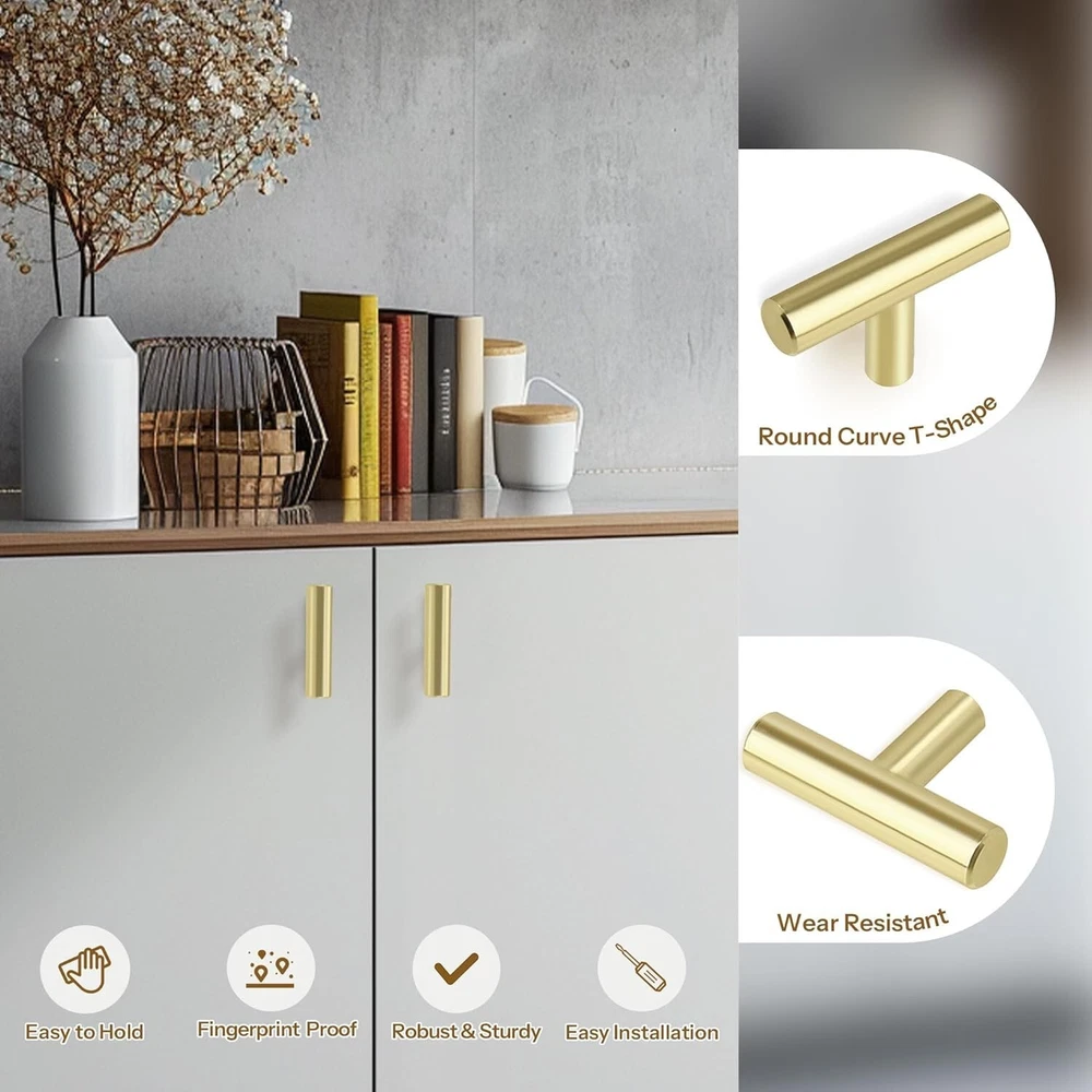 10 Pack 2 Inch Kitchen Knob Handles Brushed Brass Cabinet Pulls Gold Drawer (Free & Fast Shipping) 10 Pack Gold T-Bar Cabinet Knobs – Elegant & Durable Brushed Brass Drawer Pulls for Cabinets, Dressers & Closets ✨ Transform Your Home with Sleek, Modern Cabinet Knobs! ✨ Looking to refresh your kitchen cabinets, dressers, or closet doors with a touch of luxury? These brushed brass T-bar cabinet knobs are the perfect upgrade, adding a modern yet timeless aesthetic to any space. With their sturdy aluminum alloy construction, smooth texture, and easy installation, they’re designed to offer both style and functionality for years to come! ⭐ Premium Quality & Sophisticated Design Crafted from high-grade aluminum alloy, these gold cabinet knobs are built for durability and long-lasting performance. The brushed brass finish provides a sleek, modern look, while the smooth, rounded edges ensure a comfortable grip without any sharp corners. Rust-resistant and wear-resistant, these knobs maintain their shine and strength over time, making them ideal for both residential and commercial use. 📏 Perfect Size & Versatile Application These 2-inch gold drawer pulls are designed to fit a variety of furniture styles and sizes, from kitchen cabinets to wardrobe drawers. Whether you're upgrading a modern, contemporary, or classic space, these versatile handles blend seamlessly with any decor. ✔ Overall Length: 2 inches (50mm) ✔ Height: 1.25 inches (32mm) ✔ Diameter: 0.5 inches (12mm) ✔ Single Hole Installation for a clean, minimalist look 💡 Ideal for ✅ Kitchen Cabinets & Drawers: Enhance your kitchen with a luxurious gold touch ✅ Bathroom Vanity: Upgrade your bathroom storage with stylish and functional handles ✅ Closets & Wardrobes: Add elegance to bedroom furniture and closet doors ✅ Office & Study Desks: A chic upgrade for office furniture and home workspaces ✅ TV Stands, Shoe Cabinets, and More! 🔧 Hassle-Free Installation – DIY Friendly! No need to hire a professional—install these cabinet knobs in minutes! 1️⃣ Mark the installation spot 2️⃣ Drill the necessary hole 3️⃣ Secure the knob using the included screws That’s it! A simple and effortless way to instantly transform your space. 💎 Why Choose These Gold Cabinet Knobs? ✔ Elegant & Timeless Design: A perfect blend of modern and classic aesthetics ✔ Durable & Rust-Resistant: Made from premium aluminum alloy for long-term use ✔ Smooth & Comfortable Grip: Rounded edges prevent scratches and ensure comfort ✔ Multipurpose & Versatile: Ideal for kitchens, bathrooms, offices, and more ✔ Quick & Easy Installation: Comes with screws for a seamless DIY setup ✨ Give Your Cabinets a High-End Designer Look! A simple upgrade like these brushed brass cabinet knobs can make a huge impact on your home's aesthetic. Whether you're remodeling your kitchen, revamping a vintage dresser, or adding a touch of elegance to your wardrobe, these handles will elevate your space effortlessly. 🔹 Premium craftsmanship, elegant finish, and a modern touch everything you need for a stylish home!