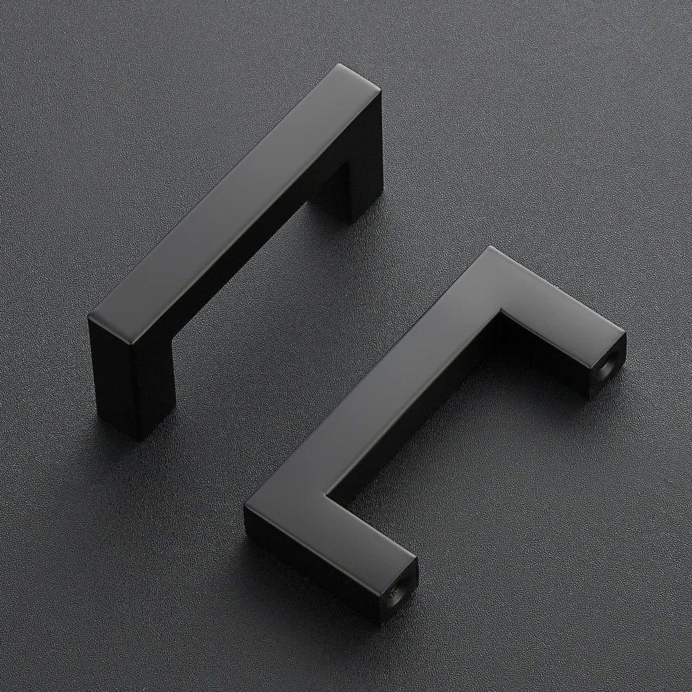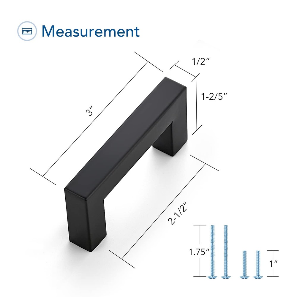 aims at taking the best home revitalization experience to our customers. Product Features: STURDY AND ROBUST: These black cabinet pulls are made of high-quality, strong and robust stainless steel. The deep threaded design makes the handle difficult to loosen and therefore fall off. GENTLE TOUCH : The smooth surface of these matte black square cabinet handles brings you a feeling of comfort and the gripping distance is appropriate, the drawer can be removed easily and effortlessly when the drawer is heavy. MODERN SQUARE DESIGN : The simple and modern design of the satin nickel square wardrobe handle is ideal for different styles of cabinets: kitchen cabinets, bathroom drawers, bedroom cabinets, etc. These handles will give your kitchen cabinets a clean and finished look. Safe Material: The composition is safe, allowing you to place the cabinet door handles anywhere within reach without any concerns MEASUREMENT: Screw-hole Center: 2-1/2inch(64mm), Overall Length: 3inch(76mm), Width: 1/2in (12mm), Height: 1-2/5 inch(35mm) STURDY AND ROBUST: These 2-1/2 inch matte black cabinet pulls are made of premium and strong stainless steel. The deep threaded design makes the black cabinet handles difficult to loosen and therefore fall off MODERN SQUARE DESIGN: The simple and modern design of the matte black square drawer pulls for cabinets is ideal for different styles of cabinets: kitchen cabinets, dresser drawer, bathroom drawers, bedroom cabinets door, etc. These handles hardware will give your cabinets a clean and finished look EASY TO INSTALL: cabinet pulls come with detailed installation instructions, equipped with a screwdriver and two different sizes of screw (2 pcs *1" screws and 2 pcs*1.75" detachable screws), making installation easy and fast
