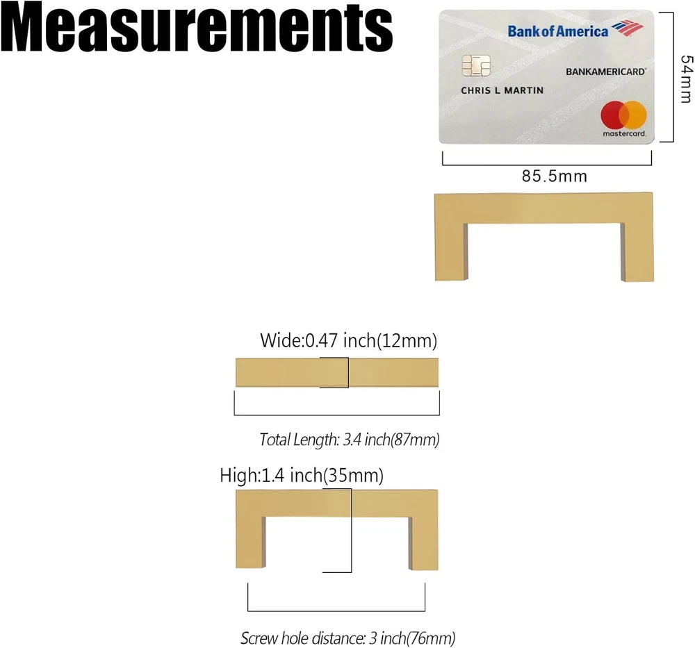 【Cabinet Pulls Description】 Kitchen hardware for cabinets made of high quality Metal, rust-proof, anti-corrosion, non-toxic heavy-duty solid cabinet pulls. It’s easy to clean and install. 【Size of Cabinet handles】 Hole Centers(CC): 3"(76MM); Overall Length: 6.4"(162MM); Projection: 1.4"(35MM) from the surface to the bar; Width: 0.6"(14MM); 【Included Screws】 Tip1:Includes 1"(25MM) & 1.77"(45MM) screws (You can DIY the screws size according to the door thickness);Tip2:Please measure your cabinet hole centers is 5" before you purchase cabinet handles. 【Cabinet Hardware Widely Compatible】 Fits for any purpose, such as kitchen cabinet, drawer, dresser, closet, wardrobe, cupboard, bookcase,shoe cabinet etc. 【Risk-Free 365 Days Trial】Coinkoly kitchen cabinet handles is committed to high - quality products and services, If you have any questions, please feel free to contact us. Product Description
