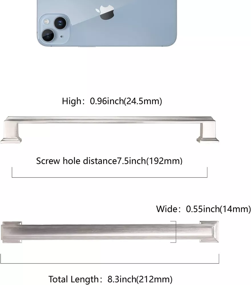 Product Description 10 Pack 7.5 Inch(192Mm) Brushed Satin Nickel Cabinet Handles Kitchen Cabinet Pulls Cabinet Door Handles Kitchen Cabinet Hardware Cupboard Drawer Pulls Dresser Handles Product Specifications: Hole Centers(Cc):7.5 Inch(192Mm); Overall Length:8.35 Inch(212Mm); Width:0.55 Inch(14Mm); Projection:0.96 Inch(24.5Mm); Please Double Check The Size Of The Handle You Need Before Purchasing. Wide Application: Drawer Pulls And Knobs Can Be Used In Kitchen Cabinets, Furniture Doors, Closets, Cupboards, Desk Drawers Or Closet Drawers Where Silver Cabinet Pulls Are Required. High Quality Cabinet Hardware: Kitchen Cabinet Pulls Are Made Of High Quality Zinc Alloy For Better Quality, More Corrosion Resistant, And The Deep Thread Design Makes The Handles Less Likely To Loosen And Fall Off. Carefully Packaged: Each Pull Is Individually Pocketed And Comes With Two Sizes Of Mounting Screws, And The Long Size Screws Can Be Sub-Cut To The Desired Size For Easy Installation. Carefree After-Sales Service:We Are So Confident That You Will Love Handles That We Are Willing To Offer You A 100-Day Trial, And If You Are Not Satisfied With Anything, We Can Always Offer You A Return. About Us We are a reputable seller with many years of experience selling on eBay. Our goal is to provide high-quality products and excellent customer service. Shipping Items will be shipped within 1-3 business days when we received payment. (Orders are not processed on weekends & holidays) Tracking information will be sent once item is shipped. Delivery time depends on destination and other factors Item is shipped to ebay address. Leaving correct address can minimize delay. For international shipping and shipping to Guam, Hawaii and Alaska, Please contact us before placing the order. International buyers please note: Import duties, taxes and charges are not included in the item price or shipping charges. These charges are buyer’s responsibility. We will try our best to reduce the risk of the custom duties. Local pick-up is unavailable at the moment. Contact Us We reply any email messages within 1 business / working days(off-duty at weekend). If you do not get a response from us, then please check your junk or spam mailbox. Our Business hours: Mon-Fri 9:00-18:00, UTC/GMT +8 hours. Please contact us either by clicking "contact seller" in the "purchase history" section or simply click "ask a question" at the bottom of this page. If you are unsatisfied with our item or service, please contact us before leaving any feedback. We are committed to resolve all issues in a friendly and satisfactory manner.