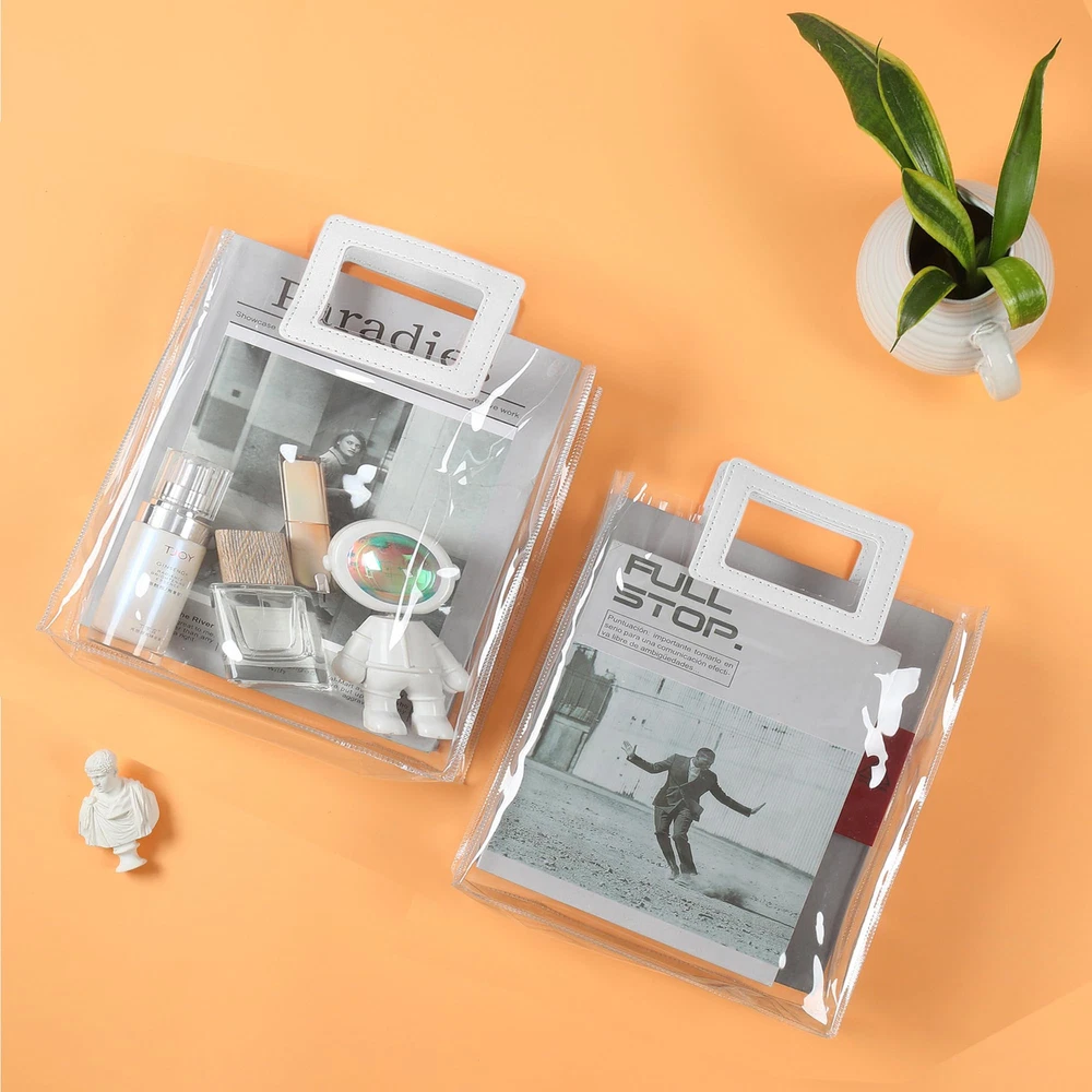 Size and Quantity: The package contains 10 clear gift bags with handles, each measures 8"x 3.1"x 8"/ 20x8x20 cm, portable size for your convenience, for your daily shopping needs, ideal size to hold party favors or gifts. Resistant Material: Our clear gift bags are made of polyvinyl chloride, thick and easy to carry, waterproof, easy to wipe, collapsible, easy to store, reusable and durable! The transparent design allows you to easily see the gift you are giving! Strong PU Handle: The white handles are made of PU material, which is stronger and more durable than ordinary handles, and can hold more weight. White handles add color to the transparent bag, making it look less monotonous and more sophisticated! Square Design: Square pull handle design for better usage, carry things more convenient, square bag body, can stand, not easy to crooked. Elegant and stylish, this clear shopping bag will make you stand out from the crowd and catch everyone's eye! Wide Application: Our clear gift bags can be used as gift bags, retailer bags, shopping bags, DIY craft bags. Perfect suitable for groceries, parties, weddings, baby shower, celebrations, festivals, bridal shower, Christmas, fashion items.