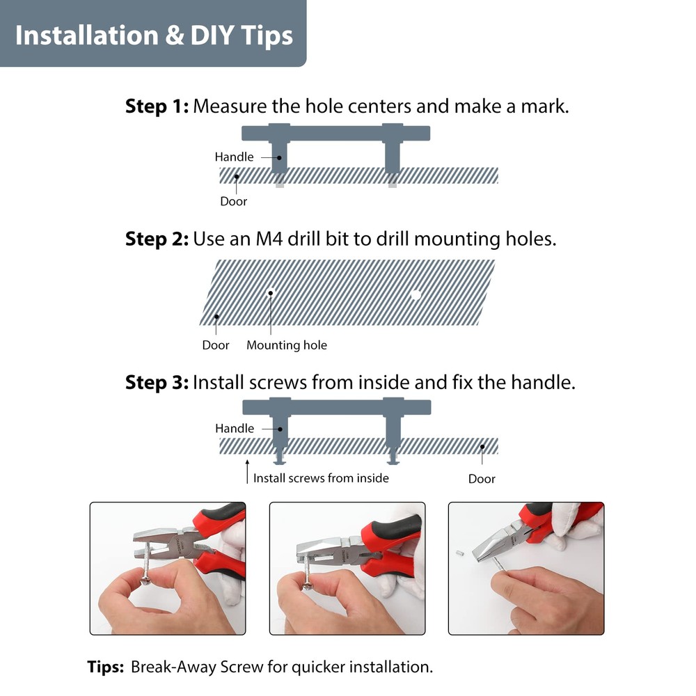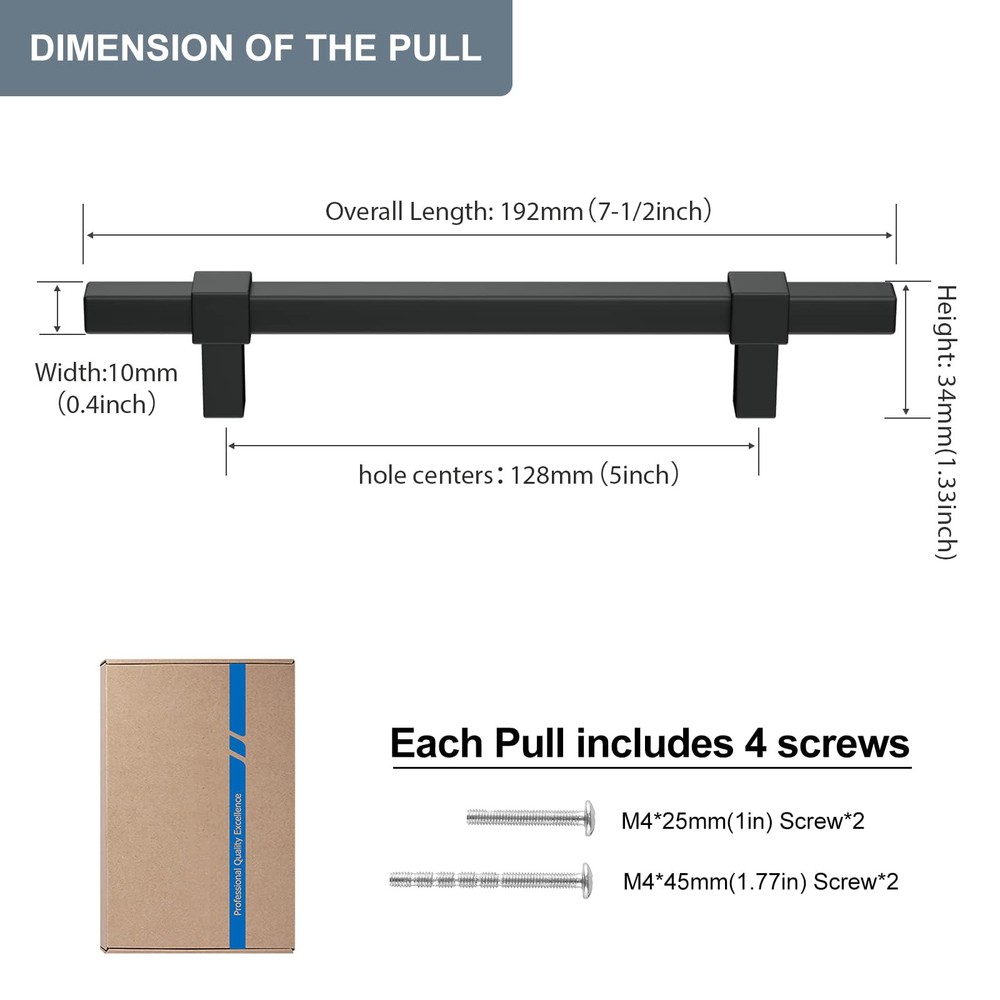 365 Days After-Sales Service: is committed to providing premium cabinet handles to customers and excellent . We will replace pulls for free or give you if any quality issues within 365 days. Package Include: 10 pack black pulls, each black cabinet pull is individually packaged to prevent scratching the surface of pulls. Each cabinet handle is equipped with two size screws (1 inch & 1.77 inch). Premium Material: The cabinet handle is made of high quality stainless steel and zinc alloy, with classic matte black flat finish. Drawer pulls' surface has been specially treated to prevent rust and fade, and has a longer service life. Measurement: Hole centers: 5inch(128mm), Overall length: 7.5inch(192mm), Height: 1.33inch(34mm), Width: 0.4inch(10mm). Please measure hole center of your old cabinet pull before purchasing. Widely Used: The bar cabinet handle is simple and fashionable. Add simple black pulls to your furniture to create a more linear appearance. The cabinet hardware is suitable for kitchen cabinet, cupboard and dresser drawers.