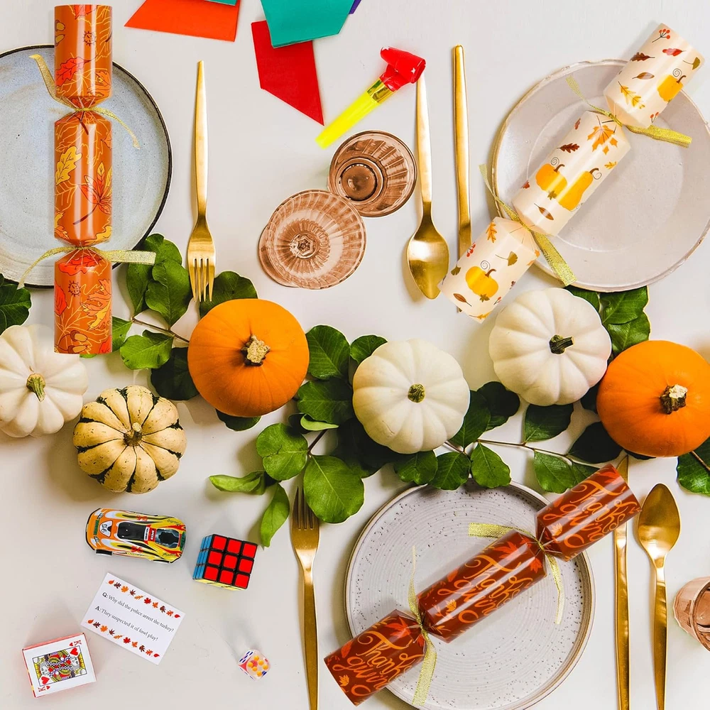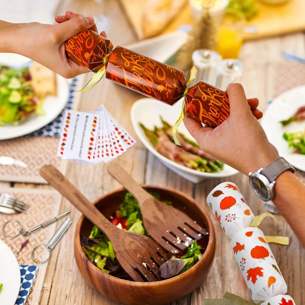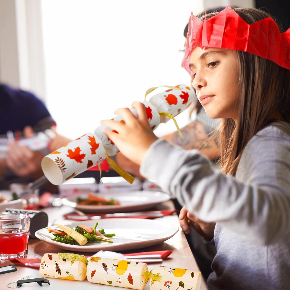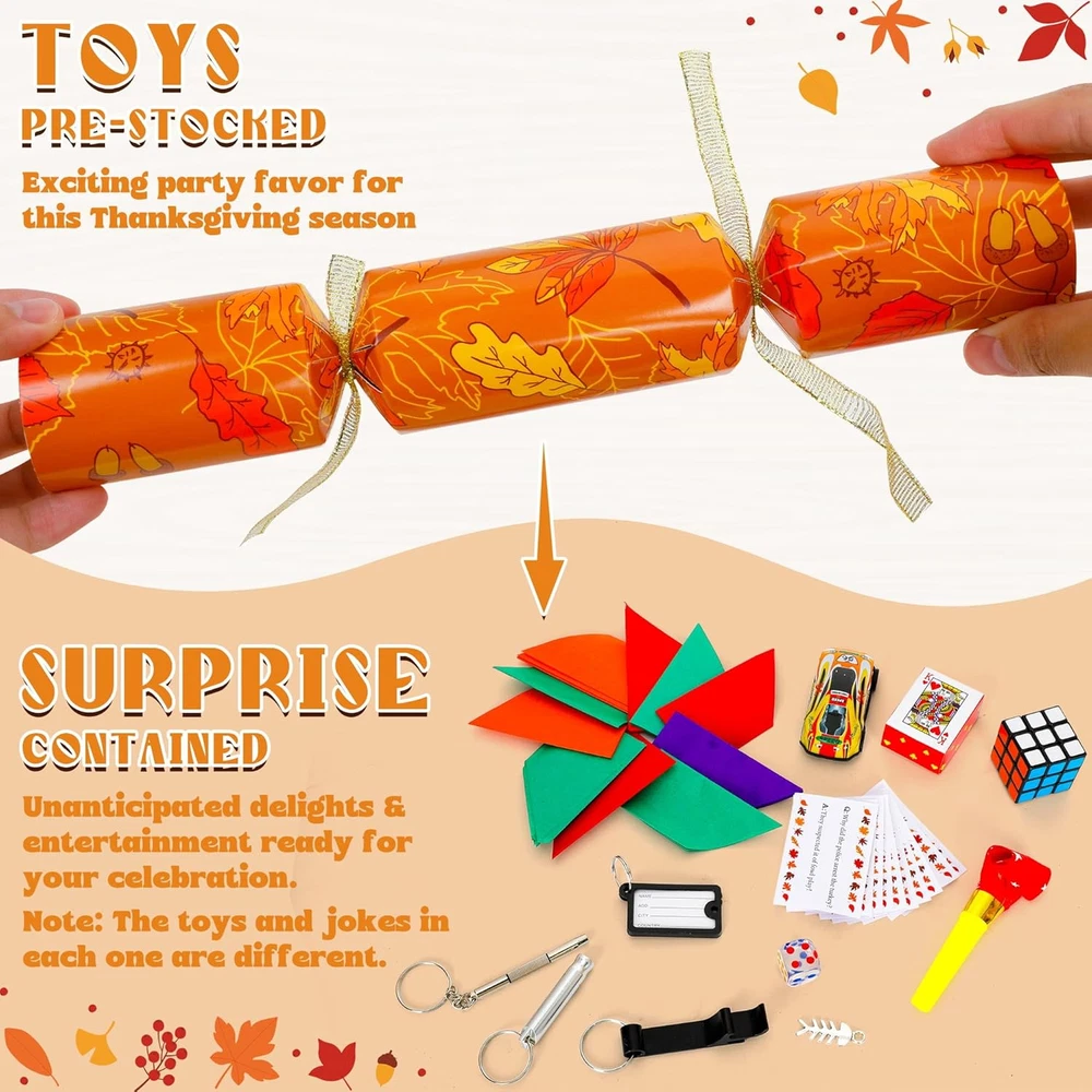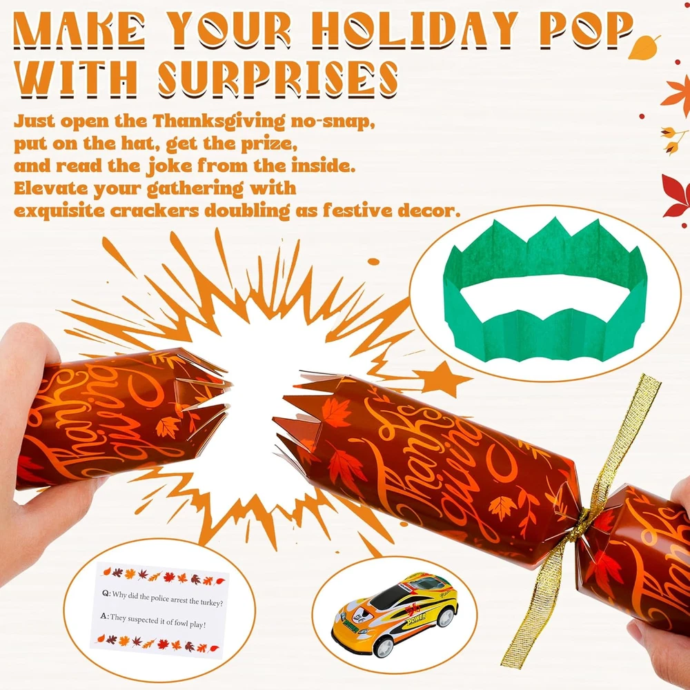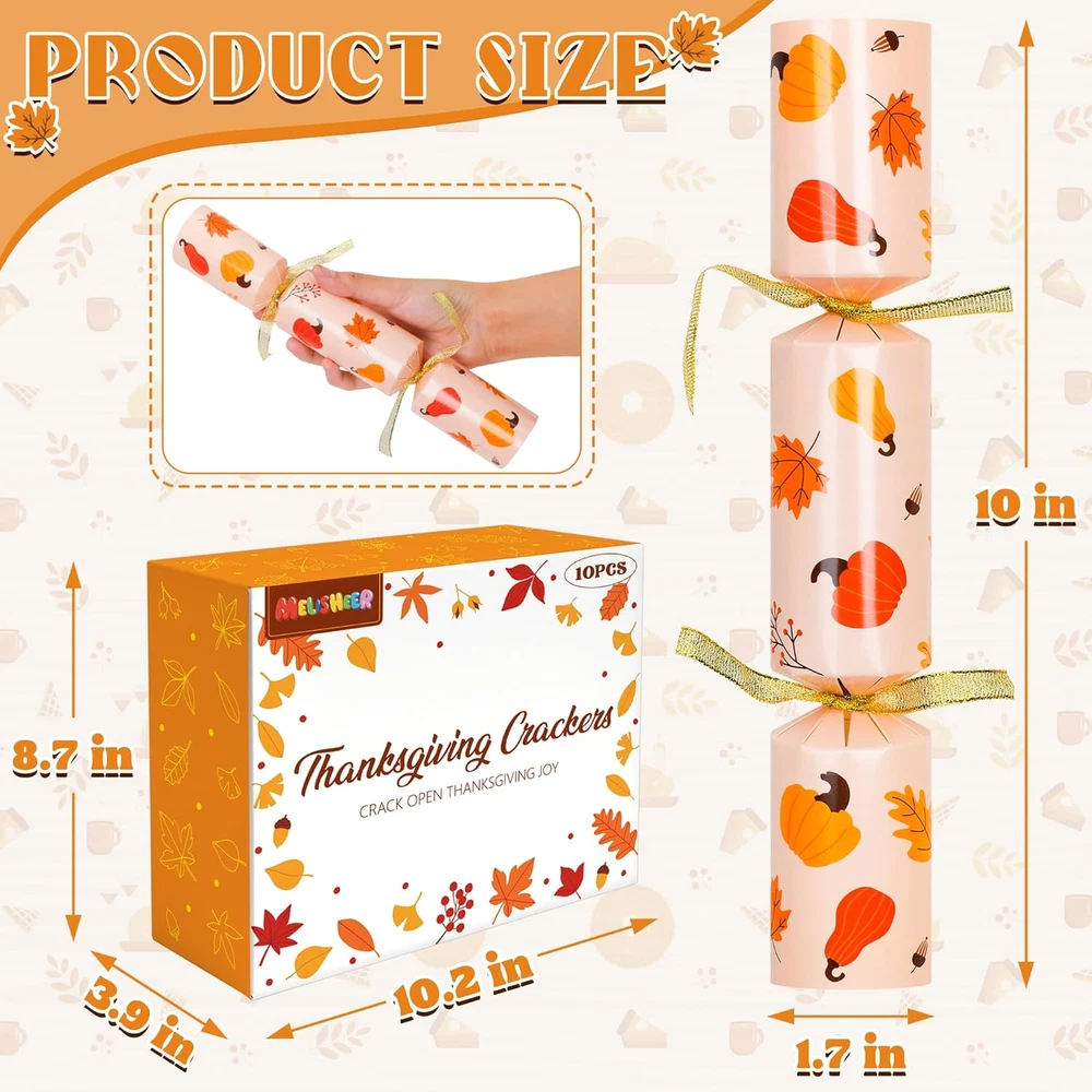 Store New Arrivals Add to Favorite View Feedback Contact Fast deliveries to the customer's home Quality customer service John Make the customers happy! 10 Pack Thanksgiving Party Favors, Leaf Design Thanksgiving Crackers, No Snap Party Table Favor Set with Joke Dice & Gifts, Traditional Thanksgiving Holiday Cracker for Kids Adults Description Great Value - Our Melisheer Thanksgiving party favors set includes 10 no-snaps crackers in five designs. Each cracker has a Thanksgiving joke, a party hat, and a surprise gift Perfect for Parties - These Thanksgiving crackers add color and fun to your table settings and are typically opened before eating. They're a great way to start any celebration and give guests a keepsake to remember the day Unique Designs - Featuring autumn-themed designs like maple leaves and pumpkins, these party favors are fun and eye-catching. They come in a beautiful gift box, making them great for family gatherings or as gifts for friends and family on Thanksgiving Safe Materials - Made from high-quality materials, these table favors and their gifts are perfect for everyone, from friends to coworkers Enjoy Together - Each cracker contains a festive joke, a paper hat, and a fun gift, making for memorable moments with loved ones during Thanksgiving Add Fun to Your Thanksgiving Table with Melisheer Party Crackers! Celebrate this Thanksgiving with Melisheer’s set of 10 festive party crackers, each filled with a joke, a party hat, and a surprise gift. Perfect for family gatherings, these crackers feature charming autumn designs and are a delightful way to enhance your holiday decor. Features: 10 Festive Crackers: Each pack includes 10 crackers with unique fall-themed designs. Surprises Inside: Discover a joke, a colorful party hat, and a special gift in each cracker. Quality Materials: Made with high-quality, safe materials suitable for all ages. Perfect for Any Thanksgiving Event: Perfect for decorating your table or as gifts for guests. Create Memorable Moments: Kick off your Thanksgiving meal with a pop! These crackers are not only a fun decoration but also a great way to create lasting memories with friends and family. Item Dimensions 10 x 1.7 x 1.7 inches Unit Count 12.0 Count Age Range Description All age people Color Orange Material Paper Material Type Paper Item Weight 0.35 Ounces Theme Thanksgiving Occasion Thanksgiving ABOUT US We offer the best prices around on high quality products. Our E-store includes media such as books, movies, music and games while offering electronics, toys, sporting apparel, clothing, tools, general home, garden items and more. SHIPPING We are always working hard to ensure your package arrives as soon as possible. Please understand that some factors like weather, high postal traffic, and the performance of shipping companies are outside of our control. We offer free shipping to the lower 48 states and ship within 2 business days of payment, usually sooner. We do not accept P.O. Boxes. Please provide a physical address. For shipping outside of the continental USA, we only use eBay's Global Shipping Program. The item is shipped to KY and then sent to the rest of the world. International customers are responsible for all duties and taxes. Continue to 'check out' to calculate costs for shipping the item to your country. Messages regarding eBay's Global Shipping Program MUST be directed at eBay EXCLUSIVELY. RETURNS We offer a 30-Day Return Policy on items in which you are not completely satisfied with. You have the option of a full-refund or an exchange of the item. No returns are available on items shipped outside of the USA PAYMENT We accept PayPal. CONTACT US This page content is yet to come Please ad us to your favorite seller and visit again later Thank You CUSTOMER SATISFACTION We try our very best to make sure every customer is completely satisfied. If there's a problem, message us! We're happy to help. WE ACCEPT