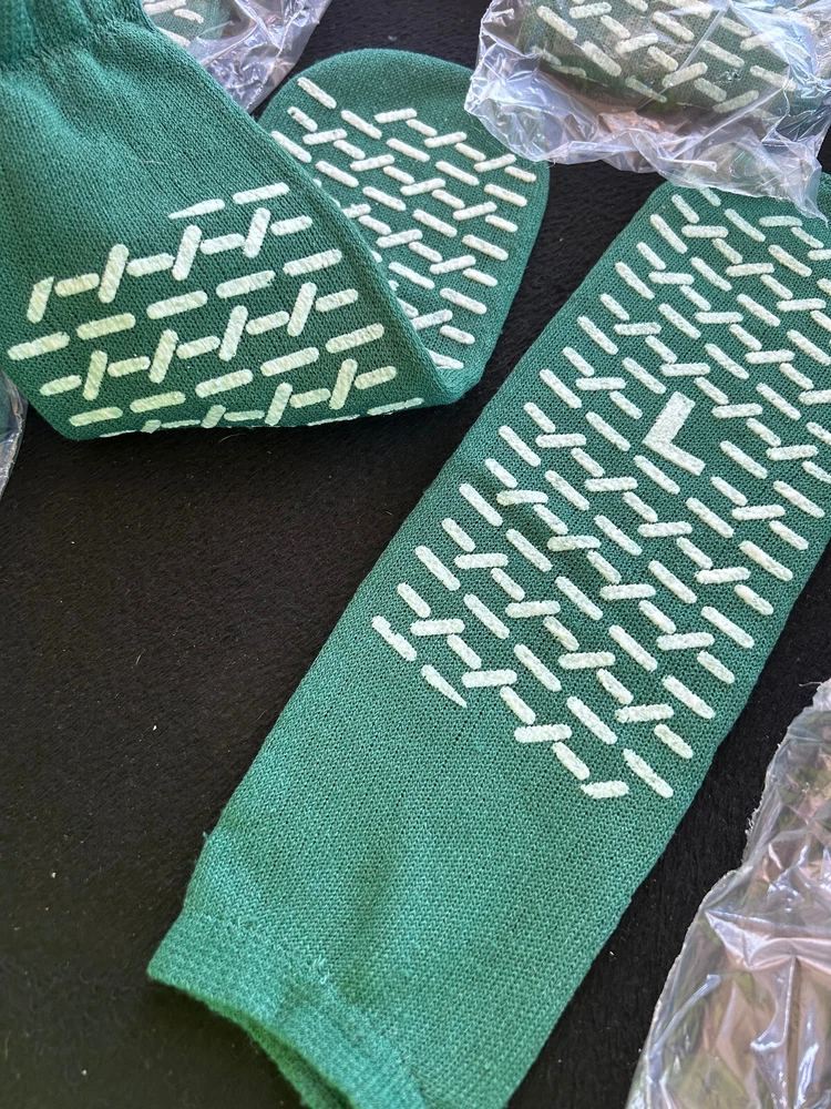 10 qty Pairs NEW Fluffy Green Machine washable - 10 Pairs of POSEY Medline Non Slip Socks, Anti Skid, Hospital Socks, Double Sided Grip for easy use, Large Size low ankle garment -NEW This are universal for Hospital Grade but can be used in Sports, Yoga, Home-care, nursing home care, etc etc.