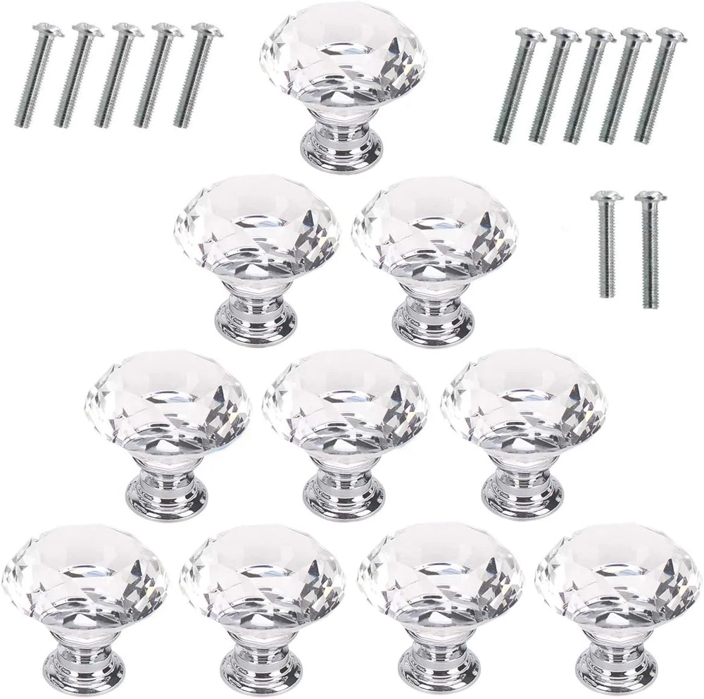 MATERIAL: Clear cut crystal glass and alloy base, shiny polished chrome, glittering and sparking, diamond shape, good decoration for your home or office. SIZE: Screw Thread Length:0.8 inch Height:1 inch Diameter: top 1.3 inches bottom:0.6 inch APPLICATION: Fit for cabinet dresser drawers cupboard wardrobe bookcase etc,give your furniture a sparkly new looking. INSTALLION:Easy to install. Find the position where you want to install on the board and drill a hole , then pass through the screw from the back of board anf thread tight to the knob. Be careful during the work. ATTENTION:Please use this knobs with the objects that thickness is not over 1 inch. CAN'T REFUSE THE REASON -The crystal knob is very pretty artistic and durable,ideal for installed cabinet,wardrobe,dresser,drawers,bathrooms,cupboard, bin,wardrobe,newborns room ,armoire,nightstand,large jewelry stand box/drawer hutch redo etc. -You will be surprised after you install it.They looks pretty,sparkly, gorgeous,stunning ,cute adorable feminine touch to any room,Children and ladies at home will be happy it,when the sun shines in the room, they throw prisms of light everywhere! -The knob has high crafts,sturdy and touches very comfortable.It is easy to install with home little tool. FEATURES: 1.Brand:AKStore 2.Material: High-quality Crystal glass and aluminum 3.Size: Screw Thread Length:0.8 inch Height:1.0 inch Diameter: top 1.3 inches bottom:0.6 inch 4.Color: Package include: 10 X Crystal glass handle 10X Screw AFTER SERVICE: -Upon receipt of our products, if you are not 100% satisfied with the quality or concerned, Please contact us,We will try our best to solve it.no-questions-asked money back guarantee and top-notch customer service. -Our belief is that the interest of our customers comes first. So, we will do everything we can to protect your interest. -Thank you for visiting our shop, welcome to visit next time.