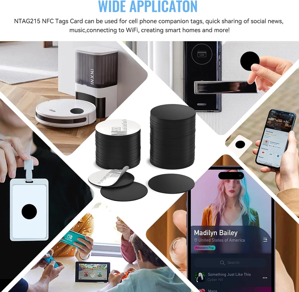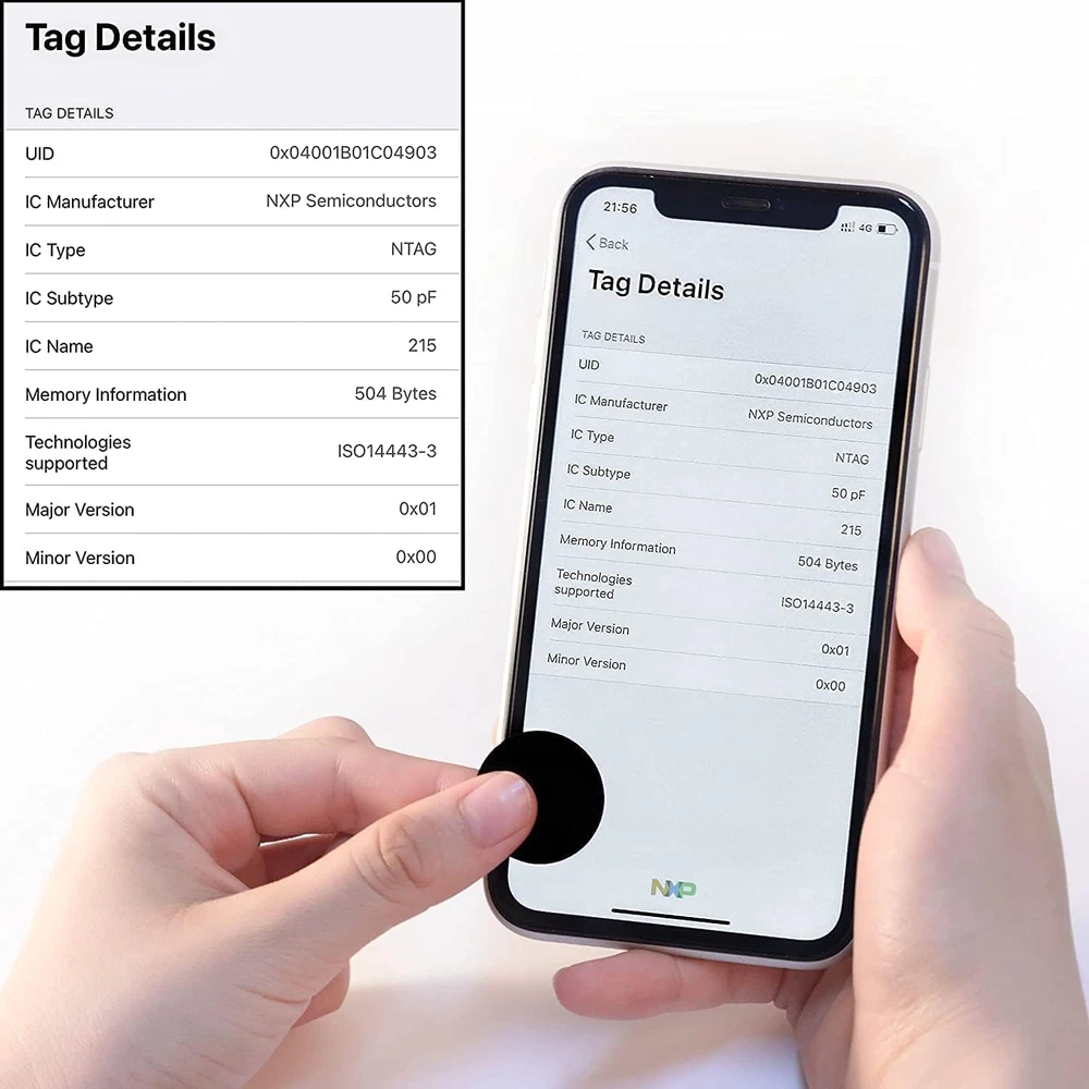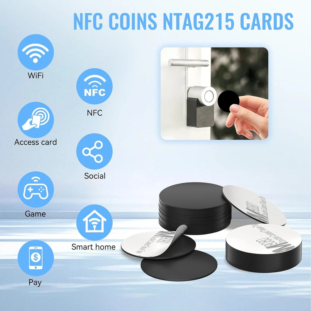 Small NFC Coins: The package contains 10 pcs black NTAG215 NFC tags, diameter 25mm/1 inch, each round NFC card comes with an adhesive back for easy attachment. Small and portable to carry. The quantity is just the right amount for fun and needs; good choice as a small gift for your friend or family. Quality NFC Tags: Thoughtfully designed and rigorously tested, constructed with durable, waterproof new PVC material while abrasion-resistant and non-toxic. with adhesive back for easy fixing, our black NFC tags stickers can be placed virtually anywhere and even if near water without the risk of losing functionality. Note: it is not suitable for use in strong magnetic environment. Wide Application: Compatible with TagMo and most NFC-enabled Android phone & devices, you are able to write the NFC 215 tag easily and make a tag for any weapon, pet, mount or fashion item you want. Quickly share your social messages, music, connect to WiFi,business card, URL, text, authentication purposes, ect. The NFC cards are rewritable, which means you can use them over and over again to store different data and information (for amiibos can only be edited once and cannot be reused). NTAG215 Chip: High quality NTAG215 NFC Chip, with 504 bytes of available NDEF memory. Providing enough storage space, you can quickly write the information you want. It has a read-write lock function that makes the black NFC cards can be edited repeatedly or read-only, cannot be edited or reset after set as read-only tag. The black NFC tags can be read and written over 100,000 times. 【Note: Some iPhone Models can only read the NFC tag's data passively, and cannot actively write data.】 Hassle Free Warranty: We are confident that you'll love our NFC Tags. If, for any reason, you're not satisfied with the NFC sticker, we will issue you an exchange! Any questions, please do not hesitate to send the seller a message through Amazon and we will respond within 24 hours. Product Description NFC Coins Tags Specification NFC Chip: NTAG215 Working frequency: 13.56 MHz Protocol: ISO/IEC 14443A&18000-3 Diameter: 25mm / 1 inch Data Storage Time: >10 years Function: Read and Write( with self-adhesive ) Memory: 540 Bytes of Memory(504 Bytes Usable) Material: Brand new PVC, Antenna, and Ntag215 chip Quantity: 10 pcs, 30 pcs, 50 pcs and 100 pcs are optional Note: Cannot be used on metal surfaces and strong magnetic environment
