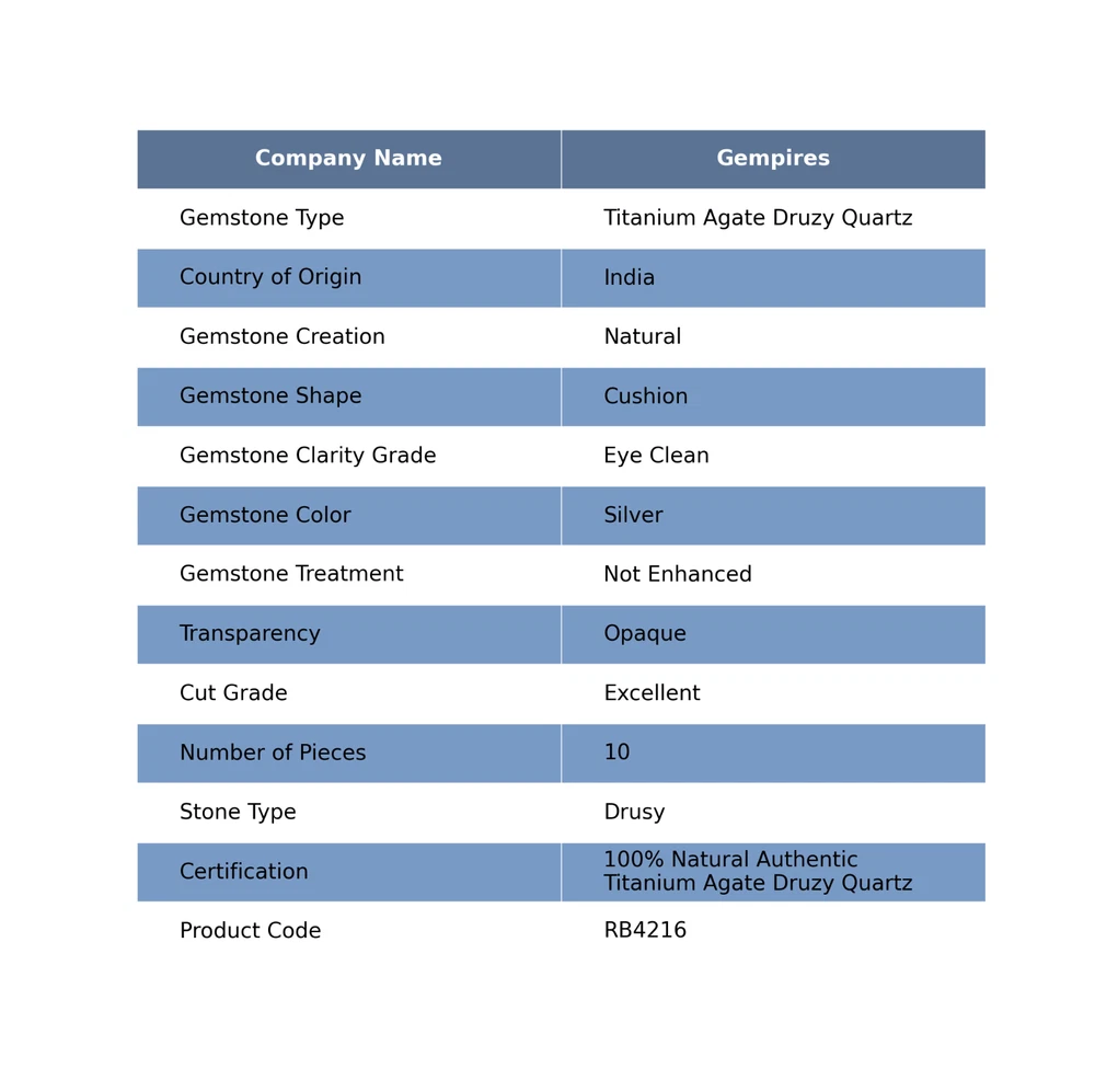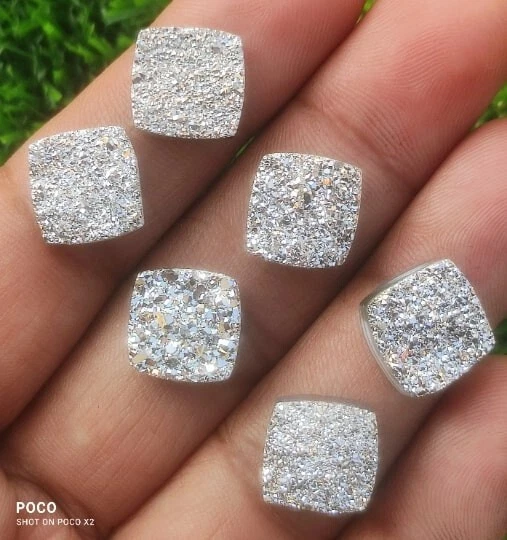 Gemstone Form: Drusy Brand: Handmade Gemstone Clarity Grade: Eye Clean Vintage: No Number of Pieces: 10 Gemstone Type: Titanium Agate Druzy Quartz Gemstone Creation: Natural Country/Region of Manufacture: India Country of Origin: India Certification: 100% Natural Authentic Titanium Agate Druzy Quartz Gemstone Shape: Cushion Gemstone Color: Silver Wholesale: Yes Cut Grade: Excellent Gemstone Treatment: Not Enhanced Transparency: Opaque