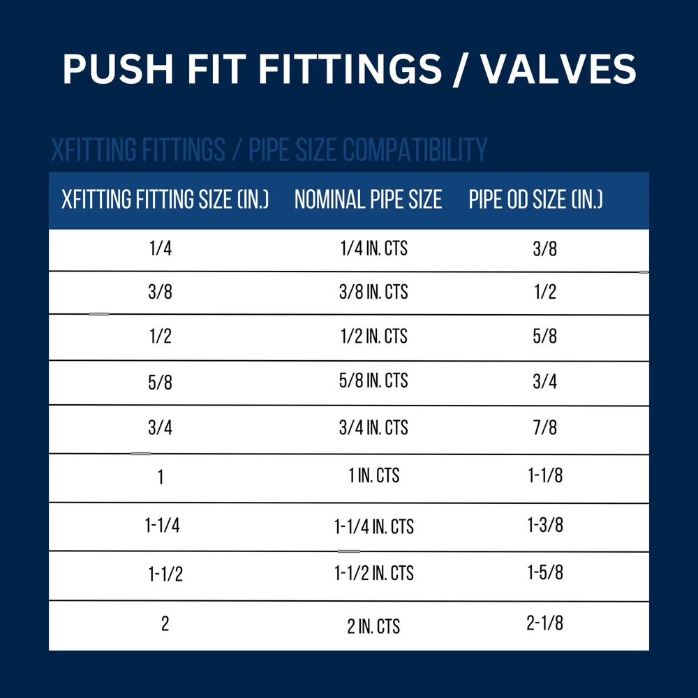 XFITTING Push-Fit connection system it's the easiest and fastest way to join copper, CPVC or PEX pipe in any combination - with no soldering, clamps, unions or glue. Just insert the pipe and the stainless steel teeth bite down and grip tight, while a specially formulated O-ring compresses to create a perfect seal. Just push connect by hands, within 1 minutes to finish installation, makes our life more efficient, fast, save time and strength and your money. Disassembly is just as fast using the simple disconnect tool. So fittings and valves can be easily changed and reused. They can even be rotated after assembly for easier installation in tight spaces. Get a grip on your next plumbing project. · Instant Push-Fit connection for increased ease-of-use. · No soldering, clamps, unions, or glue required. · Fits copper tubing, and CTS CPVC and PEX and connects all three types in any combination. · Integral tube liner for PEX installations, so no loose components, ensures secure, reliable connection. · Design certified and agency listed. · Compact, robust LEAD FREE brass body. Foundation of a strong, corrosion resistant, durable fitting. · Design certified to ANSI/NSF-61 and ASSE 1061 product standard· Approved to be used underground and behind walls without access panels. · Max presure: 200psi · Max temperature: 200F XFITTING PUSH FIT easiest and fastest way to join copper, CPVC or PEX pipe in any combination LEAD FREE brass body. Foundation of a strong, corrosion resistant, durable fitting. certified to ANSI-61/NSF Approved to be used underground and behind walls without access panels Max presure: 200psi/Max temperature: 200F