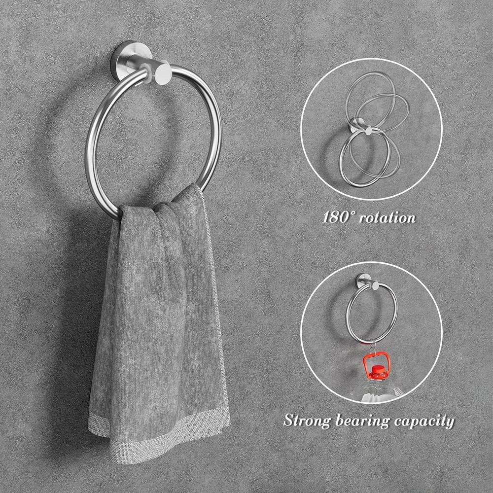 Product Description 4×Tower hook Very durable clothes hook, you can be use in Bathroom, wardrobe, vestibule, kitchen, behind the door, office ect. 2× toilet paper holder the toilet paper holders are nice, no problems with color letting off or scratching,friendly to your family. 2× Towel Bar 16 inch bath towel baris a perfect length, can hang your bath towel easily. workd great in your bathroom 2× Towel Ring beautiful appearance, with the plastic protect ring doesn't make squeaky noises. Installation is a breeze. Safe Design High-quality and Solid stainless steel Hidden screws Easy to maintain and keep clean Robust to bathroom elements Effortless to install Comes with everything you need in your bathroom Brushed Nickel Surface Features Wall mounted design for bathroom convenience and organization Brushed nickel finish upgrades any bathroom with its trendy and stylish appearance To clean and maintain the bath hardware, simply clean with a damp cloth,no need for any cleaner Unique round shape and concealed mounting hole add modern design to your bathroom. Installation steps, Requires perforation for installation