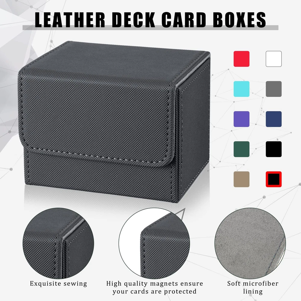 Adequate Quantity: you will receive 10 pieces deck game card boxes in 10 different colors, including blue, black, white, green, gasoline blue, black red, purple, gray, red, khaki; They are abundant quantities and diverse colors, which can satisfy your multiple storage needs Quality Material: the card deck case is made of PU leather, which is anti scratch and wear resistant, has a non slip surface, with hardcovers on the back and front, also with tight sewing thread, sturdy and tough, can be applied for a long time Safe Design: the deck card holder is designed with a seal locking lid with magnet closure, which can stay closed to safely store your cards; Besides, the lid is convenient for you to put in and take out the cards Size Information: the card box case measures about 4.13 x 3.54 x 3.15 inches, the proper size and large capacity can easily hold up to 100 sleeved cards, allows you to collect and store the cards as you like Widely Use: the card deck holder case can be applied to store a variety of cards, such as trading cards, game cards, sports cards, basketball cards, football cards, baseball cards, singer cards, transport cards, small photos, and more