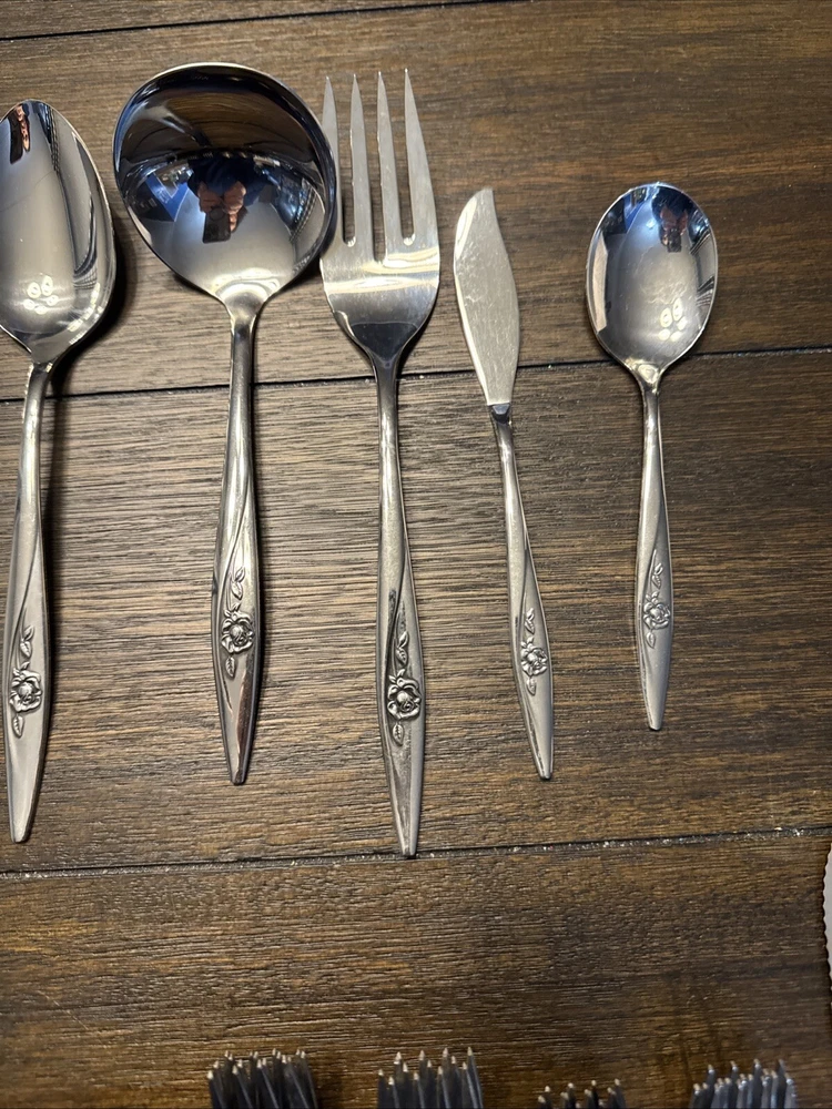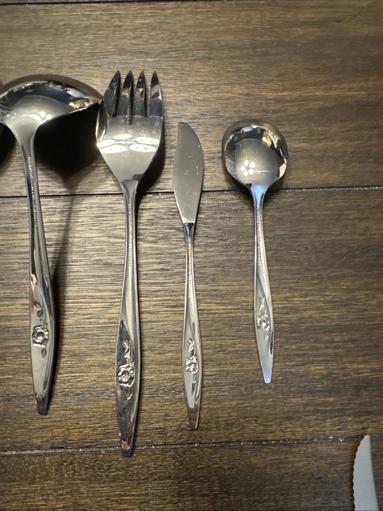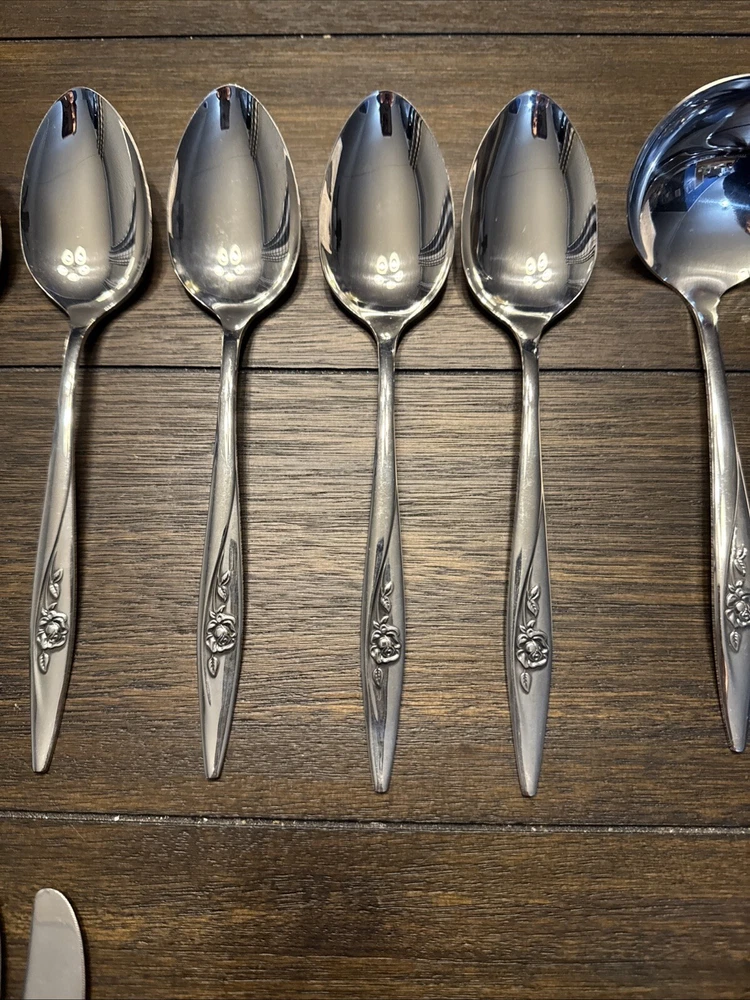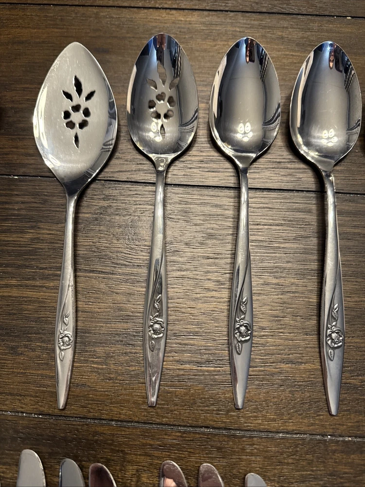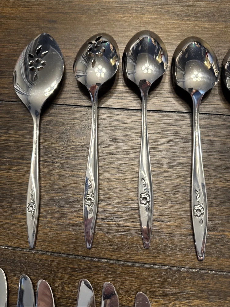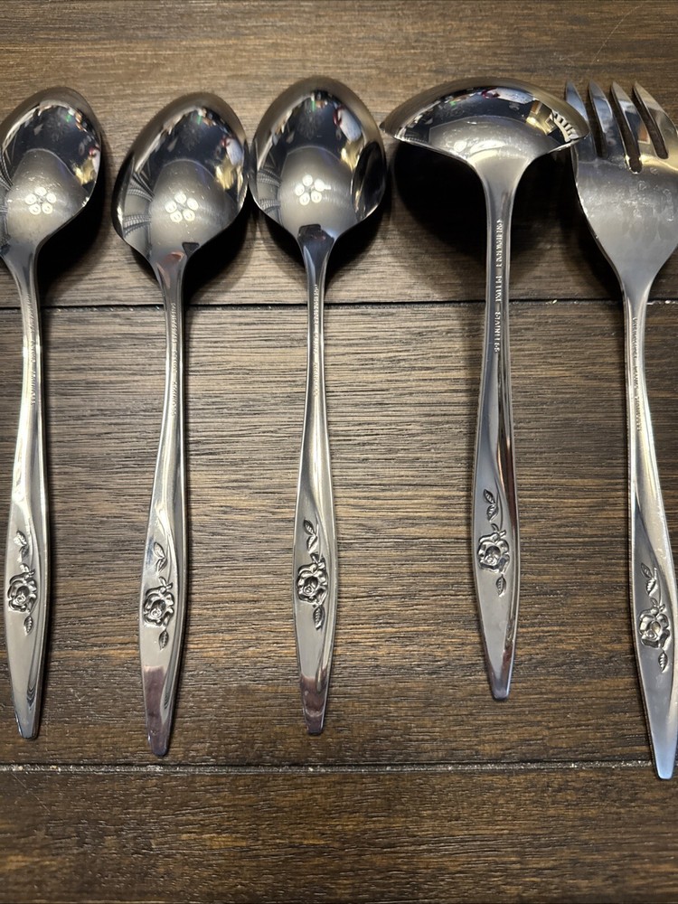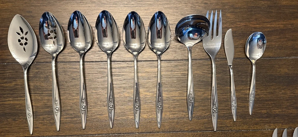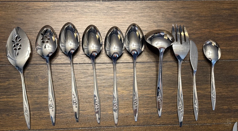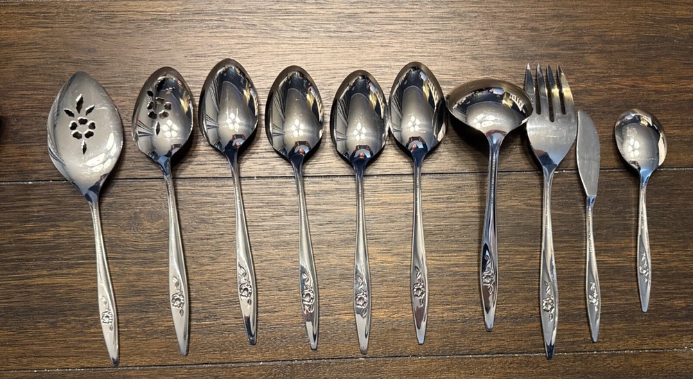 Elevate your dining experience with this exquisite set of 9 Oneidacraft Deluxe Stainless Serving Utensils. Each piece showcases a beautiful floral design in the handle pattern, adding a touch of elegance to any occasion. The set includes slotted spoon, cheese knives & spreaders, ladle, serving spoon, pie server, serving fork, butter knife, honey drizzlers & spoons, making it perfect for all your serving needs. Crafted from high-quality stainless steel, these utensils are built to last. The glossy finish and mid-century modern style make them a perfect addition to any kitchen. Hand wash only to maintain their beauty and prolong their life.