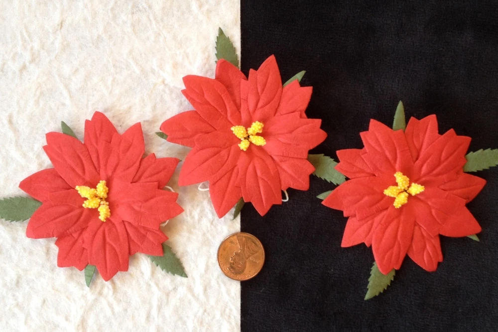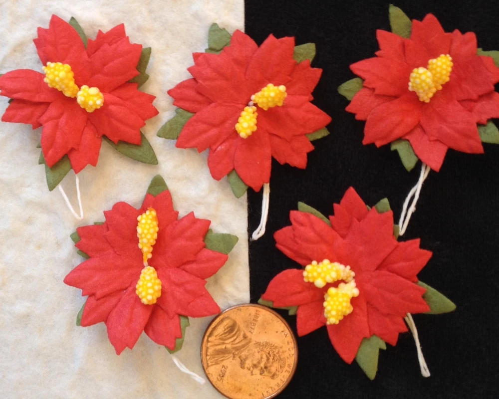 This listing is for 10 large, red mulberry paper Poinsettias. The pollen is three dimensional. These beautiful, winter flowers are approximately 2 1/2" (63 mm) in diameter not including the leaves. There is a short loop on the back for easy attachment to your project. These will be wonderful for embellishing your holiday cards, tags, gift bags, and packages. These are available in a smaller red (Photo 5), white, yellow and variety pack(Photo 6). See my store, Mulberry Bear 2. Powered by eBay Turbo Lister The free listing tool. List your items fast and easy and manage your active items.