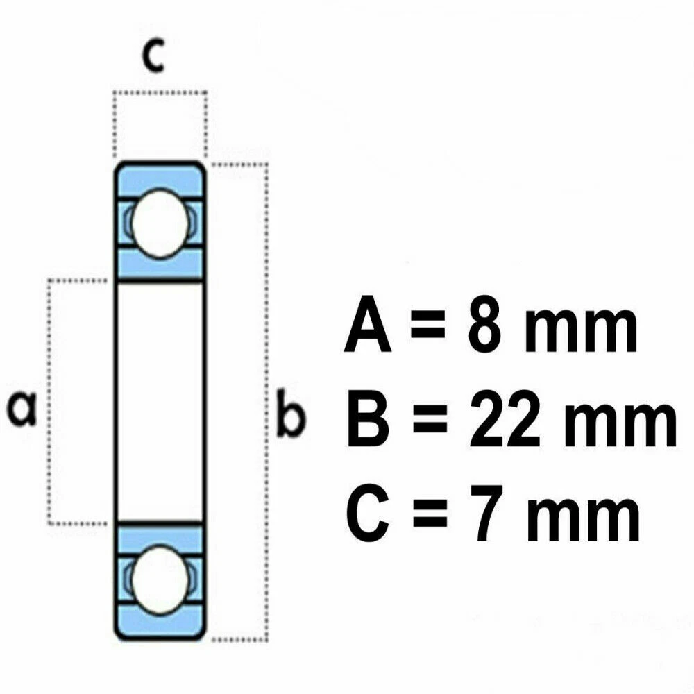 S peifcation: Model: 608 ZZ Quantity per Package: 10 Pcs Material: Chrome Steel Protection: Metal Shield on both sides Greased / Lubricated: Yes Bore (Inner) Diameter: 8 mm Outer Diameter: 22 mm Width (Thickness): 7 mm Supported Revolutions per Minute (RPM): 34,000 Features: 608ZZ (8x22x7) is a single-row bearing that supports radial loads, made with Chromium Steel providing superior quality and durability. It comes pre-lubricated and shielded to keep the lubricant in and contaminants, dirt and debris out. Suitable to use in skat eboards, longboards, inline skate, scooter, fidget spinner, motor application and industrial machinery. Package Included: 10 x 608-ZZ B ea rin gs Payment & Shipping & Handling ● Item will be shipped within 24 hours after full payment is received(NOT counting holidays or weekends) Return policy ● If you need return, please contact our customer service representative, let us know the detailed problem. ● Please email us before leaving any negative feedback or open any dispute on PayPal. C ontact us ● If you are satisfied with the product you received,please leave us positive feedback and 5 scores DSR. ● Please give us the opportunity to resolve any problem. We understand the concerns and frustrations you might have, and will try our best to resolve the issues. ● We care about our valued customers, and will always try to help you. So if you have any problems, please e-mail us immediately.