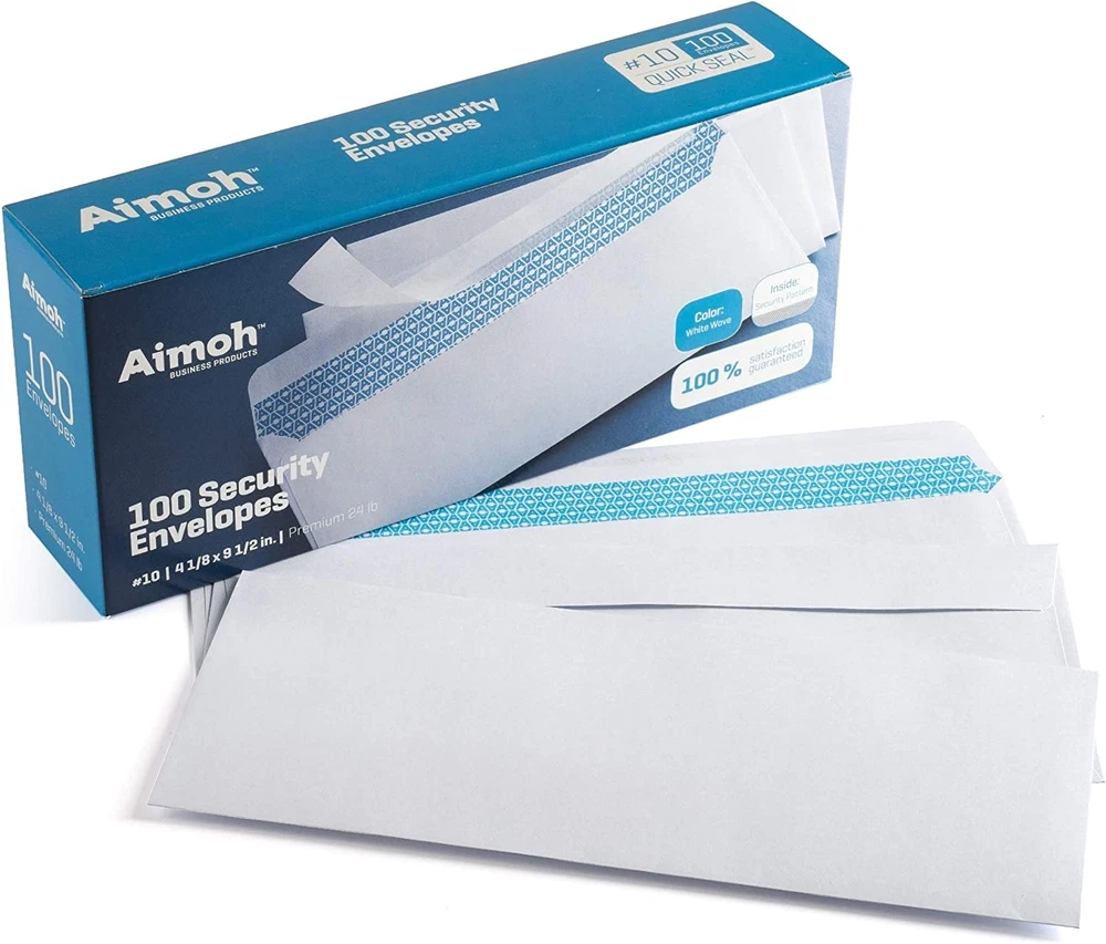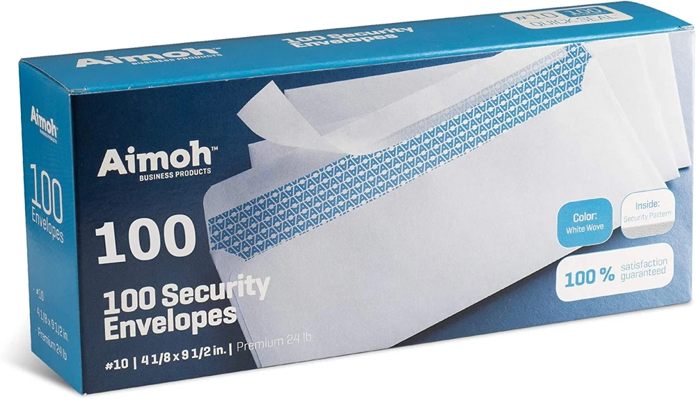 ✉️ 100 ENVELOPE PACK; these envelopes are manufactured with a WINDOW-LESS front panel for the perfect choice for small businesses, home offices and everyday use, #10 Security Envelopes are provided in a 100-envelope pack ✉️ SUPER SECURITY TINT PATTERN; #10 envelopes designed with a secure, security tint-pattern to protect contents and sensitive information, perfect for ultra-secure mailing ✉️ QUICK-SEAL CLOSURE; our #10 envelopes are designed with an ultra strong SELF-SEAL adhesive strip to create a full, super secure seal across each envelope's width that won't easily open or tear, ideal for mailing for any letter sized and larger documents without splitting ✉️ LASER AND INKJET PRINTER COMPATIBLE; premium construction measuring 4-1/8 x 9-1/2 inches, fully compatible with most inkjet and laser printers for quick and easy addressing! Click the Orange Button to order now Product Description PREMIUM SECURITY TINTED PATTERN; our check envelopes are designed with a premium security printed design to protect contents and sensitive information, perfect for secure business & legal mailing QUICK-SEAL CLOSURE; our check envelopes are designed with an ultra strong SELF-SEAL adhesive strip to create a full, super secure seal across each envelope's width that won't easily open or tear EnveGuard Technology in today's world where our health, privacy and security is so much threatened, the team of engineers and developers at Aimoh have researched and developed the EnveGuard Technology and Approval systems, at Aimoh we approve only the highest quality products, produced from the best and safest material on earth. Heavyweight extra white sturdy wove stock paper Manufactured from heavyweight extra white sturdy wove stock paper, combining a professional security tint pattern and smooth finish
