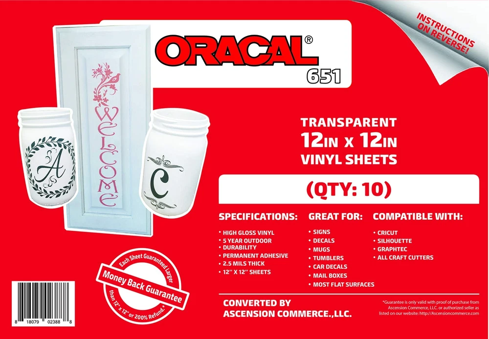 High quality Oracal 651 Craft Vinyl Sheets Perfect for Crafting Oracal 651 vinyl is perfect for your crafting needs. Oracal film is compatible with all craft cutters, including the Cricut, Silhouette, Xyron, Craft ROBO, Graphtec, and more. It is a intermediate calendared vinyl, measuring at 2.5 mils in thickness. Manufactured in the United States, this is a high quality vinyl with consistent results. Easy to weed and durable, Oracal 651 is ideal for use on tumblers, window decals, car decals, signs, stencils, scrapbooking, or any other permanent application with a semi-smooth surface. The repositionable, pressure-sensitive adhesive means the media can be moved during a dry application and lightly repositioned it until it's just right. This Transparent vinyl has a gloss finish that truly stands out from the competition. Features Ships flat with a cardboard stiffening insert Includes full color instruction sheets Finish: Glossy Rated for 5 years outdoor durability Waterproof Handwash safe Compatible with all craft cutters: Cricut, Silhouette, Xyron, Craft ROBO, Graphtec, and more Adhesive: Solvent-based, Permanent Sheet Size: 12" x 12" Number of Sheets: 10 Compatible with all craft cutters including, but not limited to: Cricut, Silhouette, Xyron, Craft ROBO, Graphtec, Quickutz, Inspirations, and Pazzles brand machines This pack comes with 10 sheets of genuine vinyl Vibrant Transparent color - A high gloss finish that stands out Perfect for use on home décor, tumblers, stencils, scrapbooking, signs, letters, banners, car decals, window graphics, and more